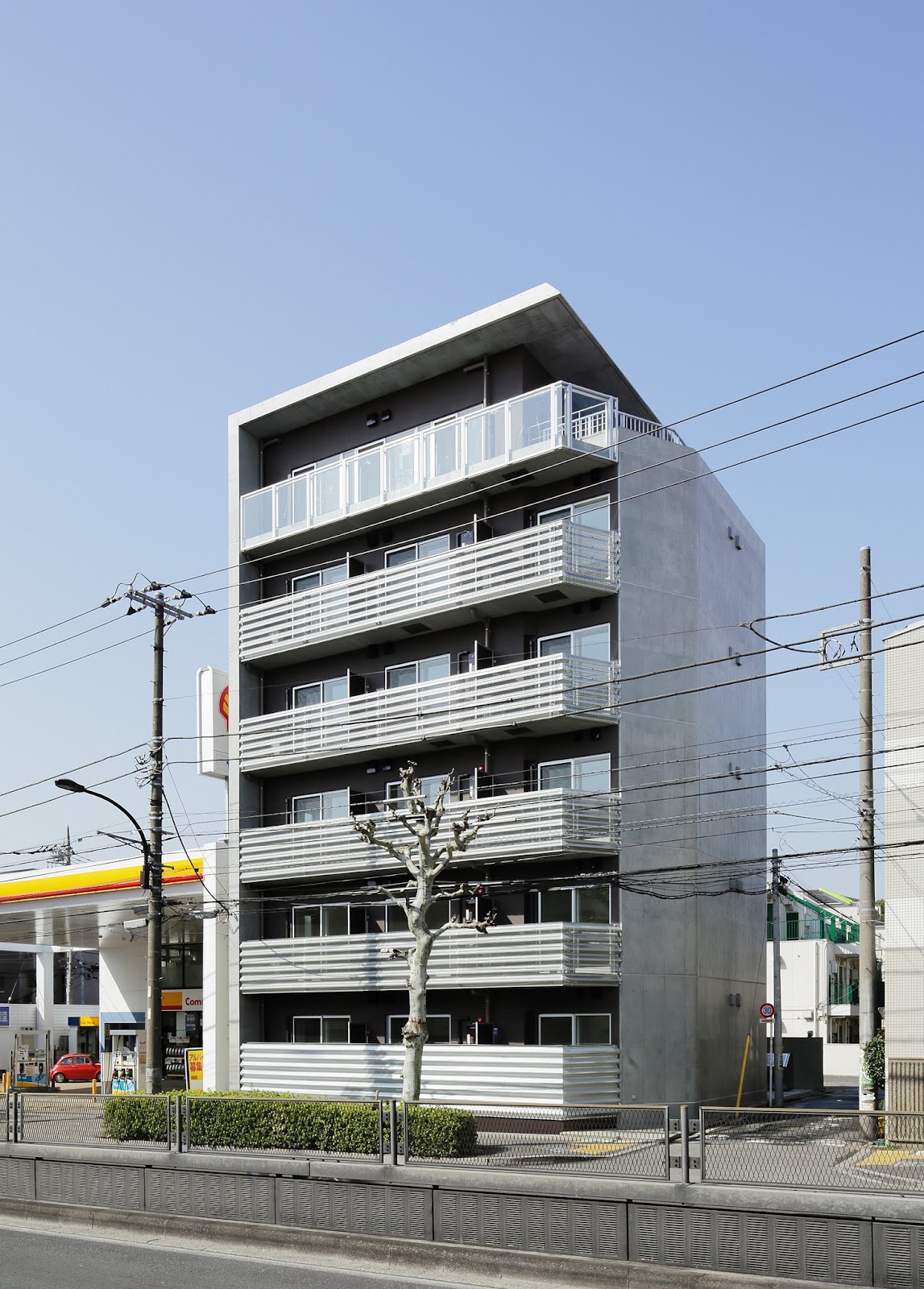 竣工:2013.2敷地は管状7号線に面する都内でも交通量の多い地域。後背地に低層の住居地域が拡がる敷地条件のため、建物の形態が主に日影規制により決定されている。建物はダークブラウン壁面部分をコンクリート打ち放しの壁がつつみ込むような形態をとり、手摺に有孔折版を設けている。有孔折版は地上に近い階から上階になるにつれ開口率を上げ、プライバシーの確保と部屋内からの開放性の両立を意図した。2013-04-15
