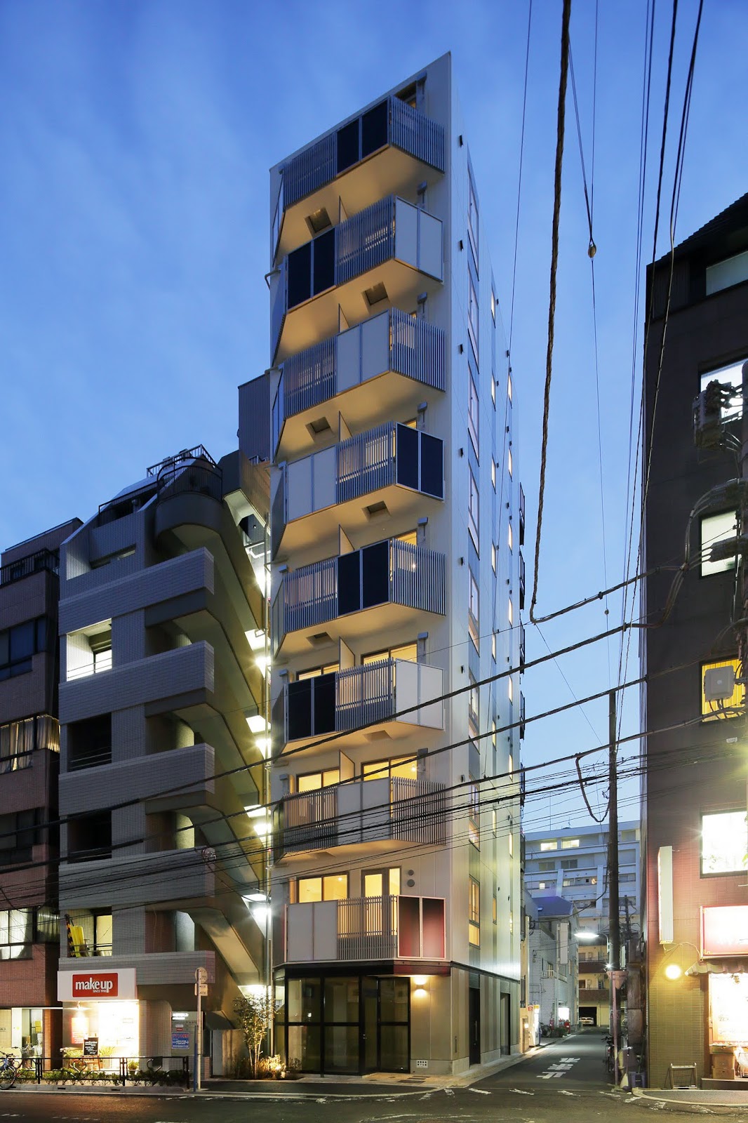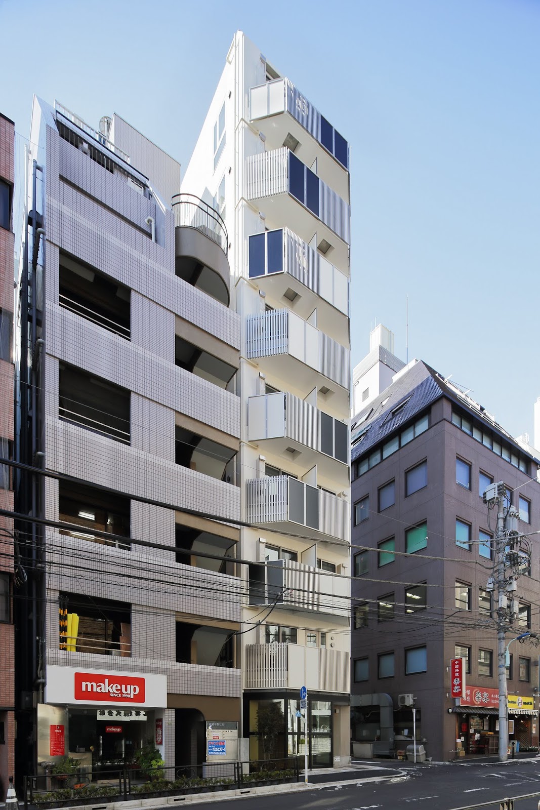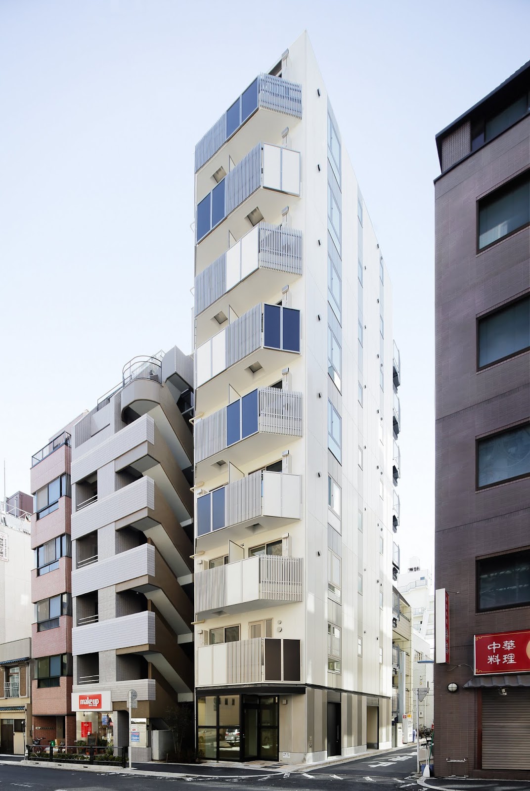 竣工:2014.2計画地は、歴史ある古い街並みと、現代の商業地が融合した立地にある。狭小間口の敷地に最大限のボリュームを設定したとう塔状の9階建となっている。外観は、千鳥状に素材が織り成すリズミカルな表情とし、外観のモノトーン基調と対照的に、内部は各住戸にアクセントカラーを用いたインテリアとしている。
