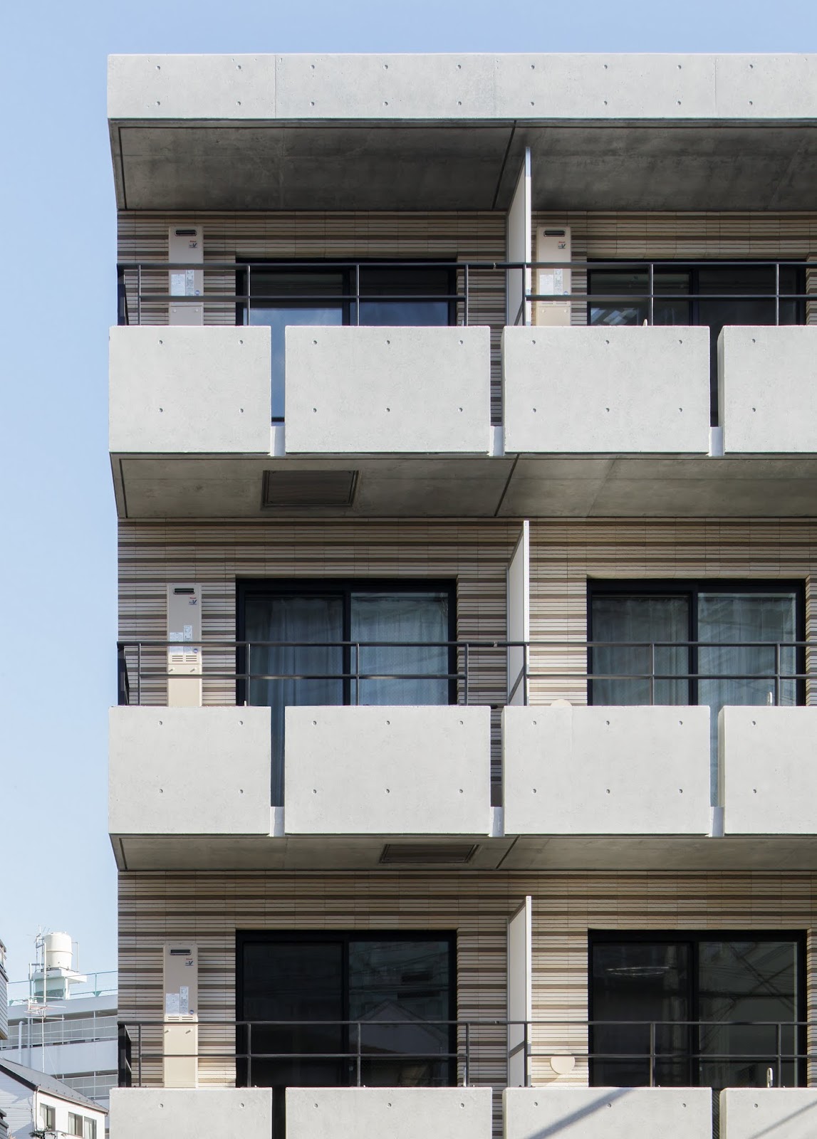竣工:2015.1地下と1Fにテナントを持つ共同住宅の計画。建物の容積を最大限確保するために1階が半地下となっている。歴史ある住宅地であるこの地におけるコンセプトとして、「織(しき)」という言葉を導きだした。その意味するところは、伝統工芸品のような素材が織りなす奥深さを表現すること。数種類のタイルを混合した壁面とコンクリートの打ち放し面が紡ぎ合うようなファサードを意図している。