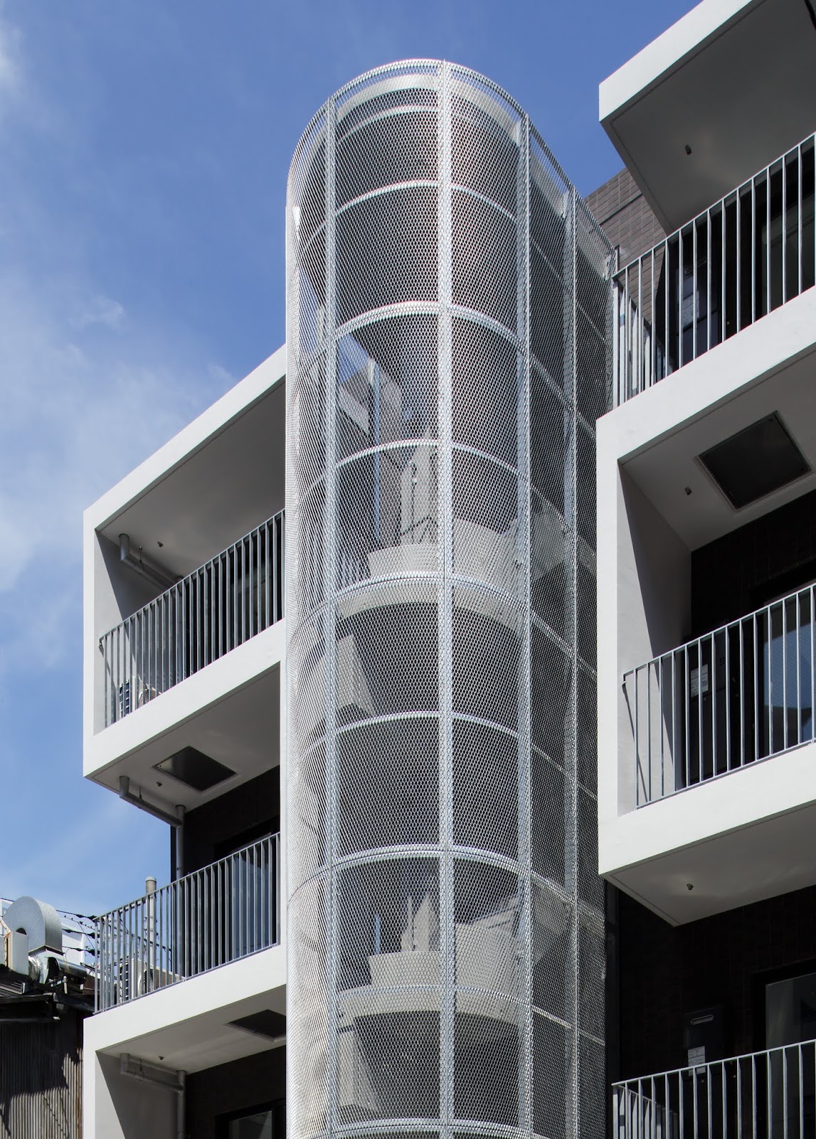 竣工:2015.7共同住宅は、暮らすための専有スペースと階段、エレベータ、設備配管スペース 等の共用スペースによって構成されている。本来は脇役であるこの共用スペース を建物の中心に据え、ファサードを構成する重要な要素として位置づけている。 このような計画は、今回のような狭小敷地の場合には土地利用の効率化にも寄与 している。投資型建築の場合、効率性能の向上は欠かせない要素であるが、単な る効率主義に陥らない計画を心がけた。