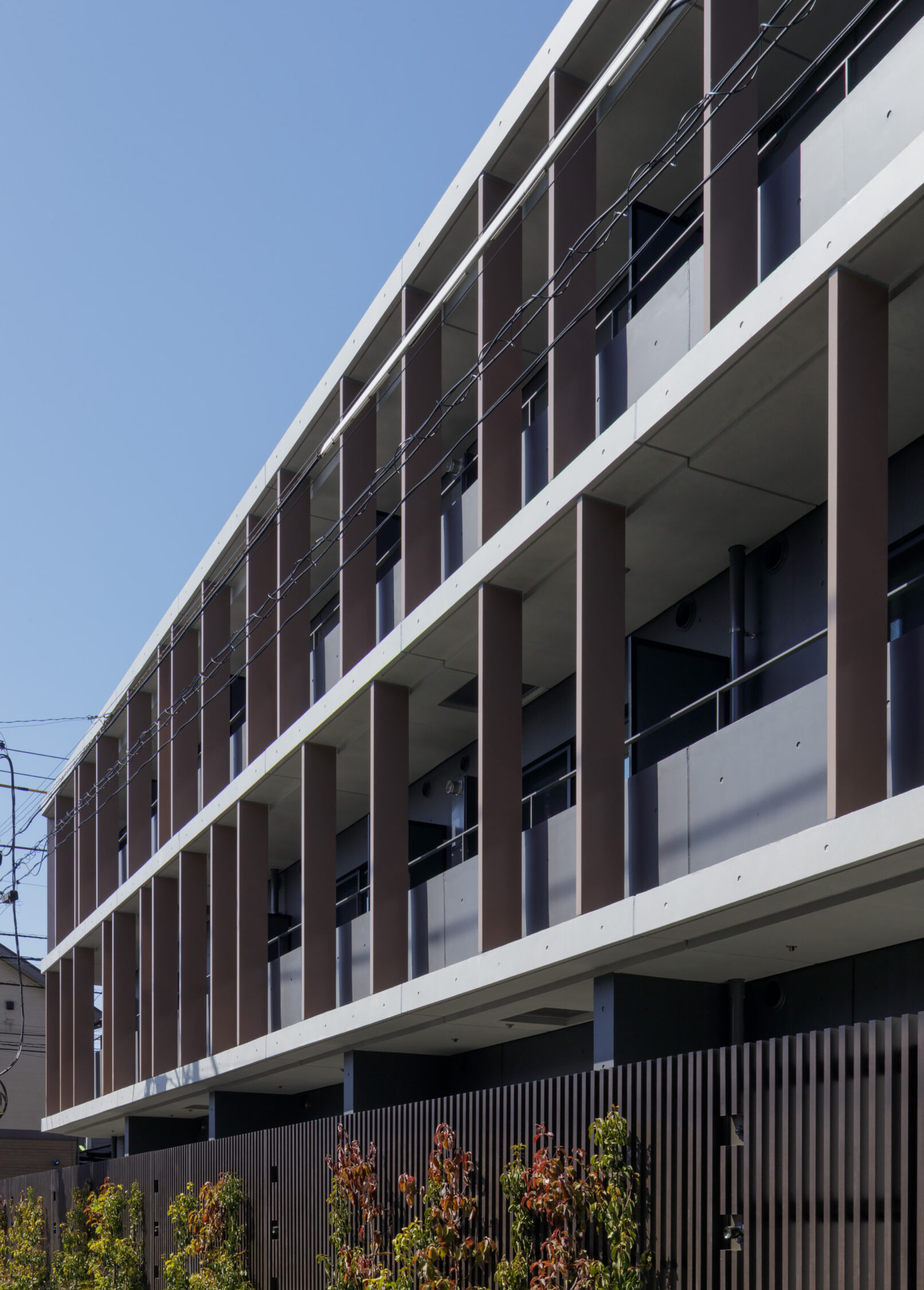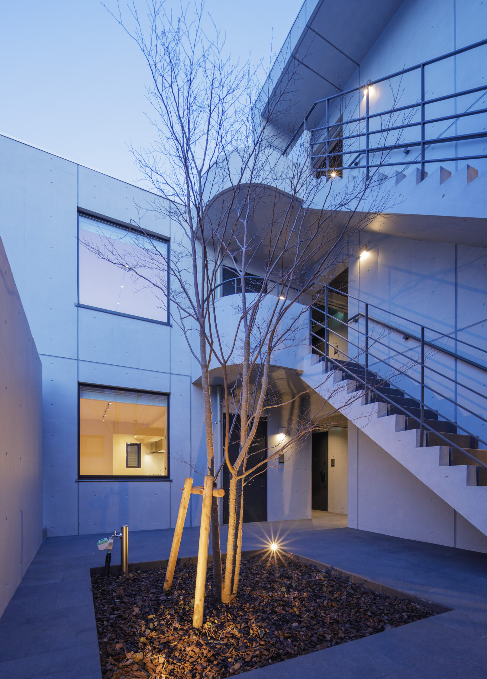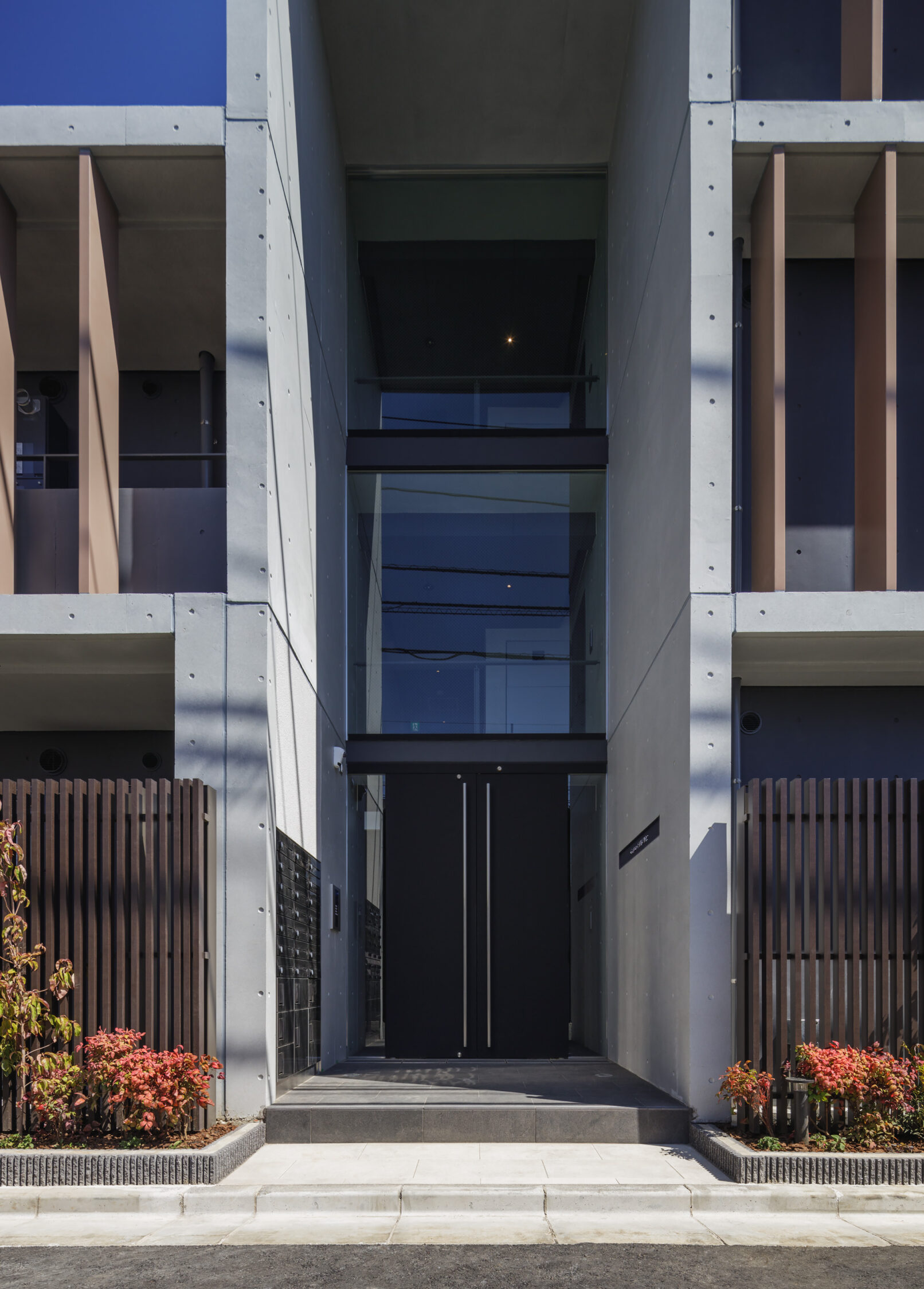 - 共同住宅の設計において、バルコニーは様々な機能、役割が求められる。避難ルートであり、設備設置空間であり、内部と外部をつなぐ中間領域でもあり、重要なデザイン要素として機能する。プライバシーを確保すると共に、採光や通風を得るための開口部を設ける必要もあり、矛盾する要素を考慮する必要があり、特に低層階においては道路からの見え方には配慮が必要となる。そのようなバルコニーデザインの解として、1Fは緑化+ルーバーフェンス、2,3Fはセメント板ルーバーを設置し、ルーバーという膜で建物を包み込んだ。ルーバーの膜に切り込みを入れるように3層高のエントランスを設け、住戸は中庭(パティオ)を囲む形で配置している。敷地の奥まった位置に設けられた住戸においても、室内からパティオのシンボルツリーを眺められるように計画し、すべての住戸の環境をより豊かにする事を目指している。