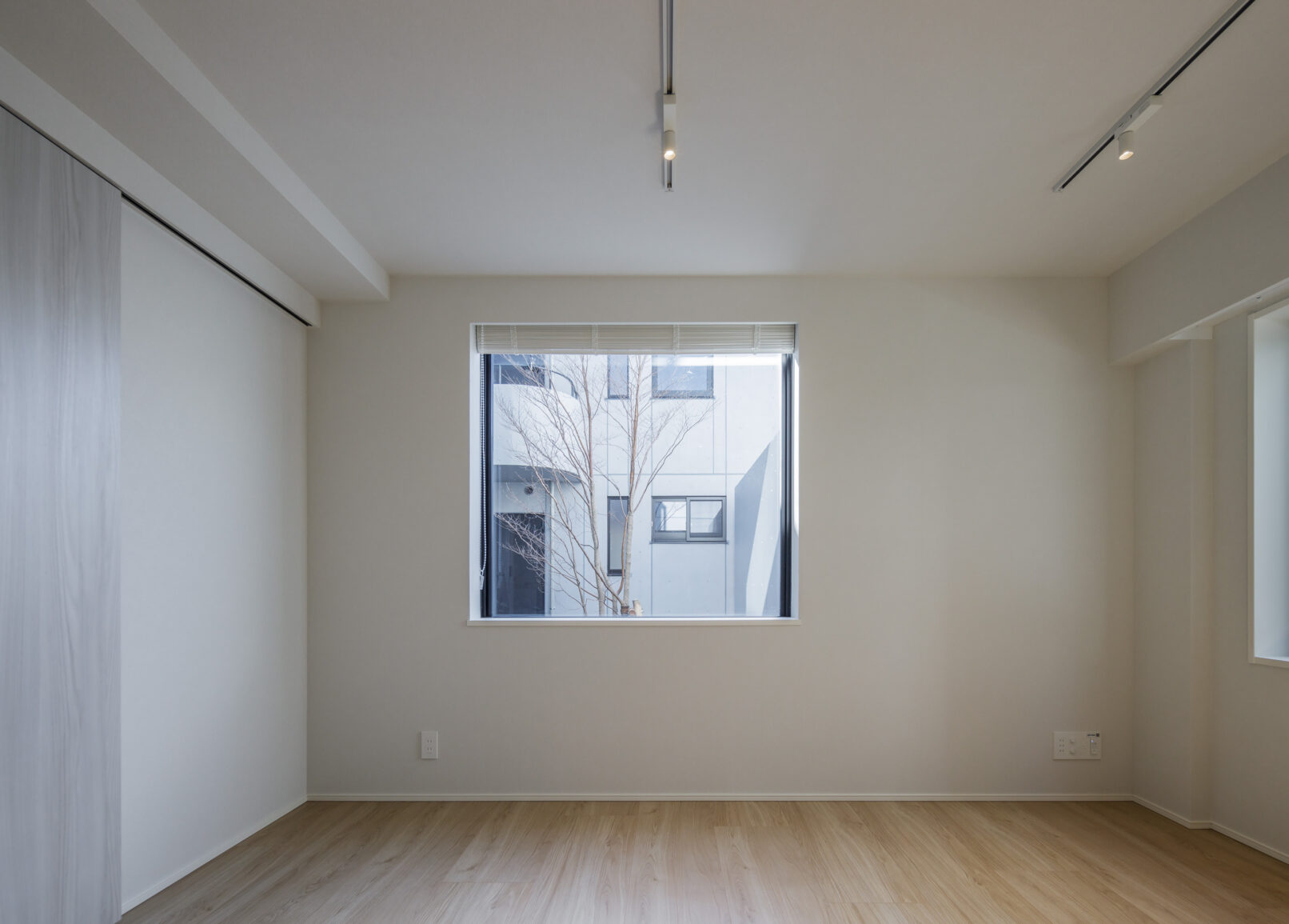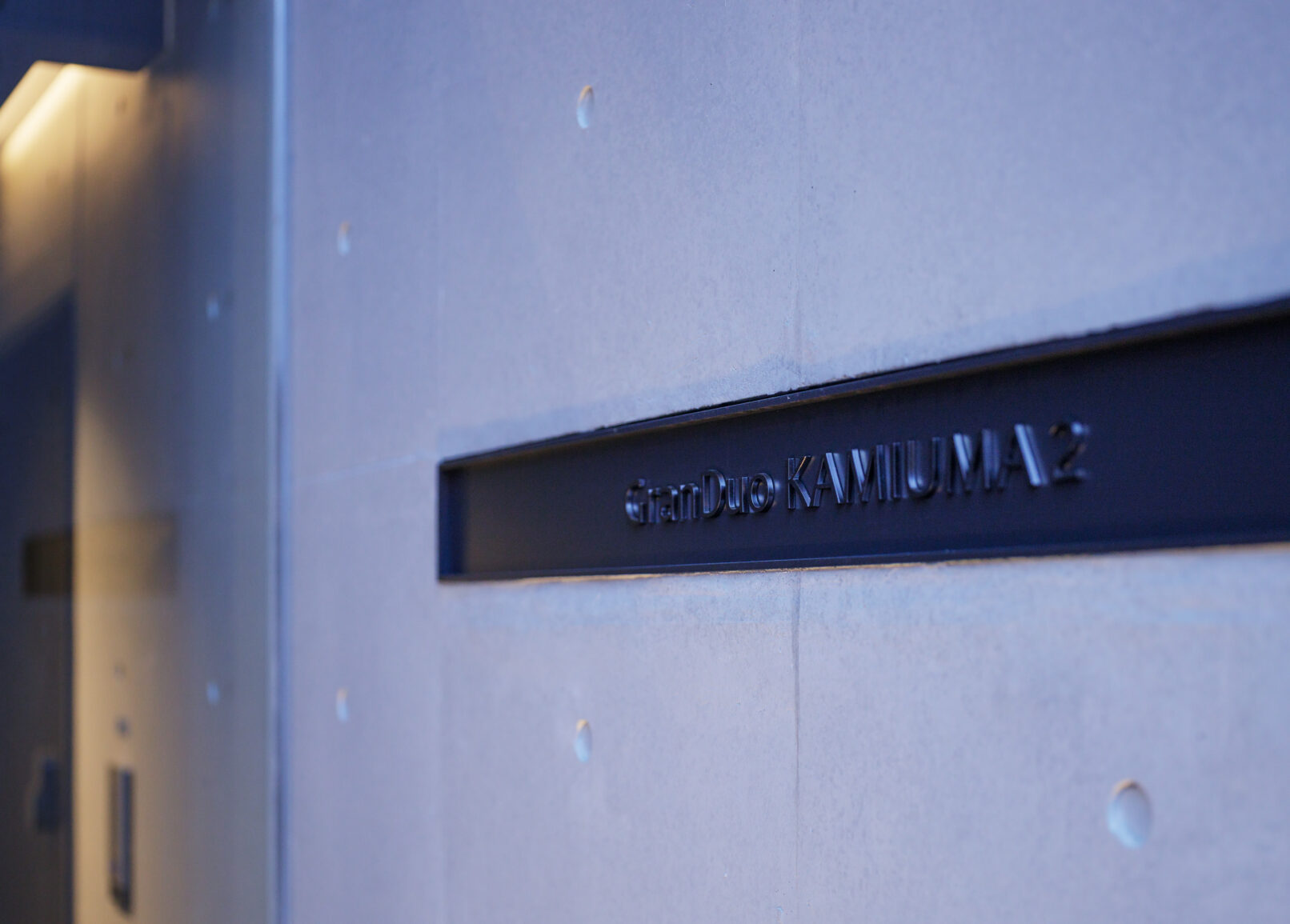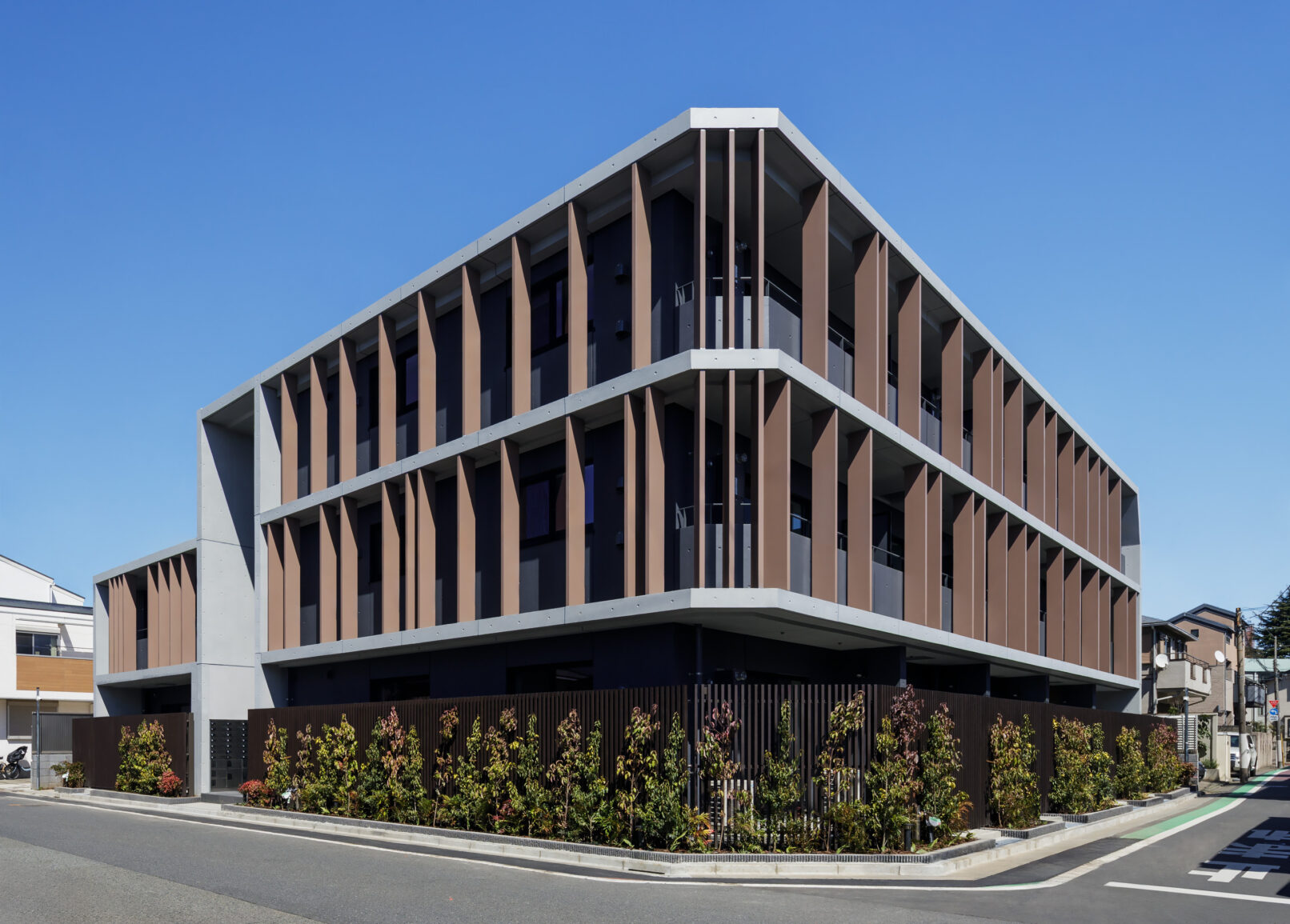 - 共同住宅の設計において、バルコニーは様々な機能、役割が求められる。避難ルートであり、設備設置空間であり、内部と外部をつなぐ中間領域でもあり、重要なデザイン要素として機能する。プライバシーを確保すると共に、採光や通風を得るための開口部を設ける必要もあり、矛盾する要素を考慮する必要があり、特に低層階においては道路からの見え方には配慮が必要となる。そのようなバルコニーデザインの解として、1Fは緑化+ルーバーフェンス、2,3Fはセメント板ルーバーを設置し、ルーバーという膜で建物を包み込んだ。ルーバーの膜に切り込みを入れるように3層高のエントランスを設け、住戸は中庭(パティオ)を囲む形で配置している。敷地の奥まった位置に設けられた住戸においても、室内からパティオのシンボルツリーを眺められるように計画し、すべての住戸の環境をより豊かにする事を目指している。