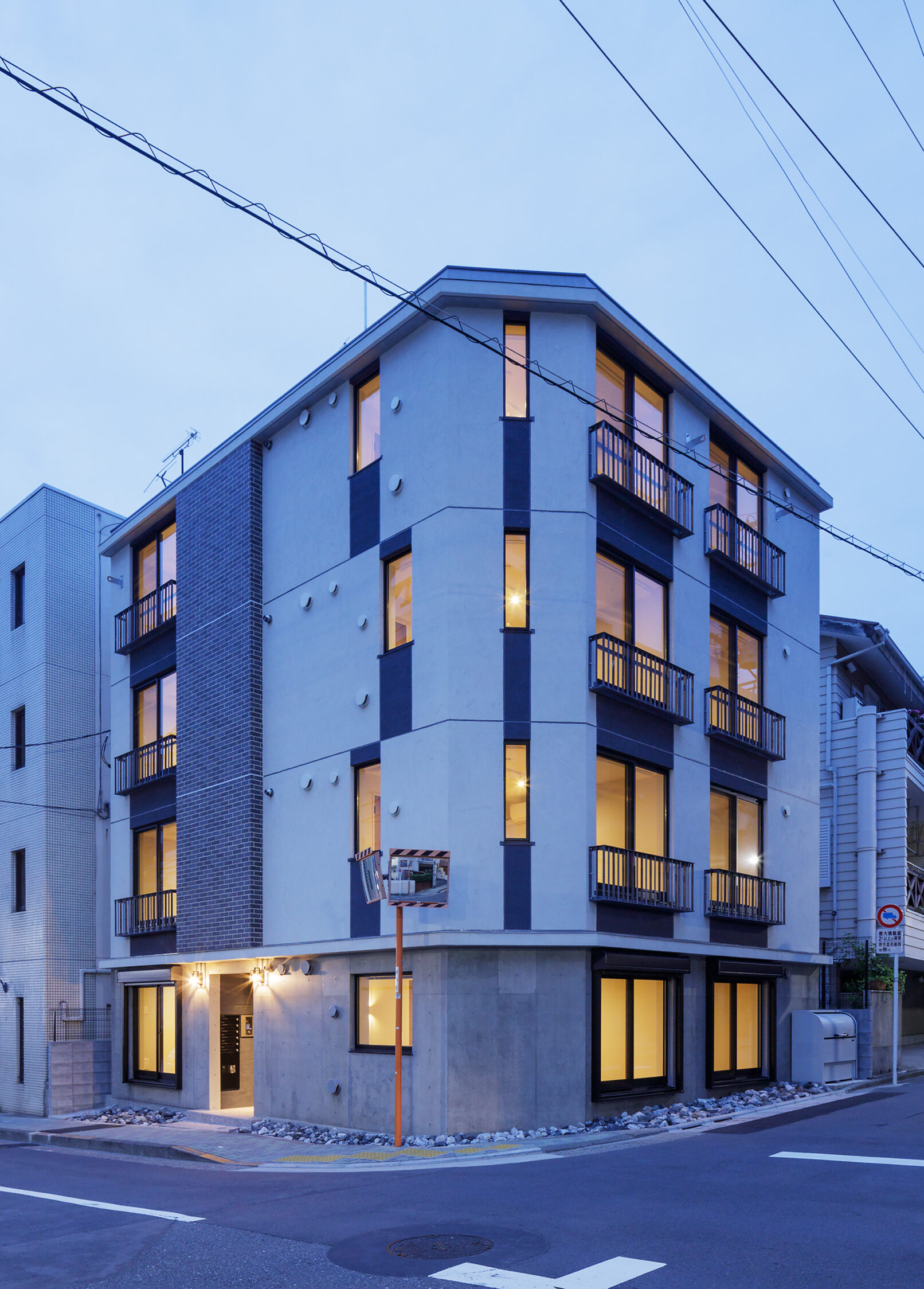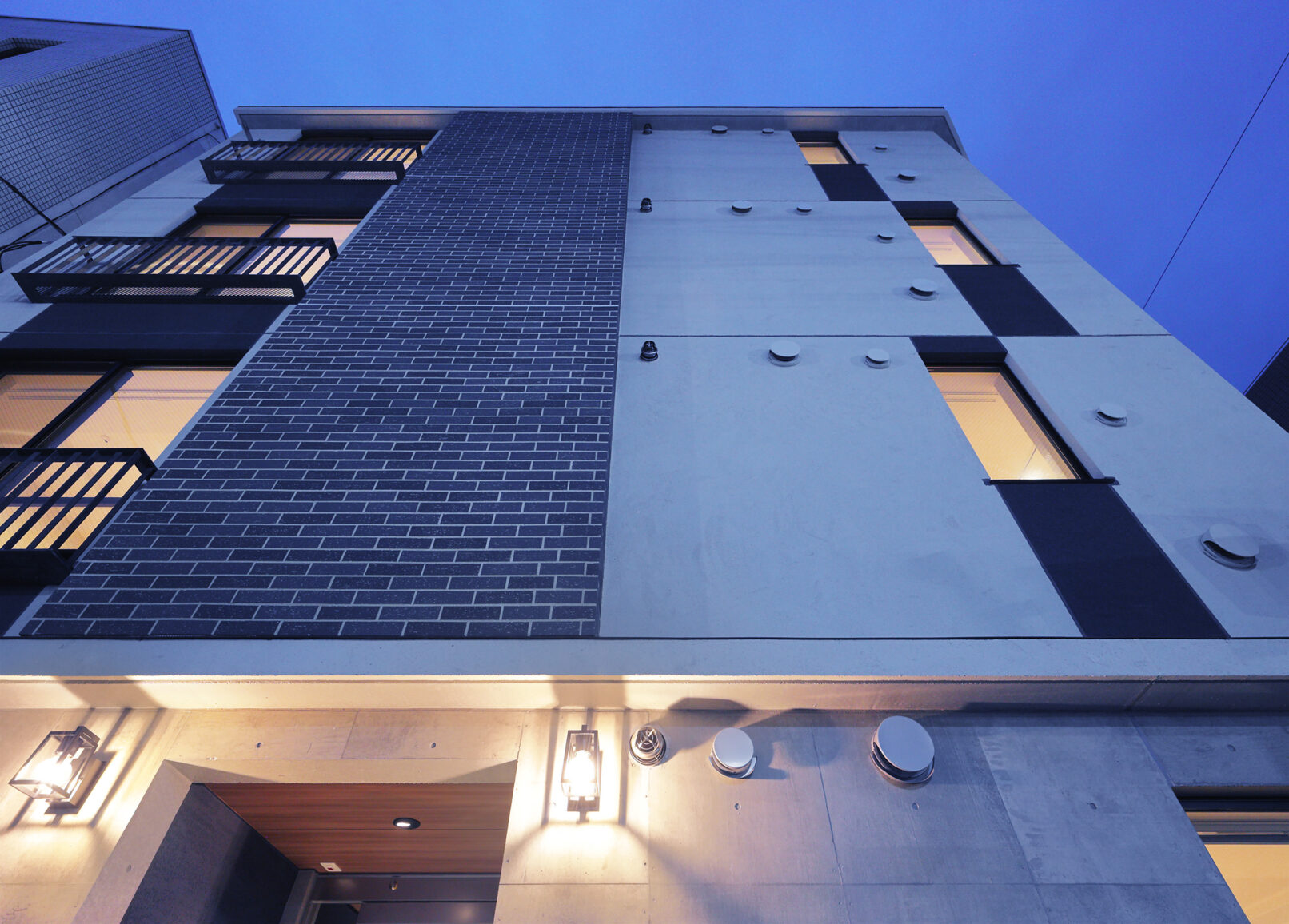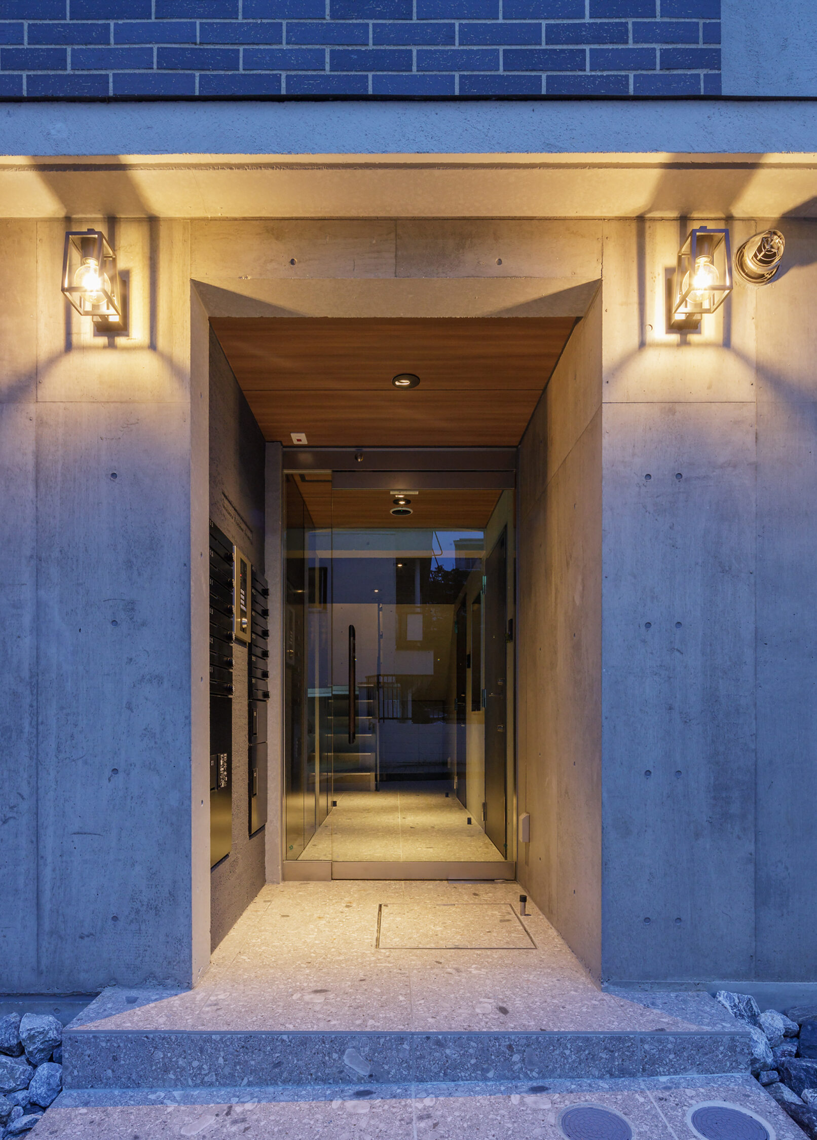 • 本計画は、この街並みの構成に相応しい「花台」「左官壁」「せっ器質タイル」「合板型枠のコンクリート打放し」という有機的な要素を抽出し、現代風にアレンジして風景に溶け込むデザインを試みた。