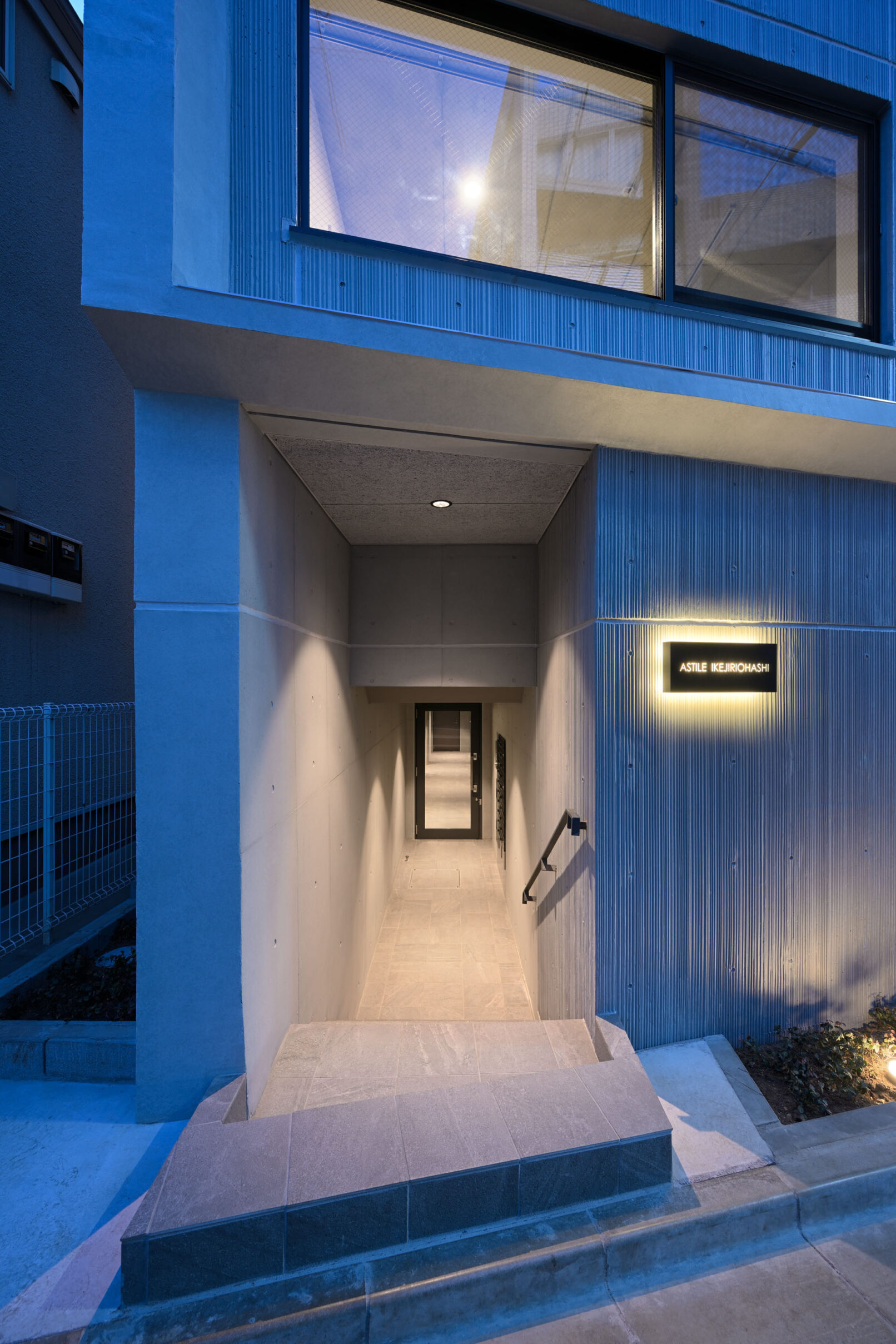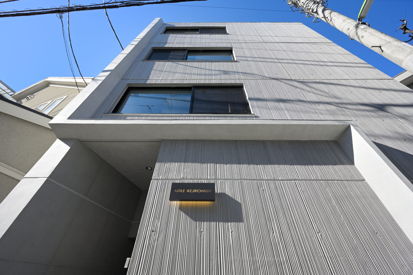 - 敷地内には前面道路へ至る避難通路を確保しているため建物間口が狭く、道路からは建物全景を望むことができない。そこで道路に面する部分をリブ状の特殊型枠を使用したRC打放し壁として印象的なファサードを形成することで、街と建物を繋ぐことを試みた。