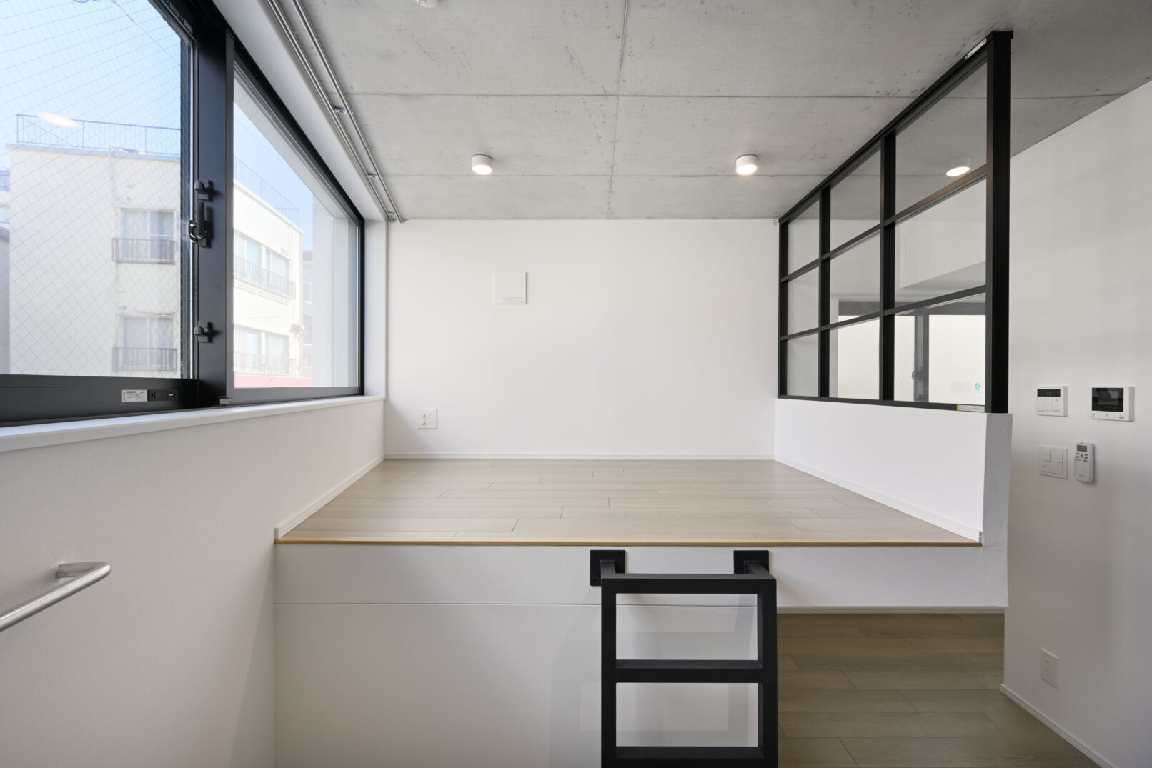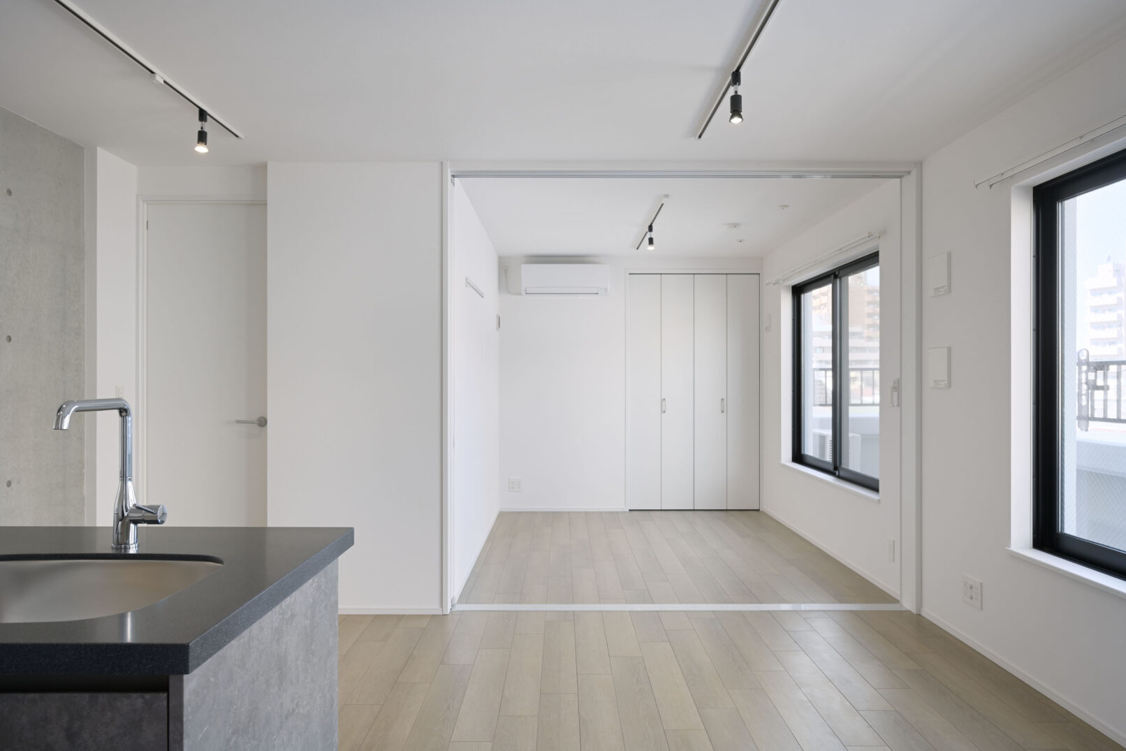 - 内部は総戸数19戸に対しで11タイプのプランを設け、単身向け14戸、夫婦向けを5戸設けたことで、様々なライフスタイルと家族構成にも柔軟に対応できる構成となっている。各住戸は開口部を広くとり、北向き住戸でも採光の採れる明るい環境となるよう計画した。