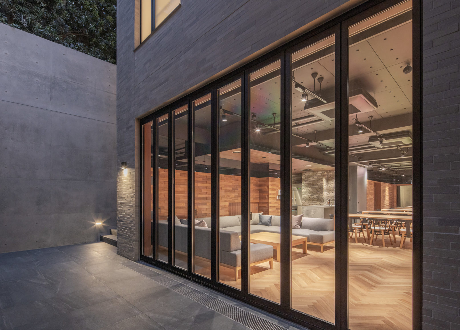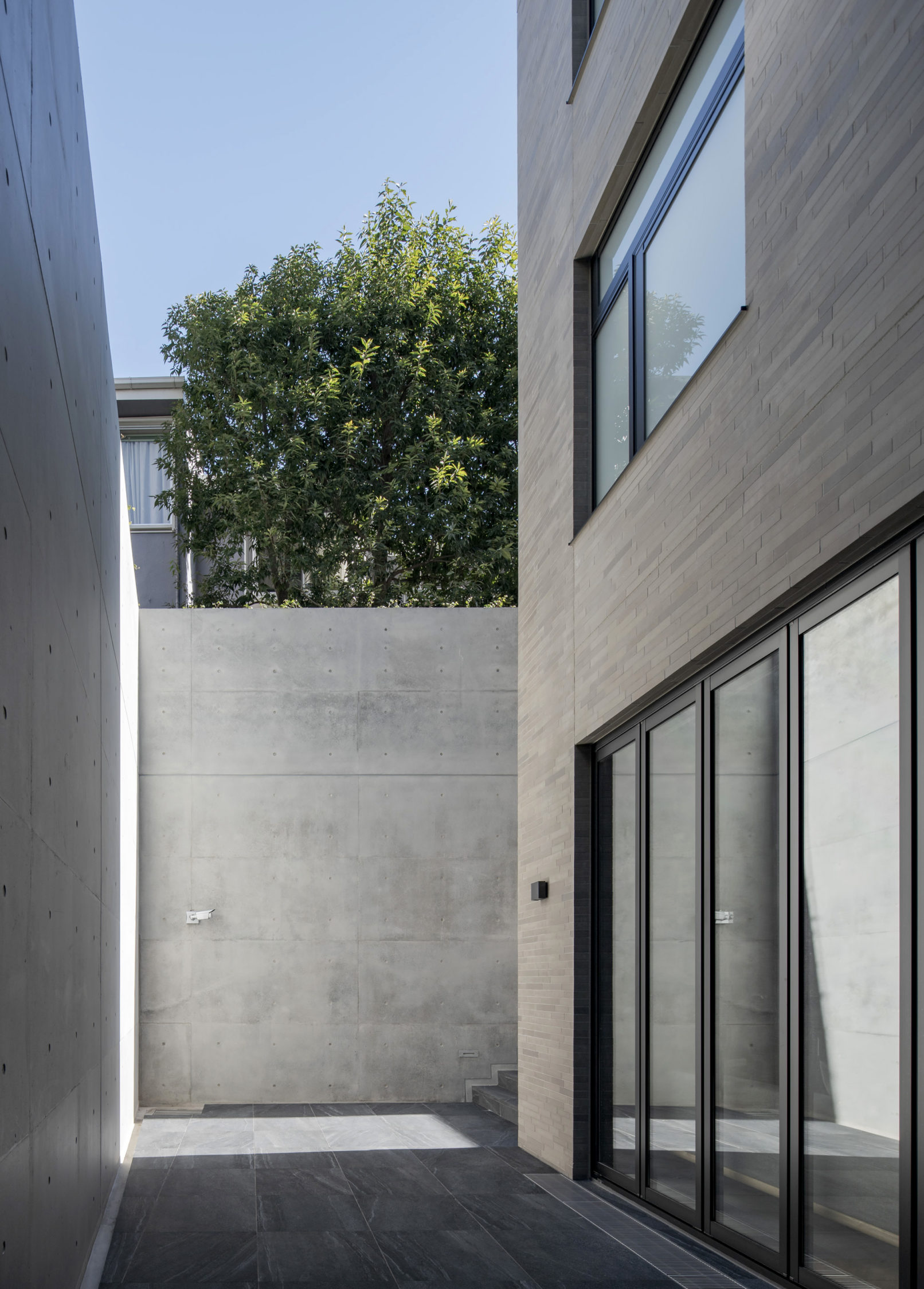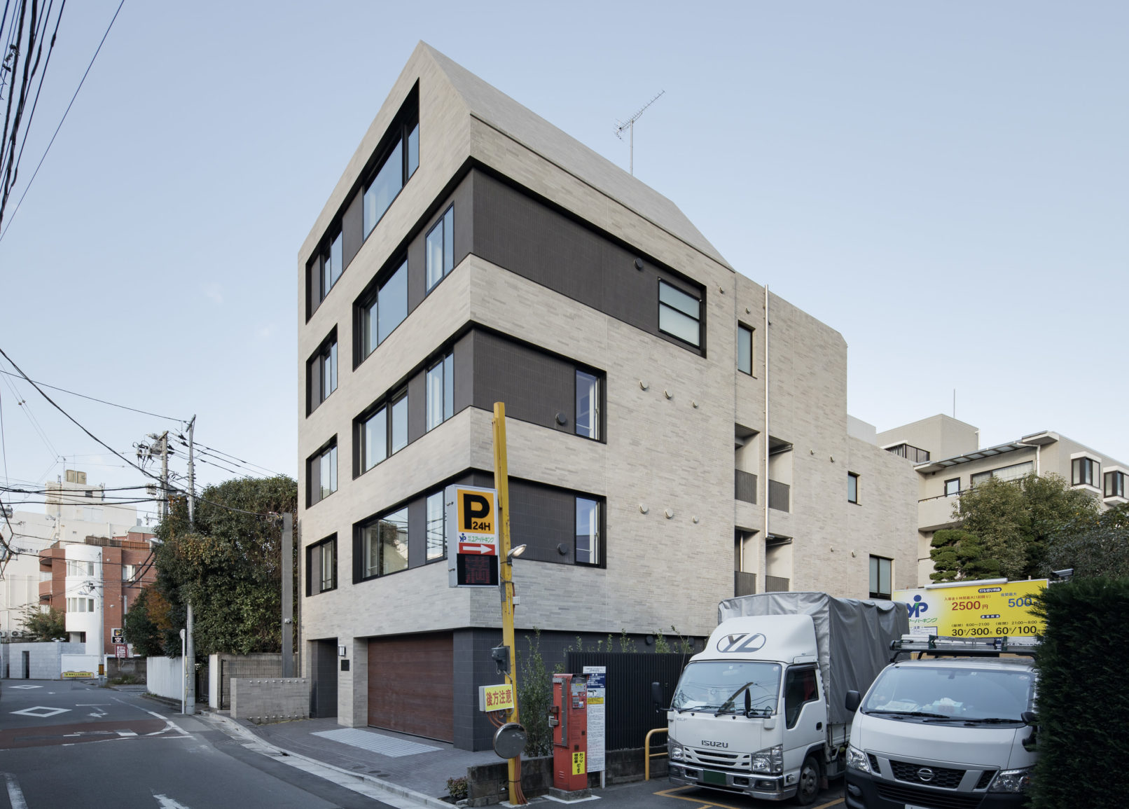 - 計画地は代々木上原の閑静な住宅街に位置している。建物のプログラムはオーナー専用住戸1戸と賃貸住戸9戸、そして地下にオーナー用の施設を備えた複合的施設の構築であった。異なる利用目的、異なる利用者の動線計画と言う異なる要素をデザイン的に纏めることが設計上のテーマとなった。様々な要素をまとめ上げる手法として、建物全体を通じたテーマカラーを設定し、あらゆる素材をテーマカラーに沿って選択していくこととした。