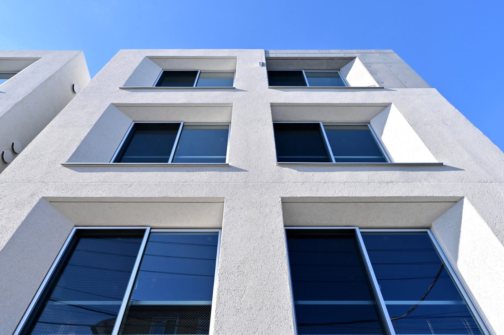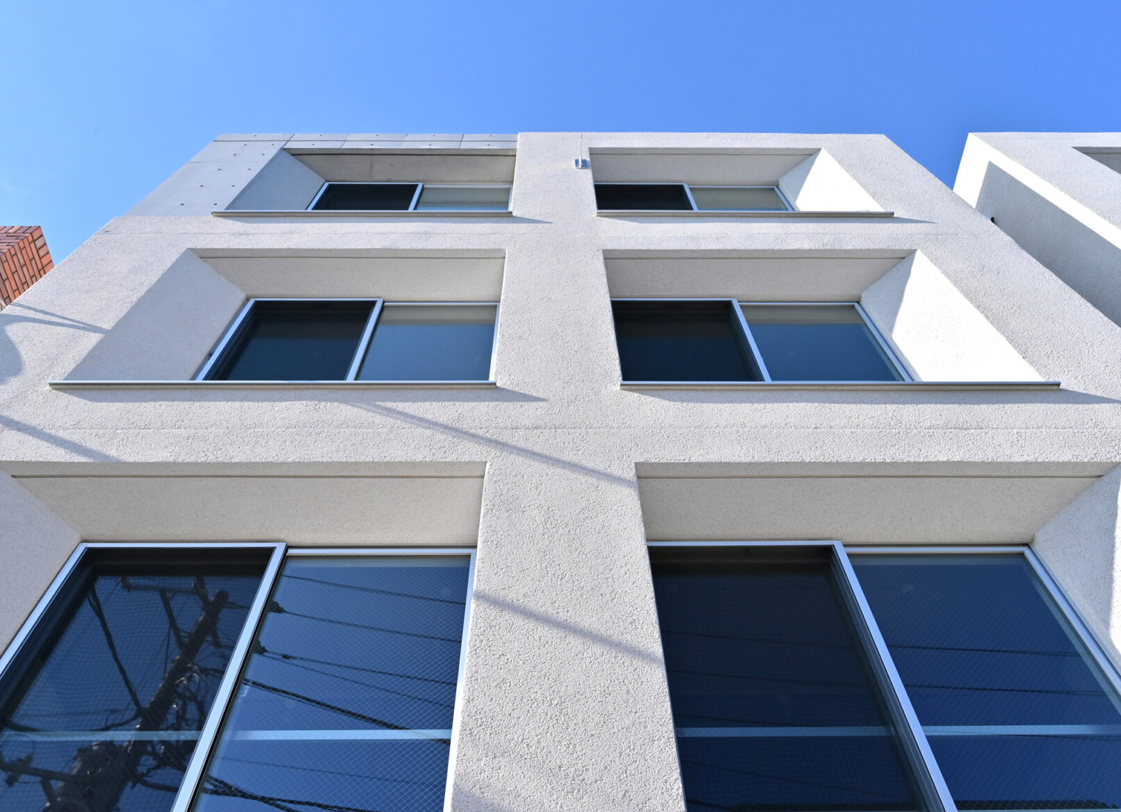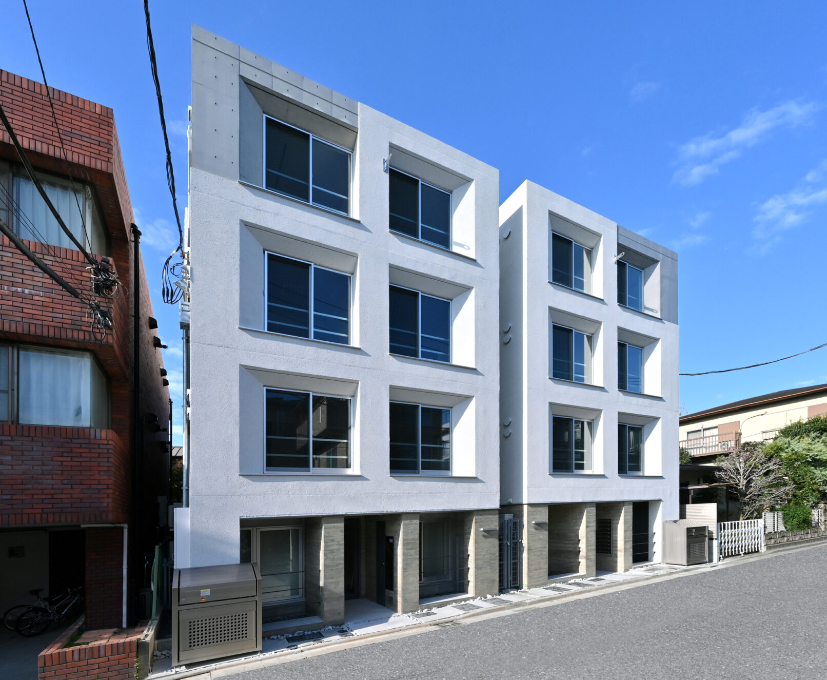 - 4層目の隣地を分節(テクスチャ―操作)によりボリューム感を抑え、2棟建ての特性を活かし左右対称形状とすることでエントランス階の幅の連続性をもたせた。また構造躯体の壁厚を利用し、窓に奥行きを与え部分的にテーパーを設け強調することで、ファサードにも特徴をもたせて印象深いものとした。外壁色は周辺の緑が映えるよう白を基調としている。