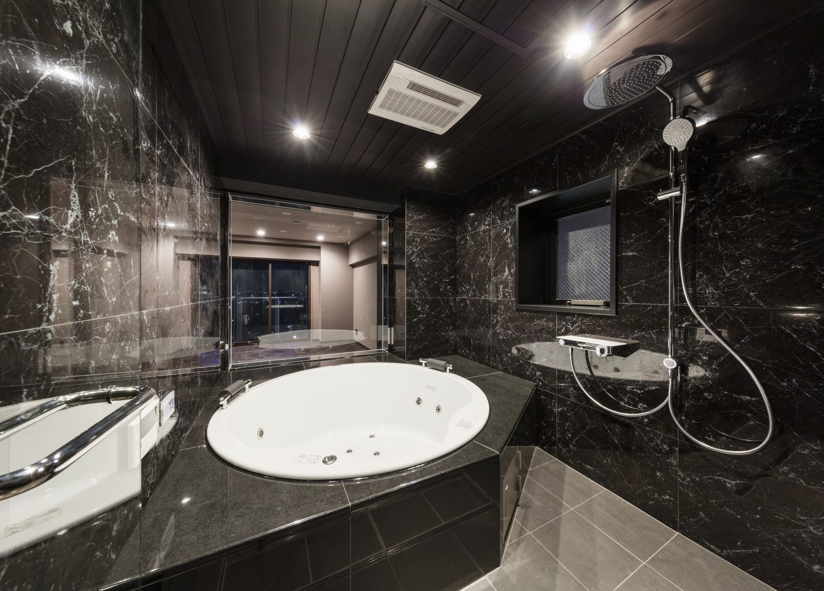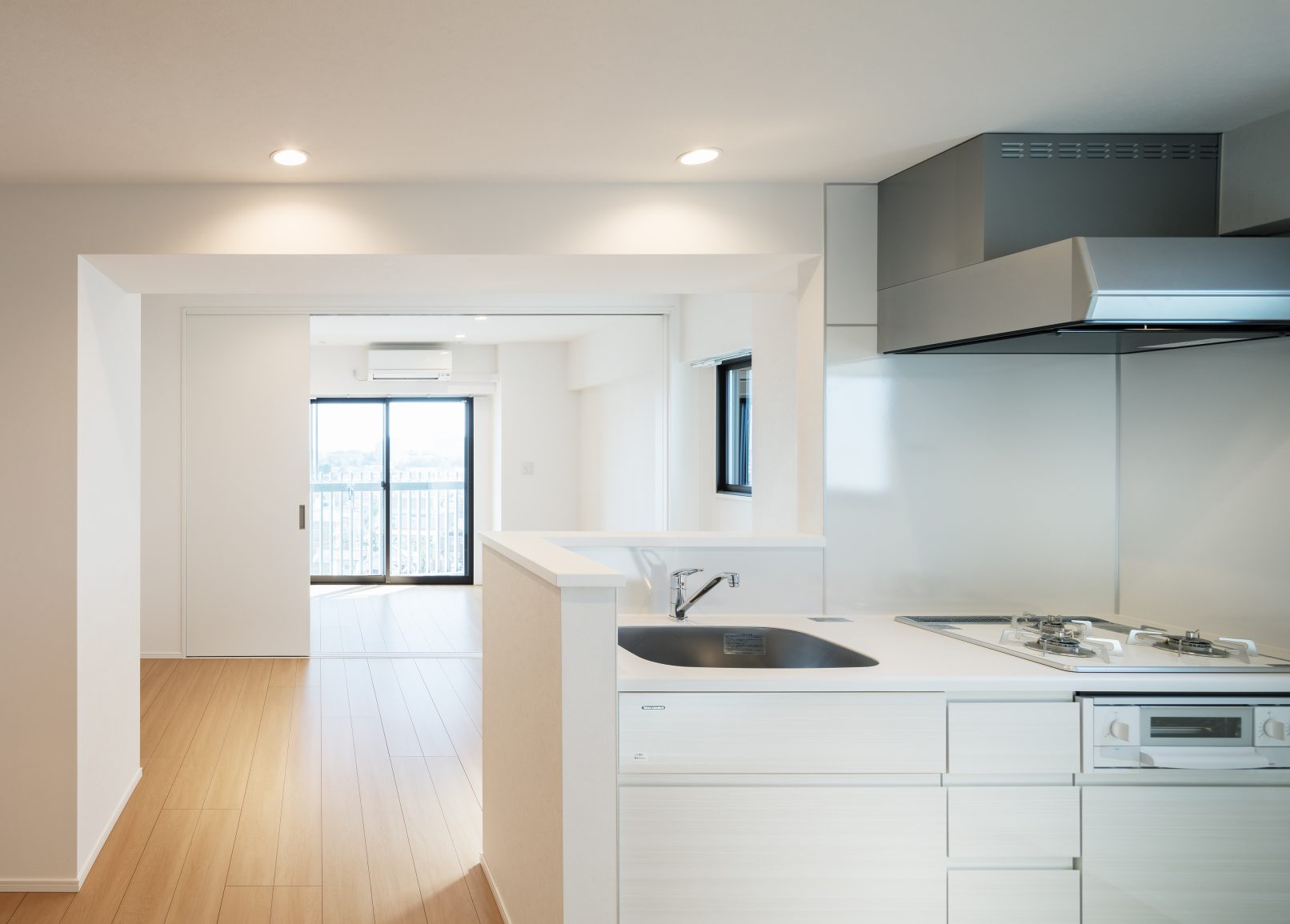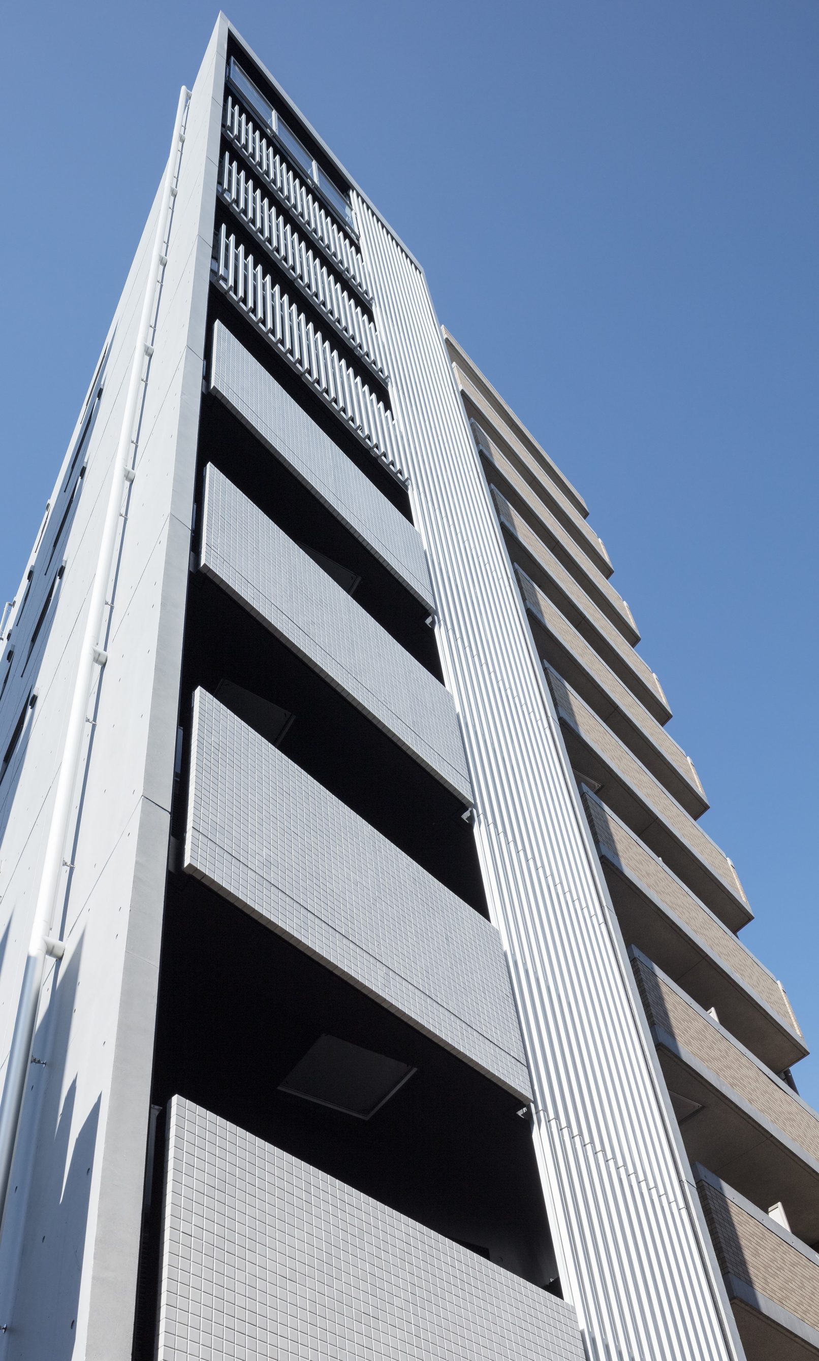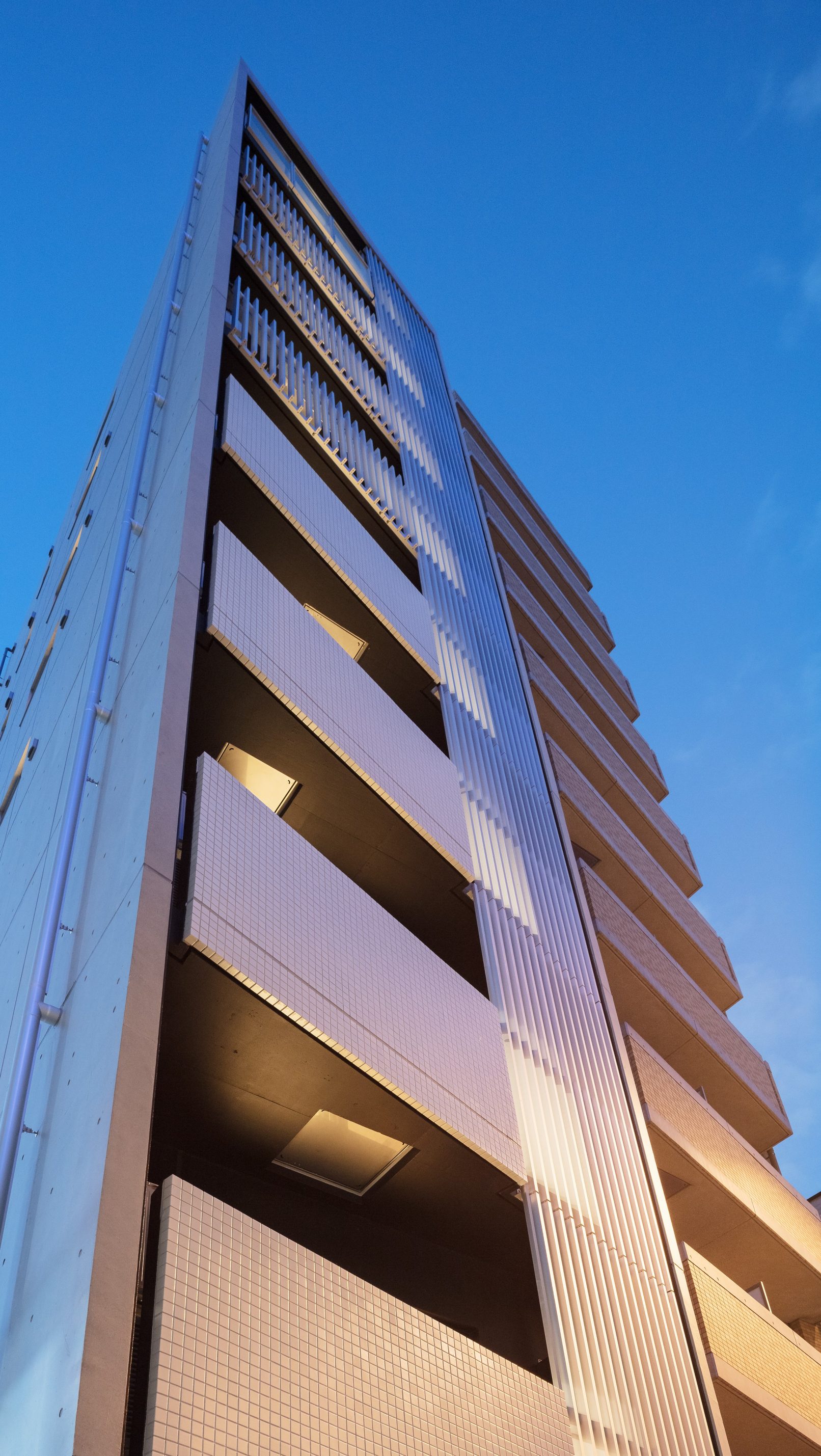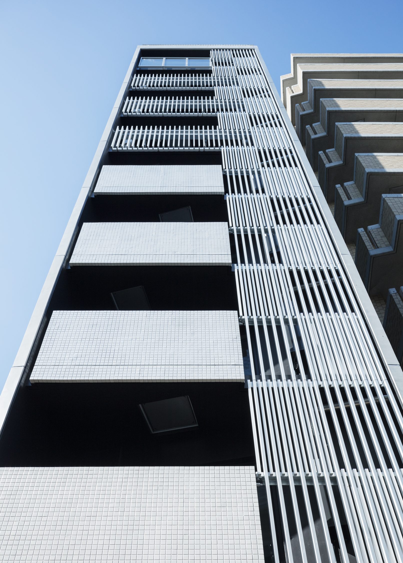 - 計画地は、国道246号、首都高速3号渋谷線に面している。間口が5.6mほどの敷地に間口の約5倍の高さの計画とした。塔状に伸びた建物をより際立たせるため、アルミ製の縦ルーバーを用いて縦方向を強調したデザインとし、低層部には店舗からの排気や道路からの視線に配慮して、手摺壁を設置した。縦ルーバーの密度を上下で変化させ、国道や高速道路を走り抜ける人々の目線に対して、刻々と変化するファサードを創造している。