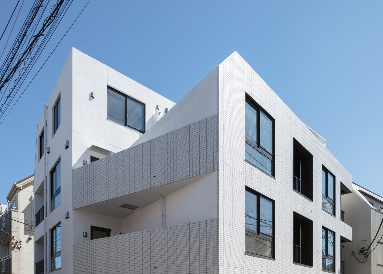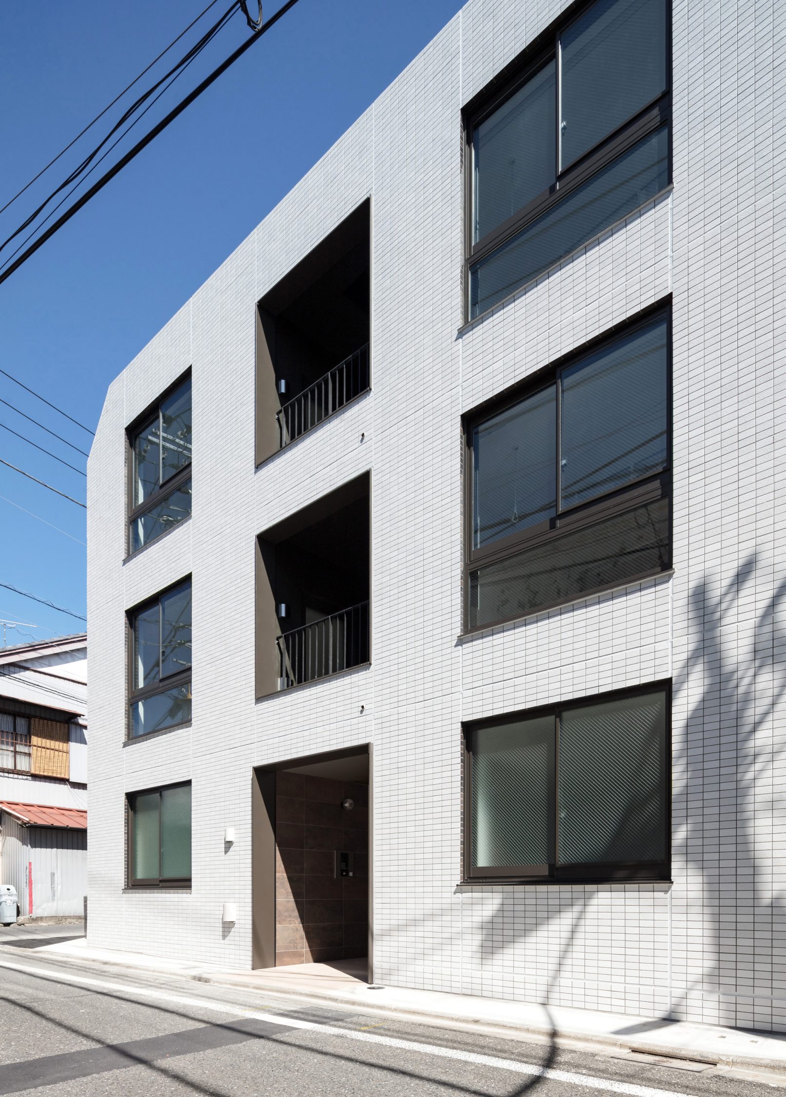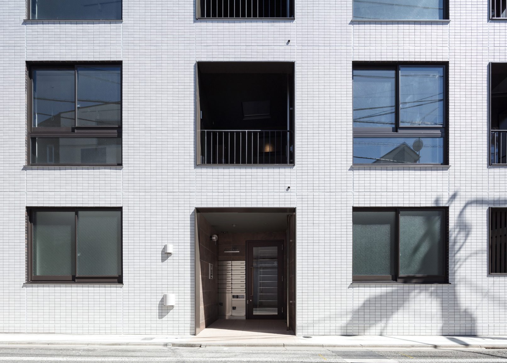 - 賃貸住戸の成約に至る過程において、初期の印象という要素は重要なようだ。物件案内の道中、角を曲がって目の前に現れた建物の印象というものをいかに形成するかは、建物の設計においては実は重要なポイントであるが、意外にも見落とされ、メリハリを欠いたファサードは多い。そのようなテーマに持ってこいの立地条件である本件では、第一印象であるアプローチにおける印象の付け方を、人がアイシャドウを施すかのように、窓廻りにメリハリを利かすことで、印象ボリュームの最大化を図っている。