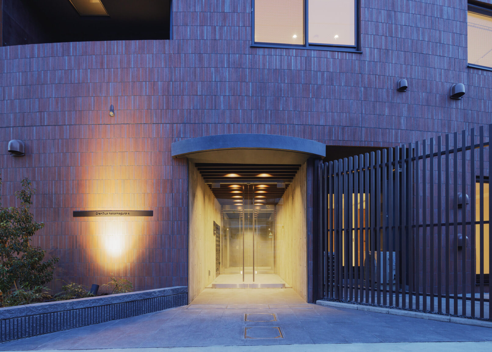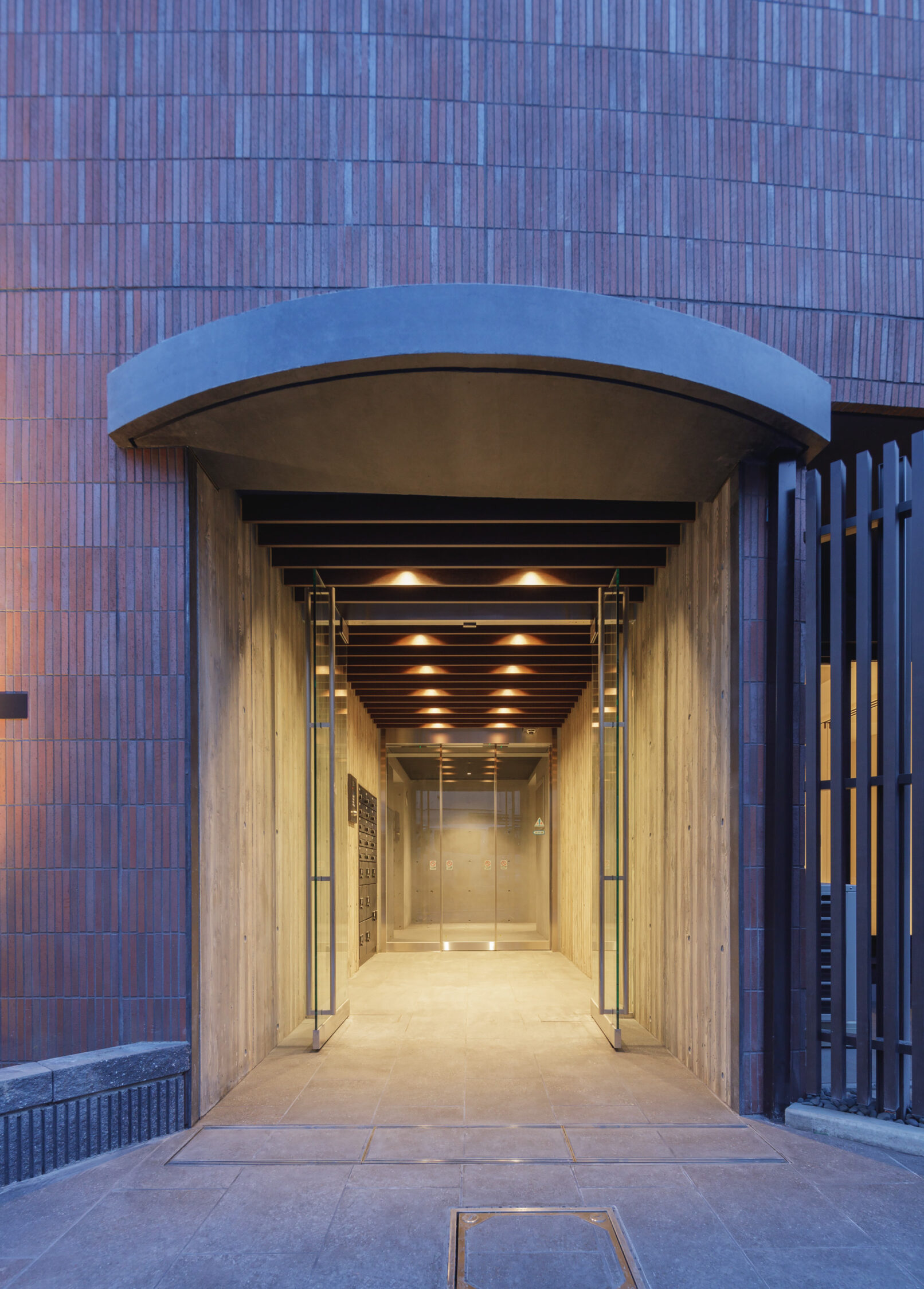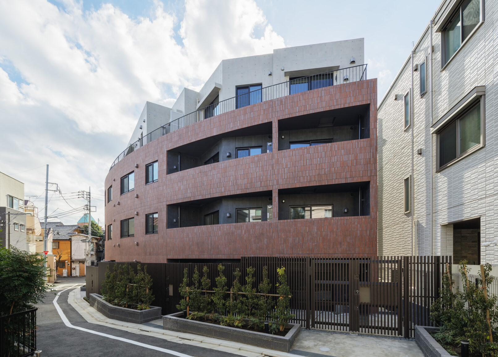 - 計画地周辺の目黒区は、台地と谷(川)によって形成されている。武蔵野台地の一部である目黒台から目黒川に達する流れの中にある。敷地は3筆を合筆した弧を描いた不整形地であるが、逆にその敷地形状を活かして、流れに沿うかたちとしての船形形態の建築を着想した。船の船体部分を表現している基壇の3層はせっき質タイルの壁面をもち、敷地形状に合わせて緩やかな弧を描いている。4層以上はデッキと船橋(ブリッジ)のような趣でメゾネット住戸を備えており、住戸の甲板部(ルーフデッキバルコニー)からは目黒台を一望できる。
