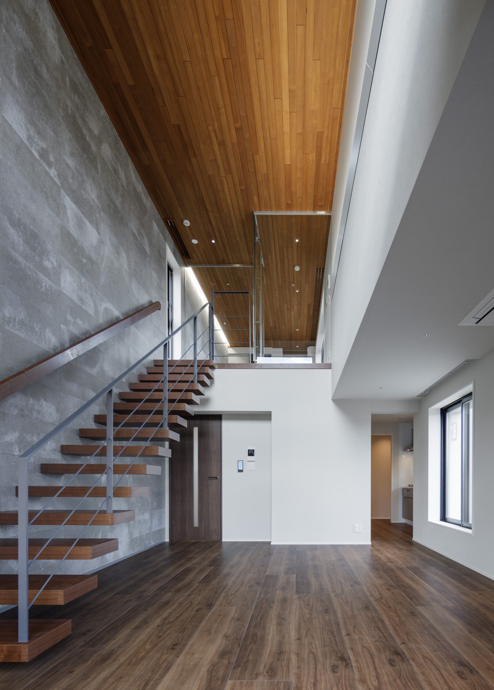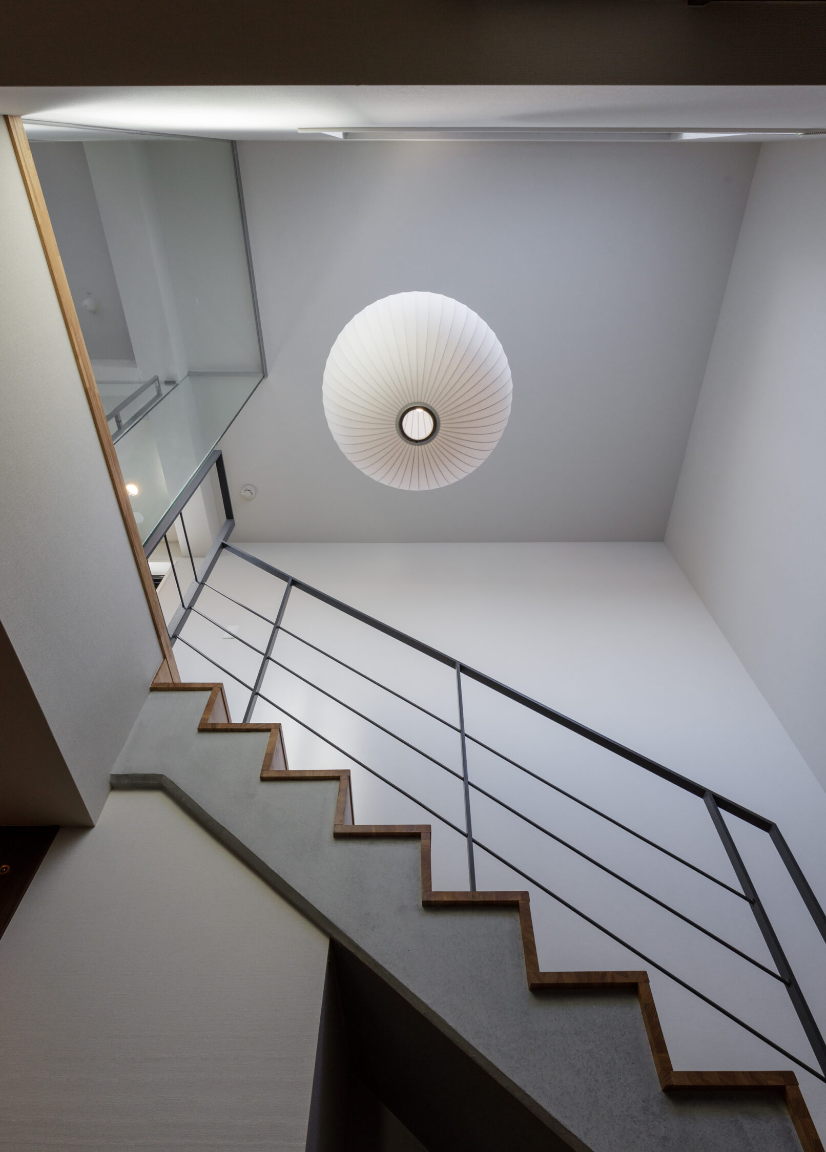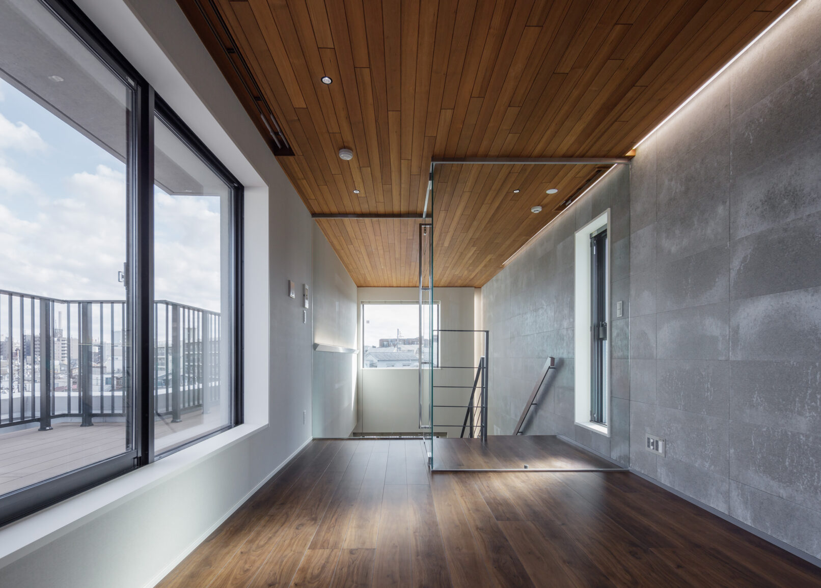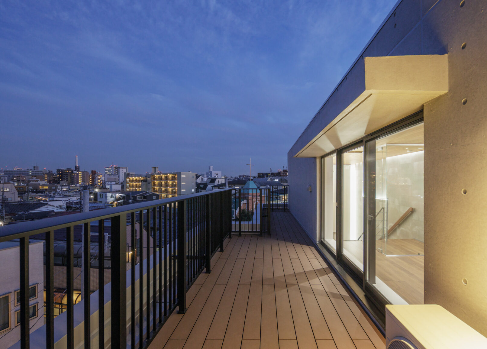 - 計画地周辺の目黒区は、台地と谷(川)によって形成されている。武蔵野台地の一部である目黒台から目黒川に達する流れの中にある。敷地は3筆を合筆した弧を描いた不整形地であるが、逆にその敷地形状を活かして、流れに沿うかたちとしての船形形態の建築を着想した。船の船体部分を表現している基壇の3層はせっき質タイルの壁面をもち、敷地形状に合わせて緩やかな弧を描いている。4層以上はデッキと船橋(ブリッジ)のような趣でメゾネット住戸を備えており、住戸の甲板部(ルーフデッキバルコニー)からは目黒台を一望できる。