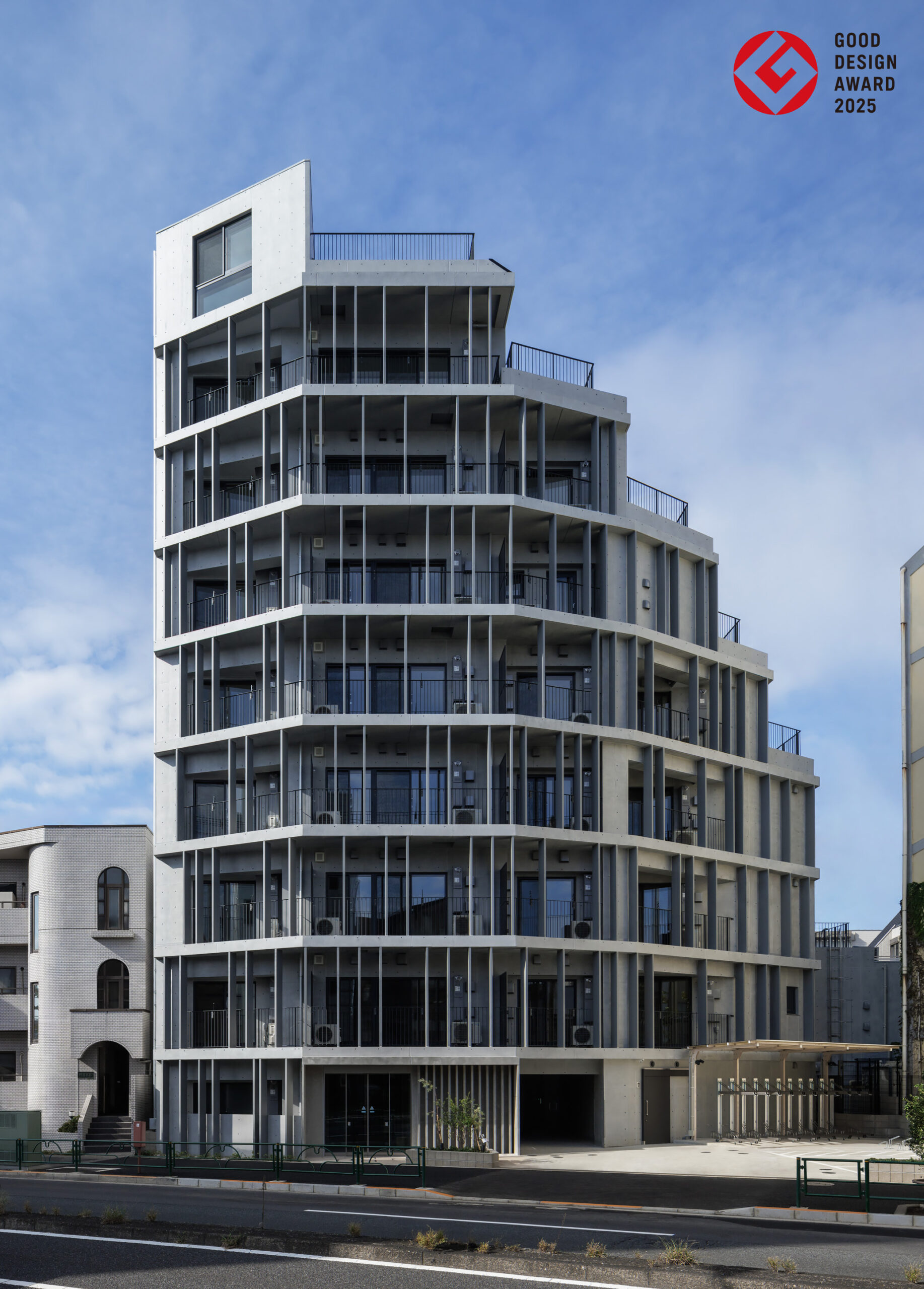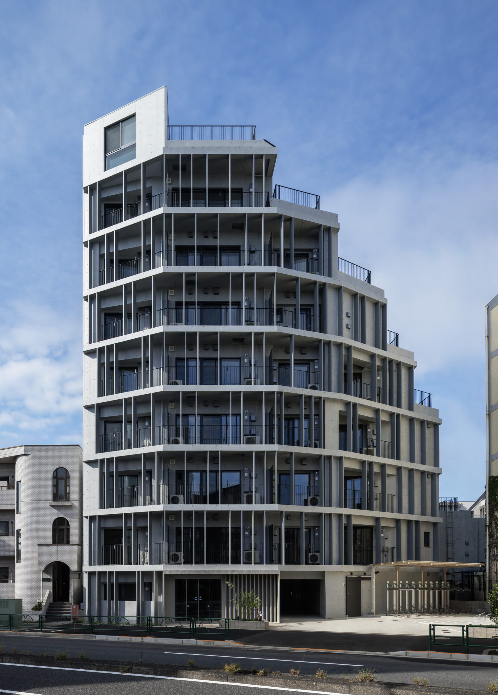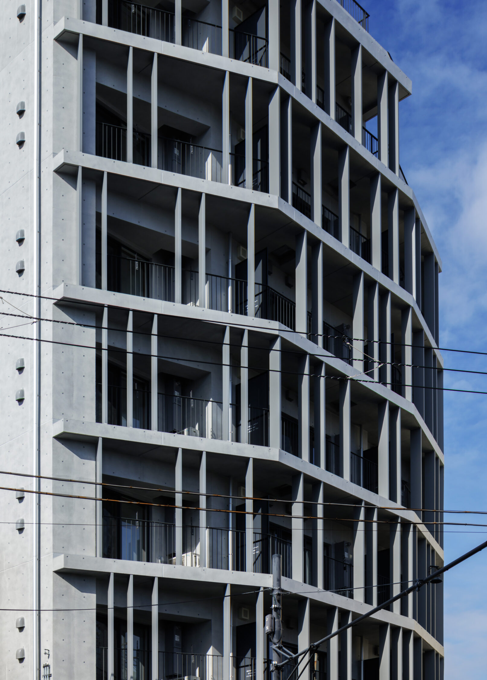 - ランダムに配置された薄板縦ルーバーが印象的な外観を作り出している。ルーバーを設けた外皮と雁行配置された住戸との間には彫りの深いバルコニーが設けられ、都市の喧騒と住まいとの関係を調停しようとした試みは評価できる。環状8号線に正対しない配置とすることで、ファサードの延長を確保している点も優れている。都市景観を構成する集合住宅のファサードデザインとして、一つの優れた解答であるといえよう。
