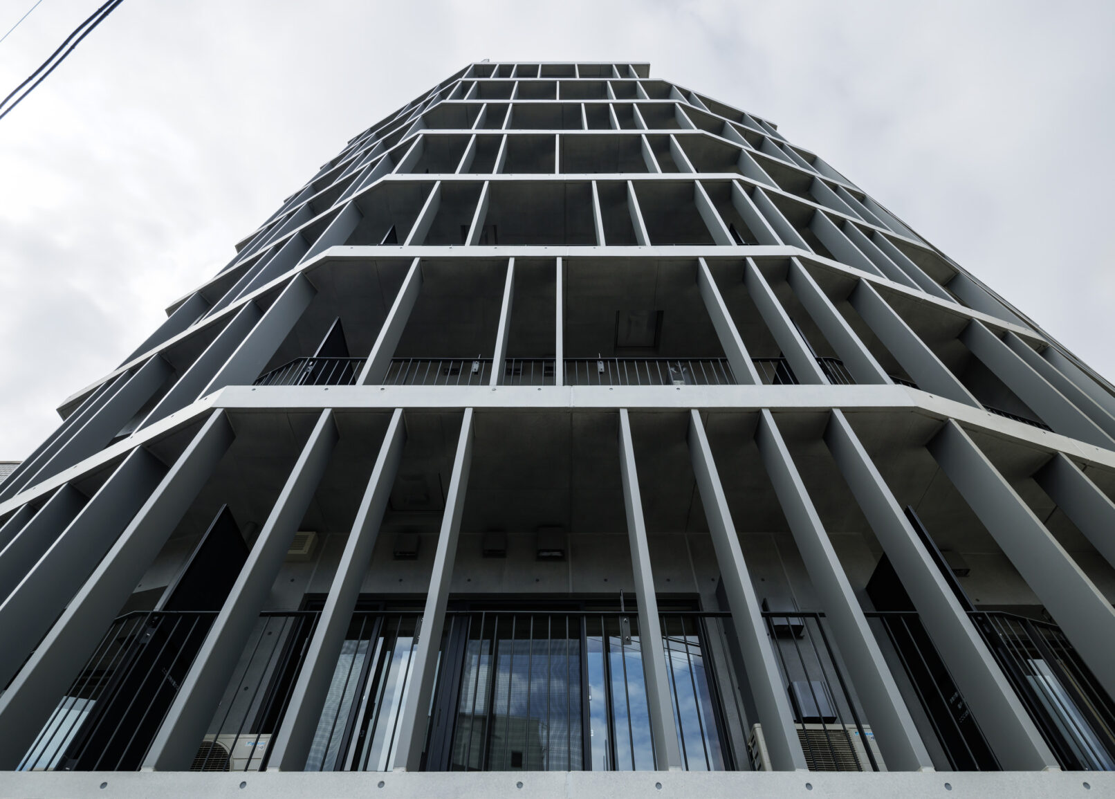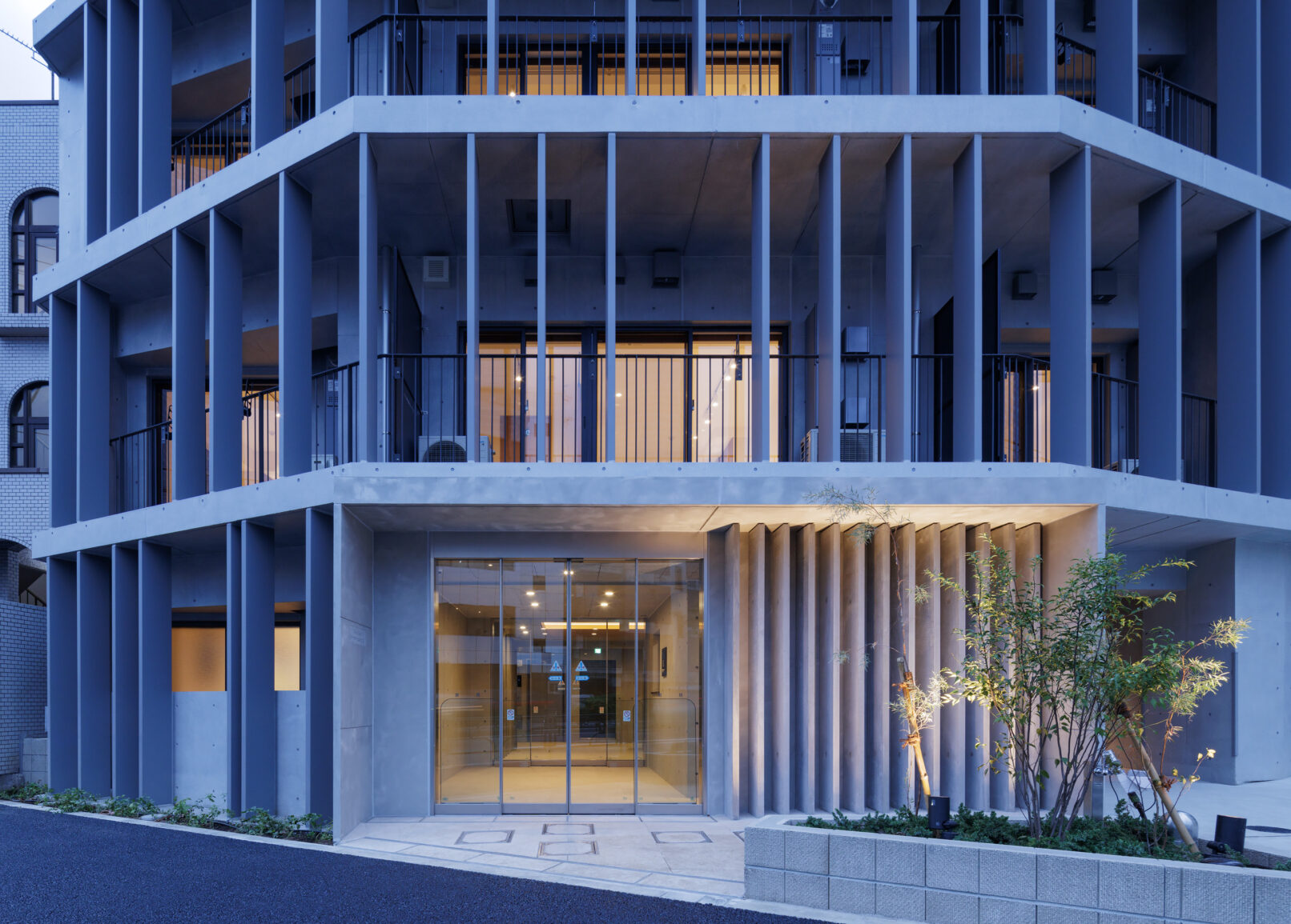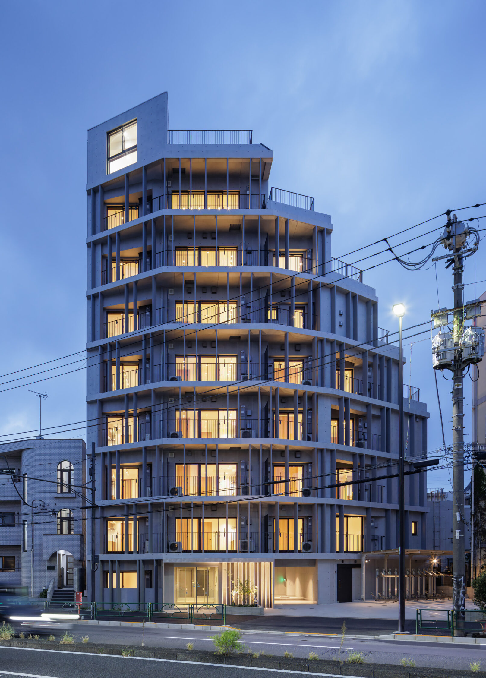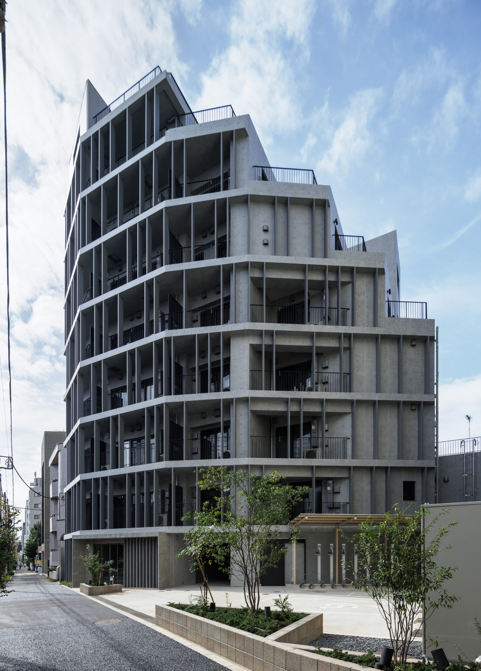 - ランダムに配置された薄板縦ルーバーが印象的な外観を作り出している。ルーバーを設けた外皮と雁行配置された住戸との間には彫りの深いバルコニーが設けられ、都市の喧騒と住まいとの関係を調停しようとした試みは評価できる。環状8号線に正対しない配置とすることで、ファサードの延長を確保している点も優れている。都市景観を構成する集合住宅のファサードデザインとして、一つの優れた解答であるといえよう。