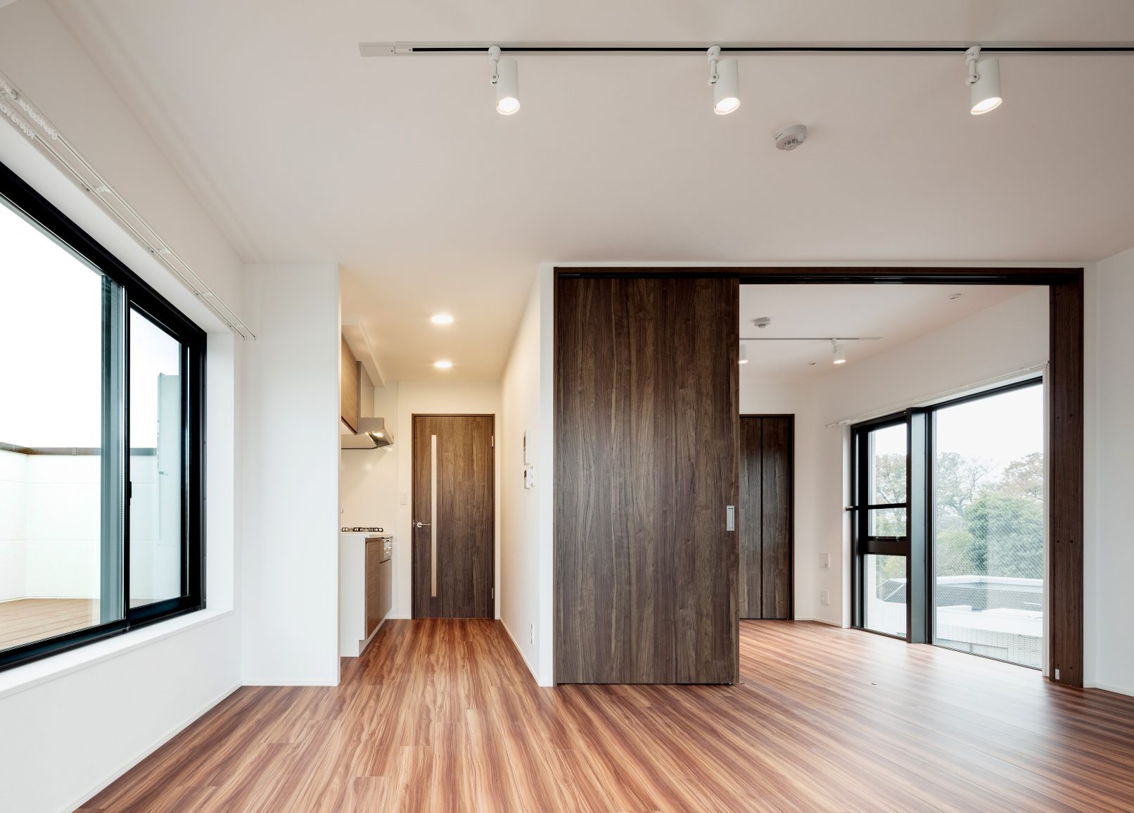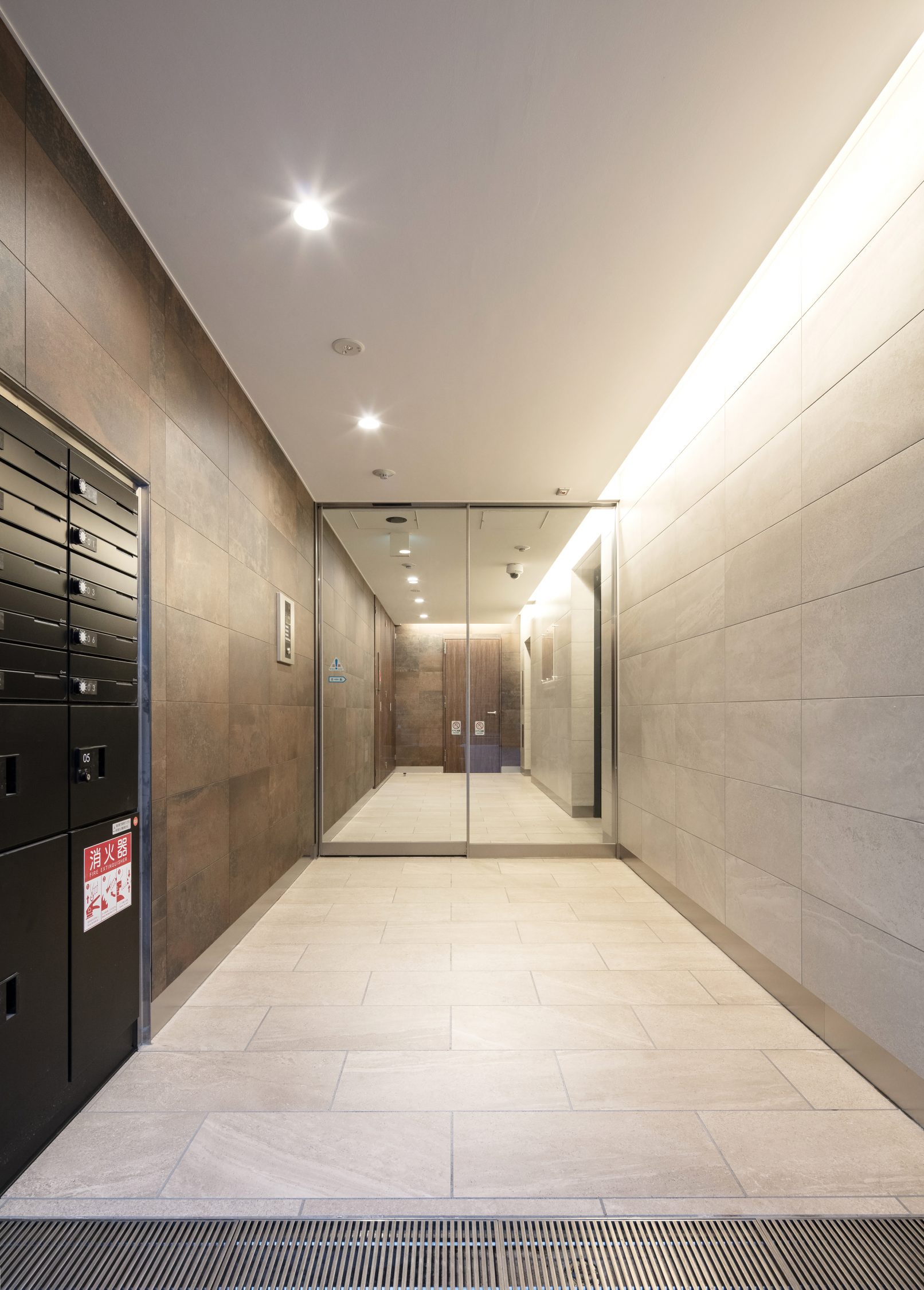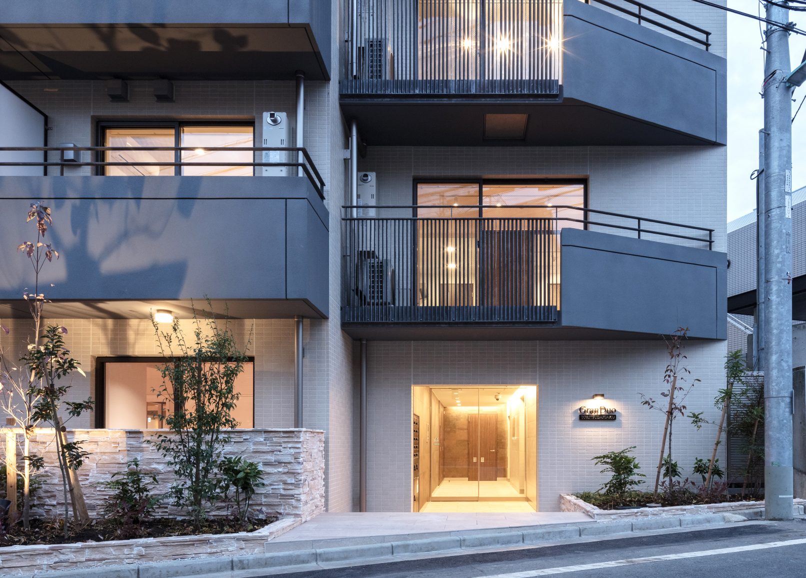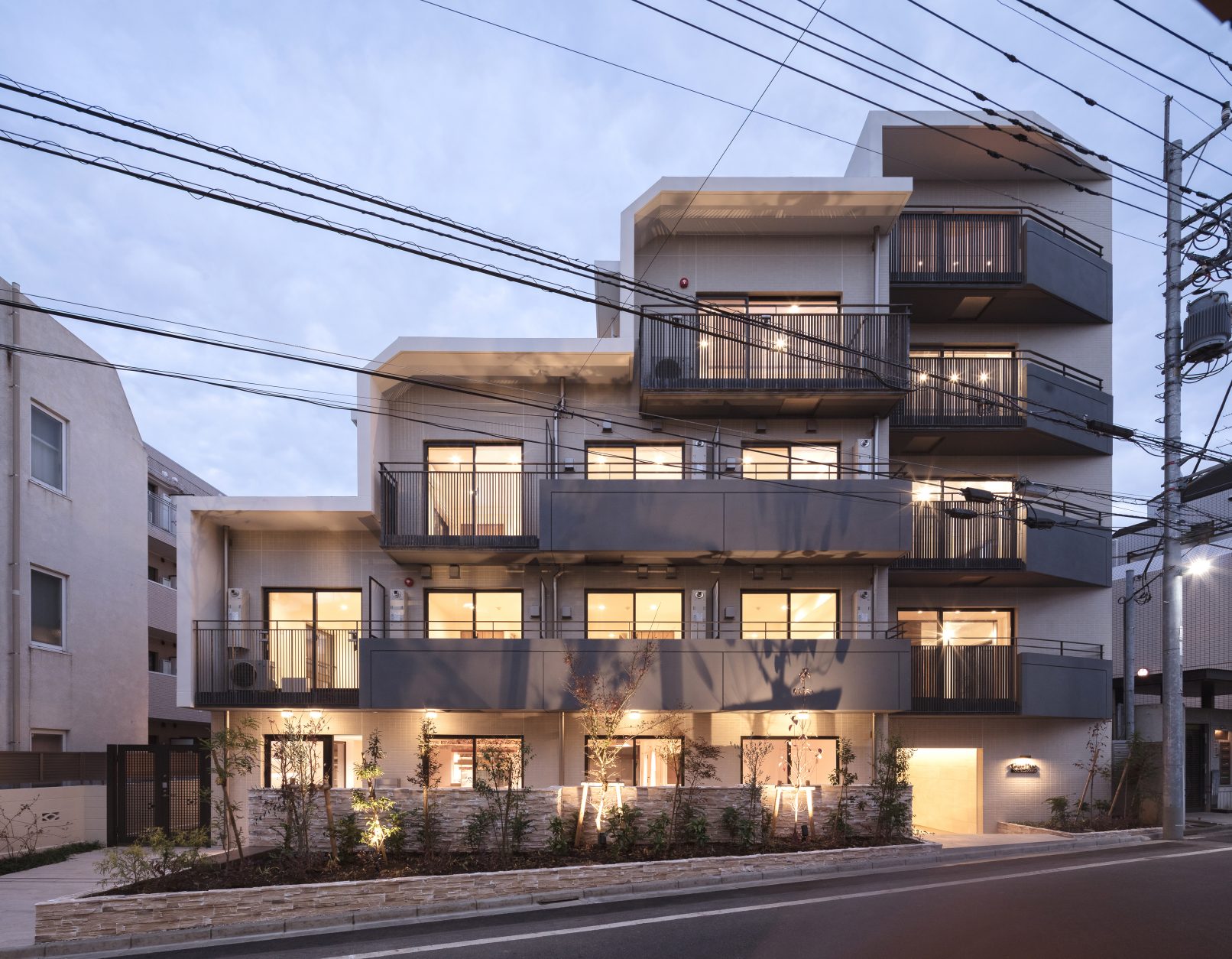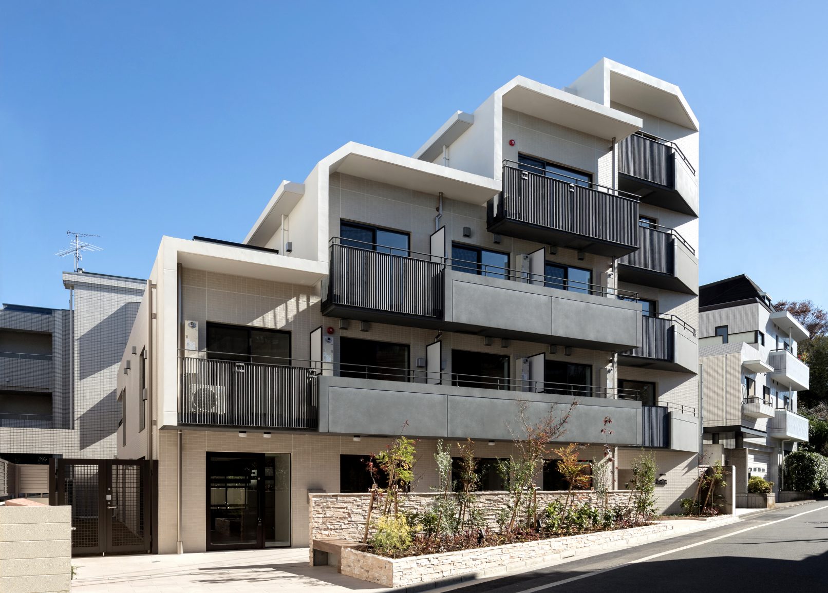 - 計画地は、閑静な住宅街の中にあり、その昔「岡田の森」と地域に親しまれた巨木が繁る「中根公園」の至近に位置している。周辺の住宅の通り沿いは、積極的に緑化が試みられており、質の高い街並みを形成している点から、コンテクストを読み取り、建物と通りの間(はざま)にできる空間を、建物が立ち上がるための舞台装置『POCKETPARK』と名づけ、積極的な緑化を行うことで、小さな森を創り出した。また、建物はその舞台装置(森)の背景として機能すべく、自然になじむ素材感『NATURAL』に沿ってデザインされている。また高度斜線の関係で、建物形状がセットバックしていく部分には、ルーフバルコニーを設け、それらを囲う様に壁を配置することで、プライベート感のある空間とした。