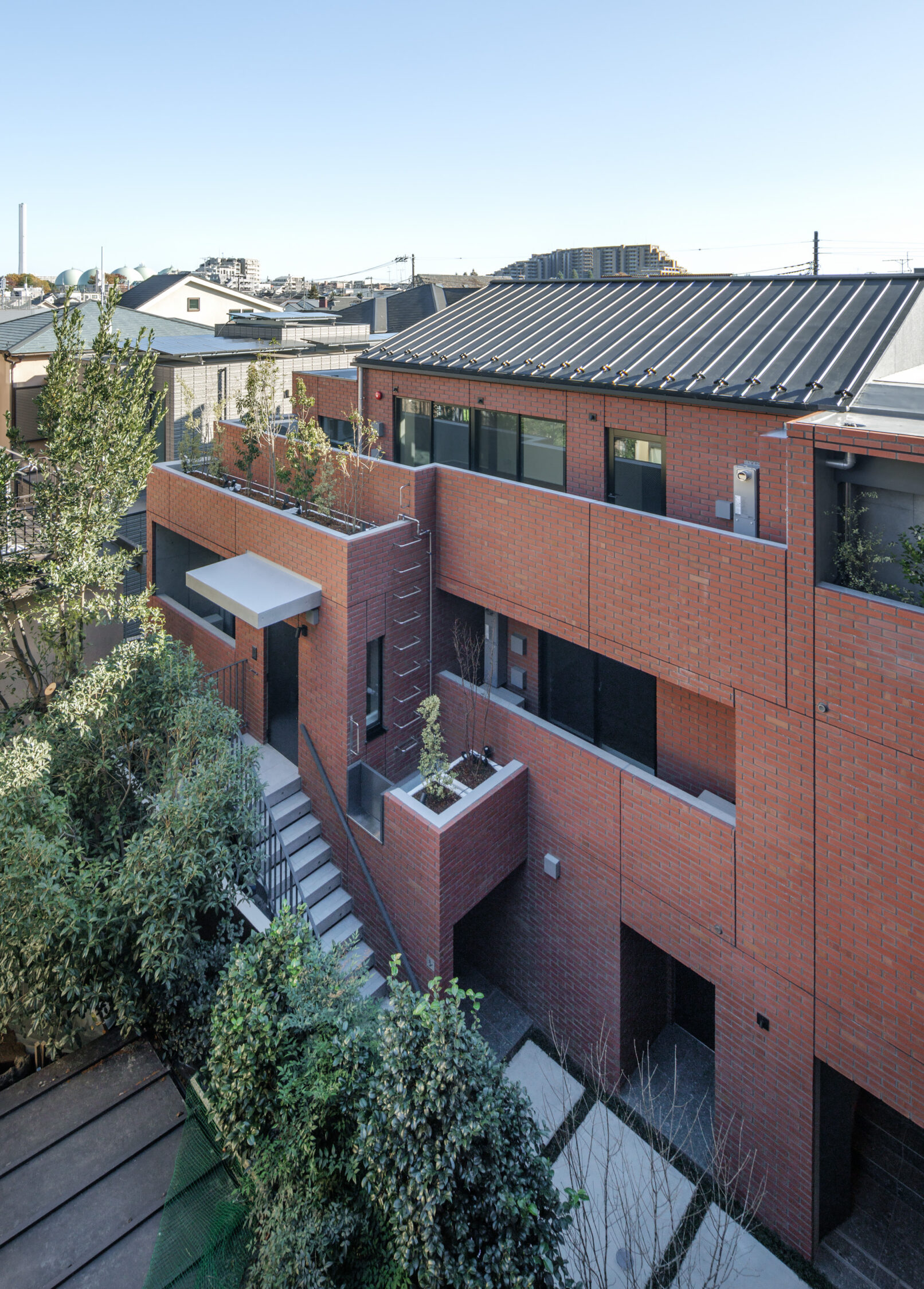 - 本計画では、建物と外構に一体感を持たせるよう外構・建物ルーフに植栽を配置し、敷地全体で緑を感じられる空間を構成した。住戸内からも植栽を望むことができ、日常に自然を取り込んだ豊かな住環境を目指した。