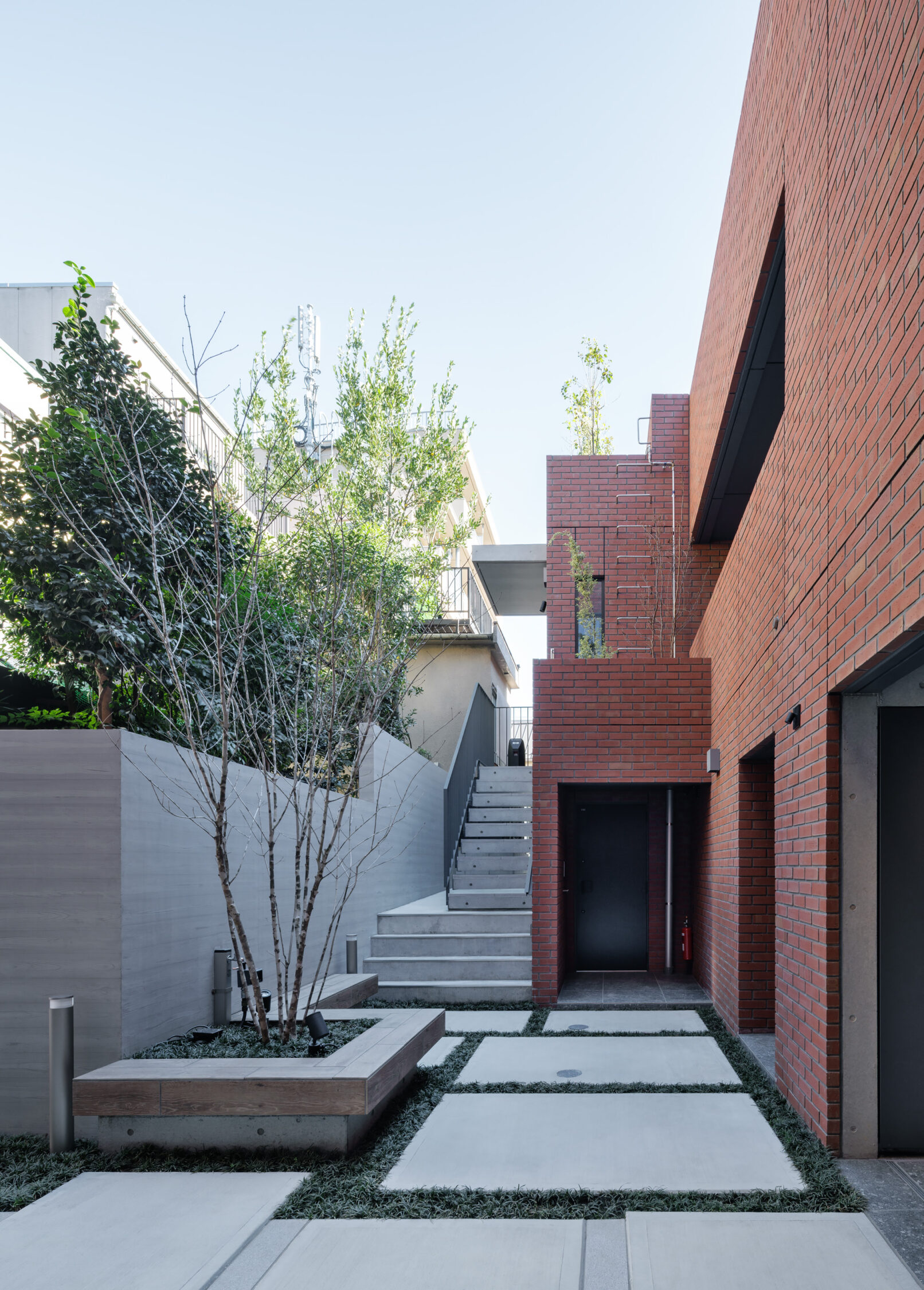- 敷地の中心には、住人の共用庭として公園のような空間を設けた。中央に配置することで各住戸からの動線を短くし、気軽に立ち寄れる場所となるよう計画した。庭には植栽を囲むようにベンチを設置し、自然の中で穏やかに過ごせる居場所をつくり出した。