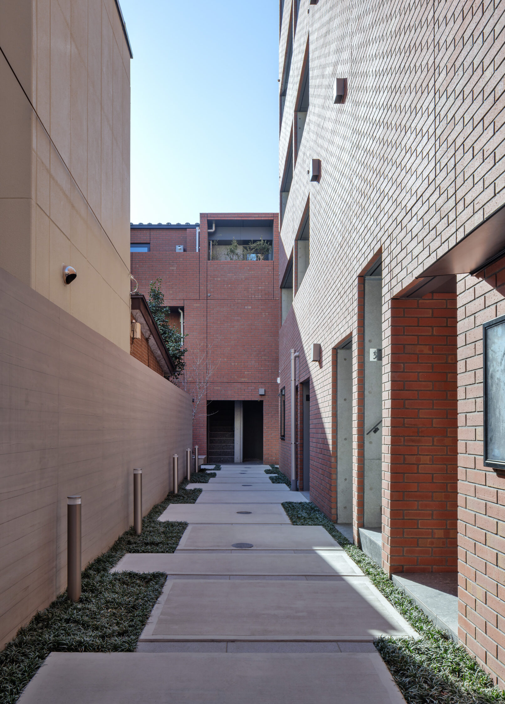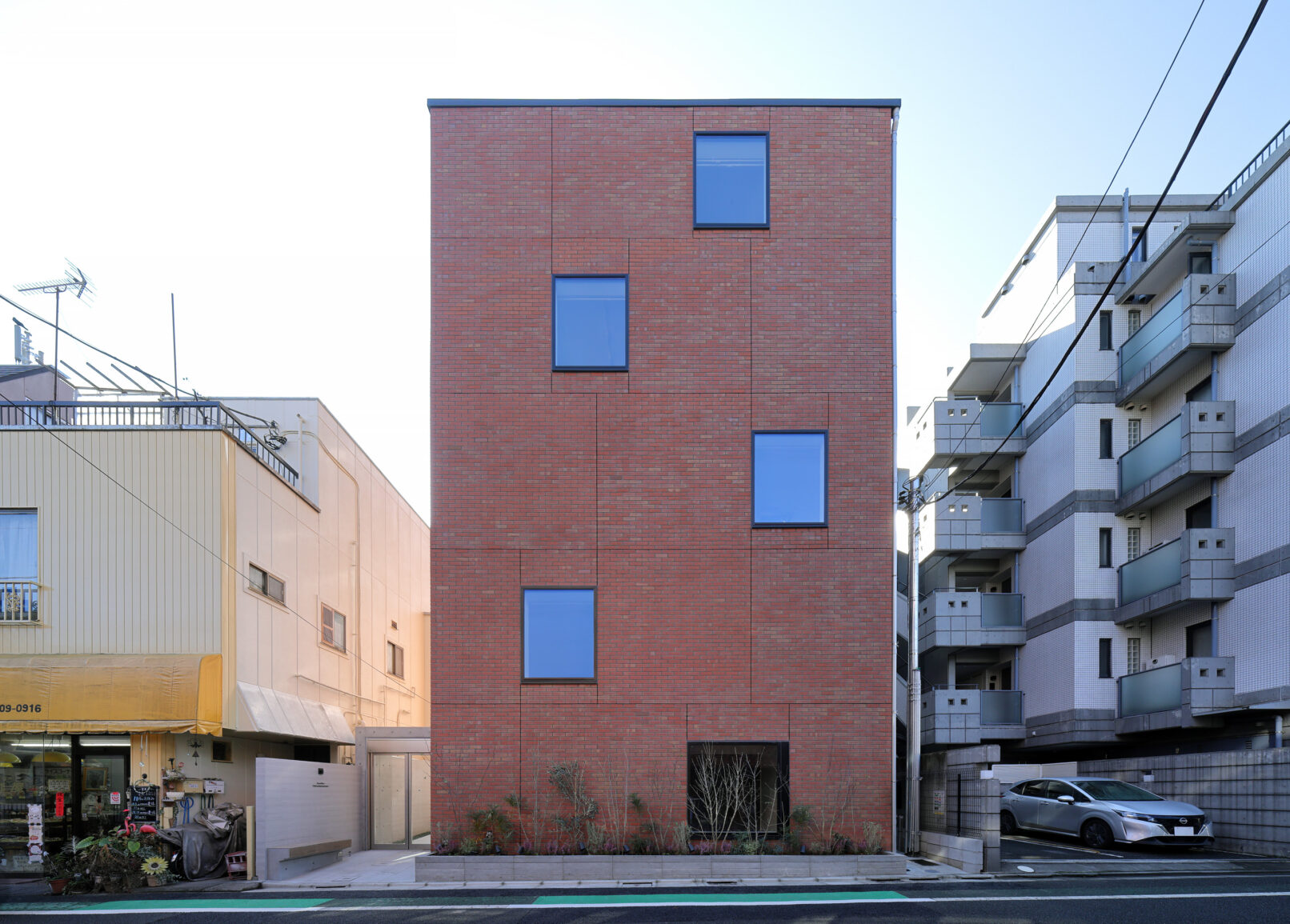 - 外観計画においては、周囲が閑静な住宅街であることをふまえ、街並みに調和する建築を意識し、ファサードはシンプルな長方形とすることで、主張しすぎない落ち着いた佇まいを目指した。外壁にはレンガ調のタイルを用い、落ち着きと温かみを感じさせる表情を与えた。