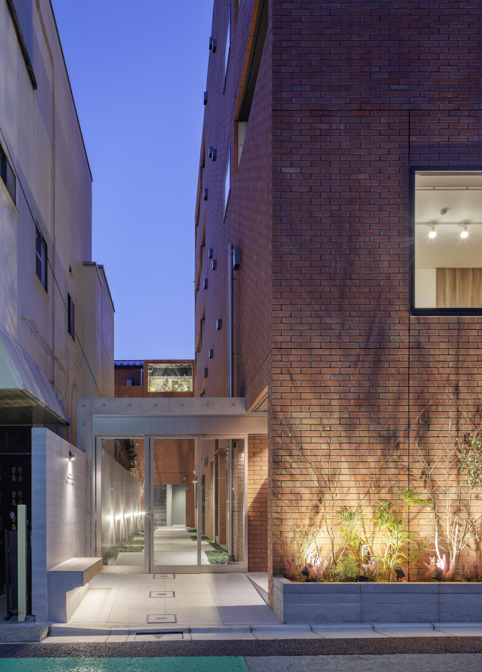 - 外観計画においては、周囲が閑静な住宅街であることをふまえ、街並みに調和する建築を意識し、ファサードはシンプルな長方形とすることで、主張しすぎない落ち着いた佇まいを目指した。外壁にはレンガ調のタイルを用い、落ち着きと温かみを感じさせる表情を与えた。