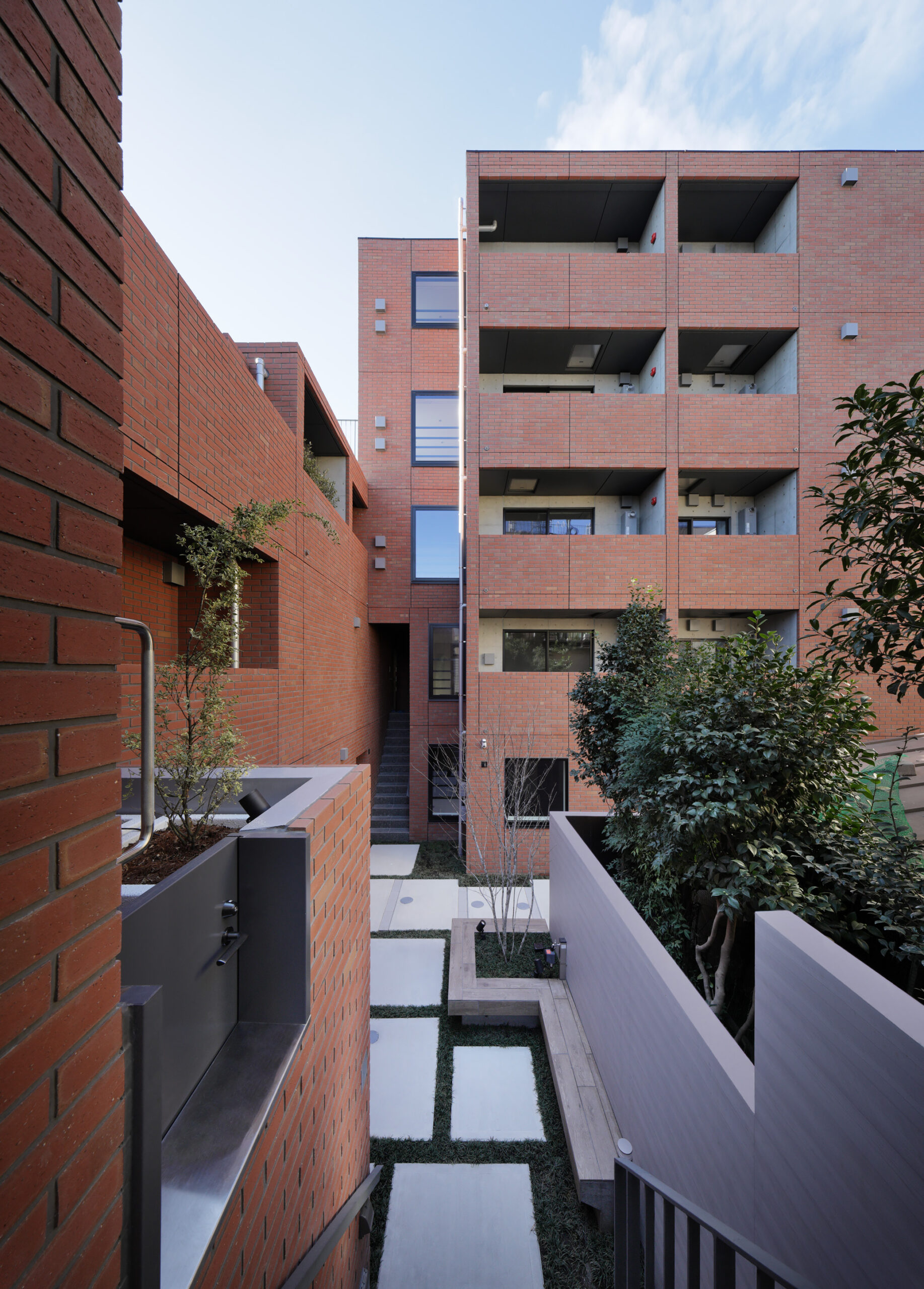 - 敷地の中心には、住人の共用庭として公園のような空間を設けた。中央に配置することで各住戸からの動線を短くし、気軽に立ち寄れる場所となるよう計画した。庭には植栽を囲むようにベンチを設置し、自然の中で穏やかに過ごせる居場所をつくり出した。