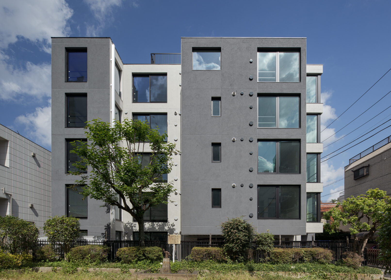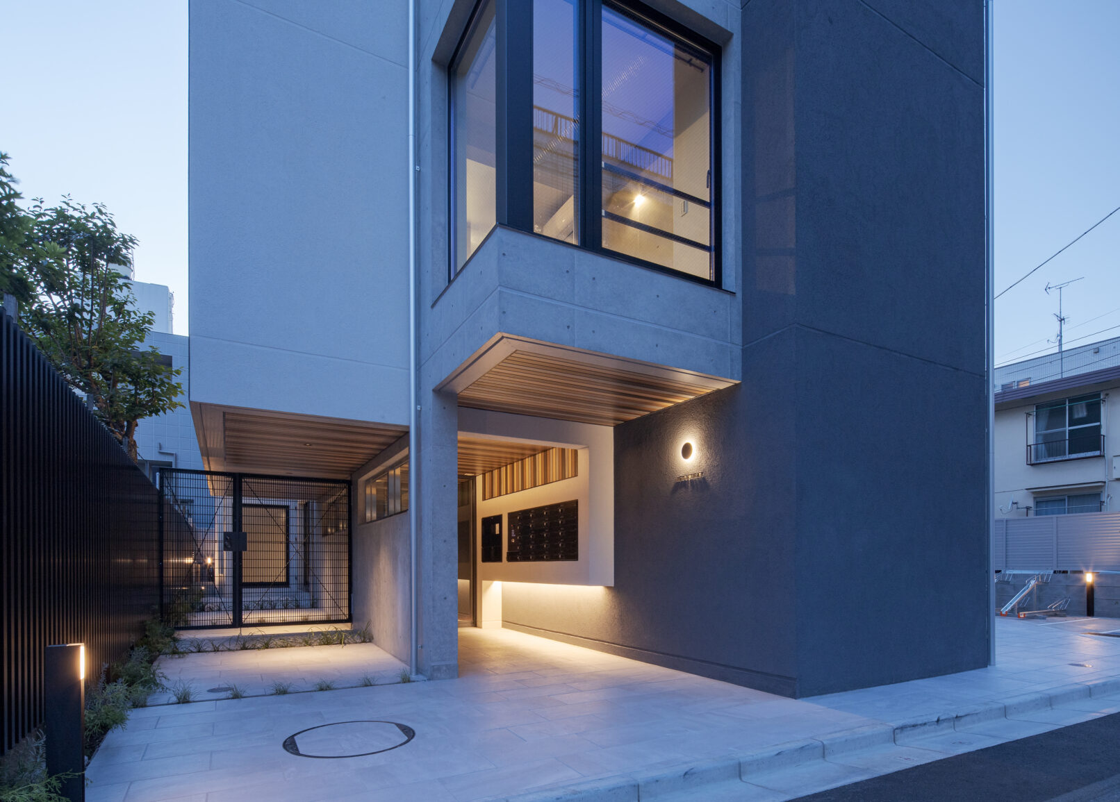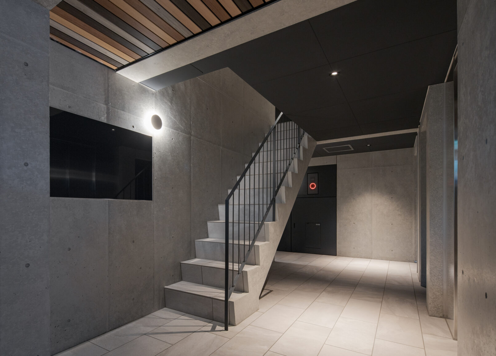 - 外壁は白と黒の左官仕上げとコンクリート打放を各面毎に変化させることで分節化を強調し、アプローチはランダムに散りばめた木目調スパンドレルや横連窓のスリット窓を設け、柔らかな光が差し込む表情豊かな空間としている。