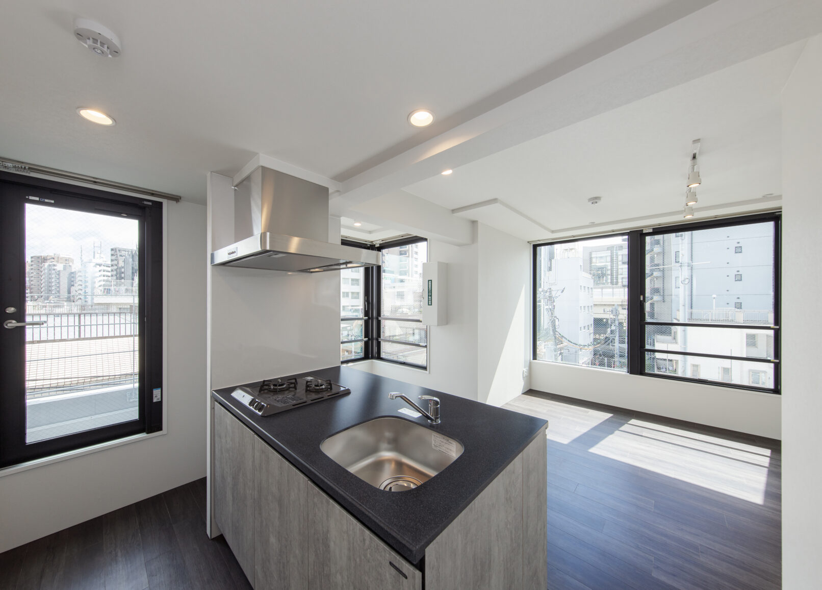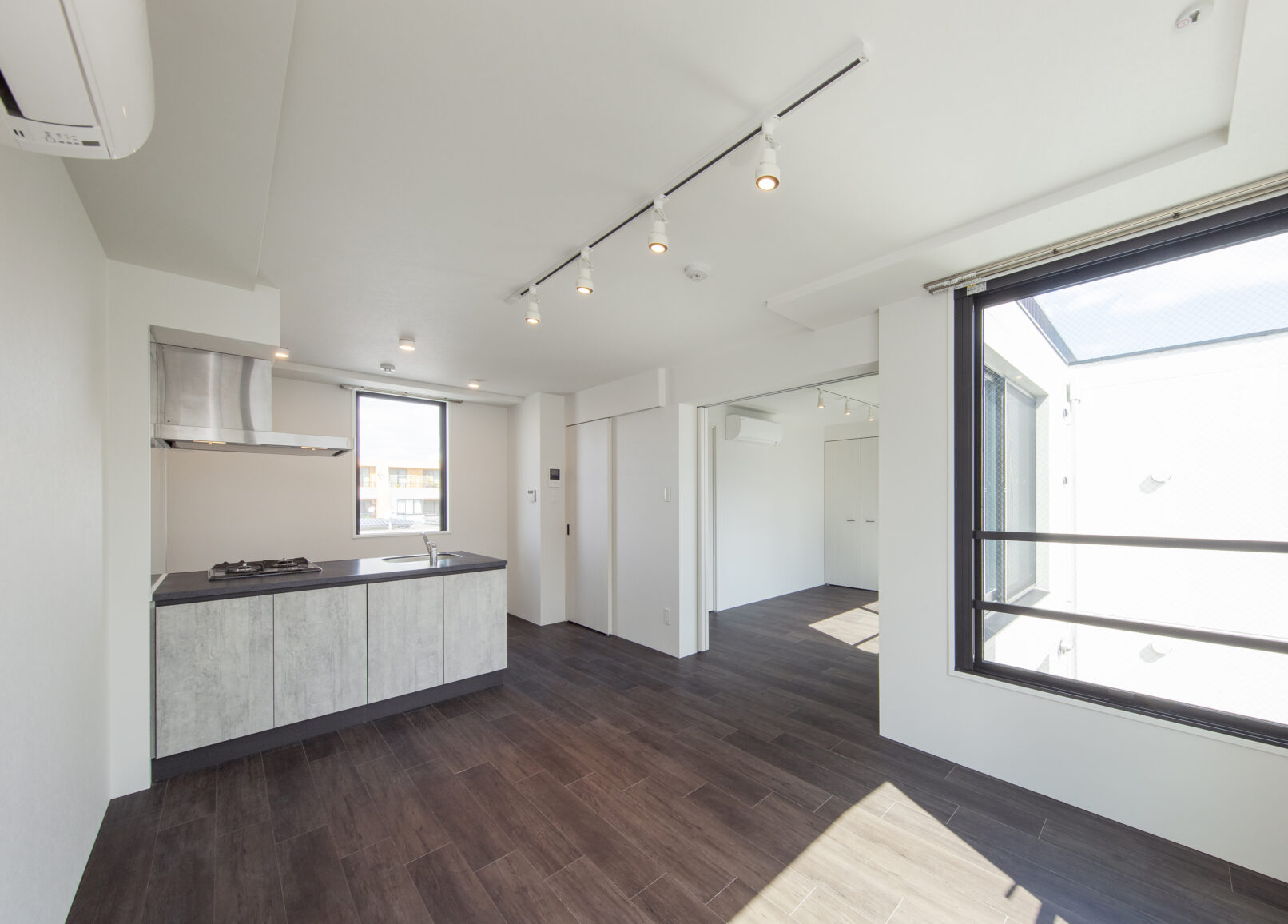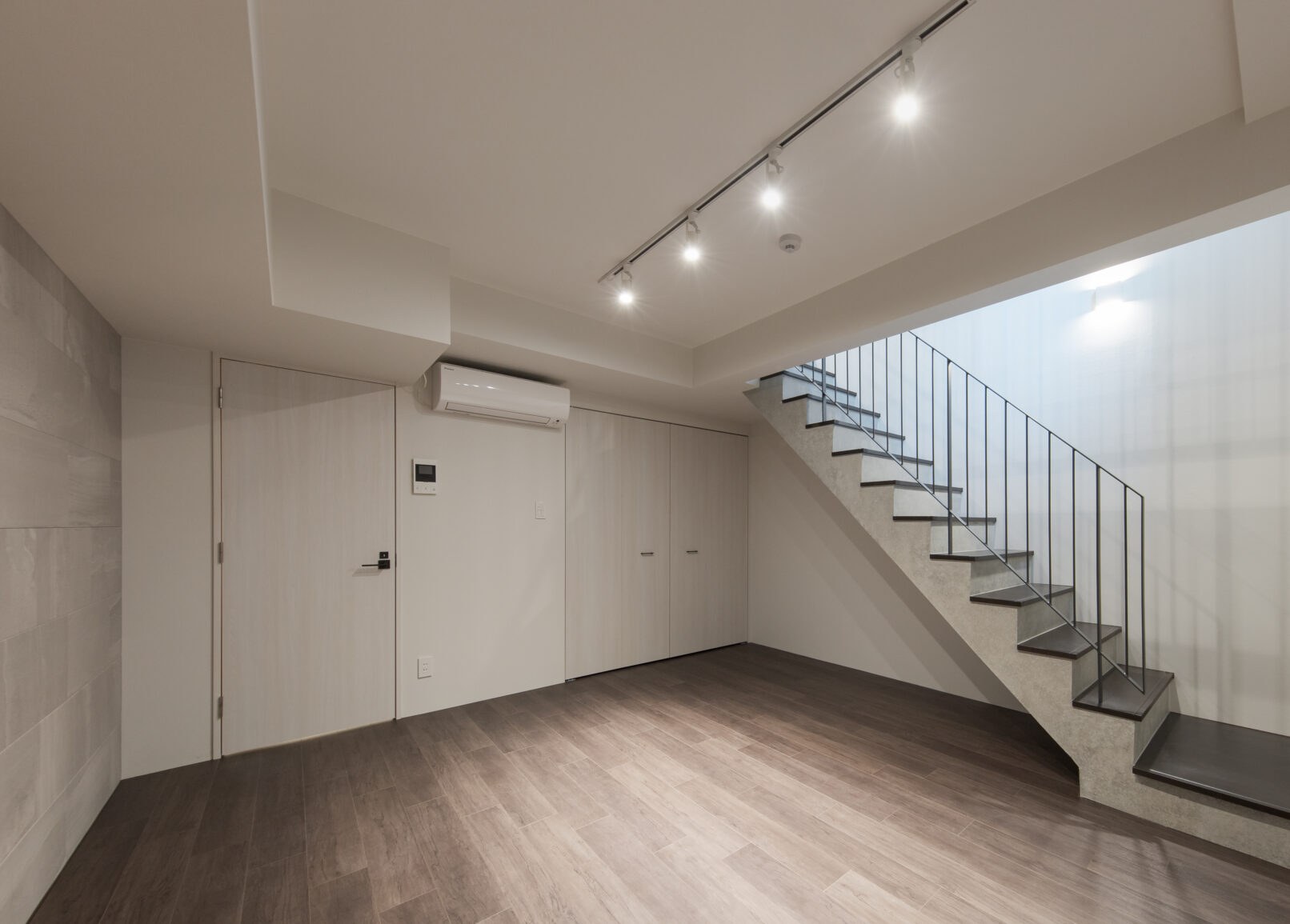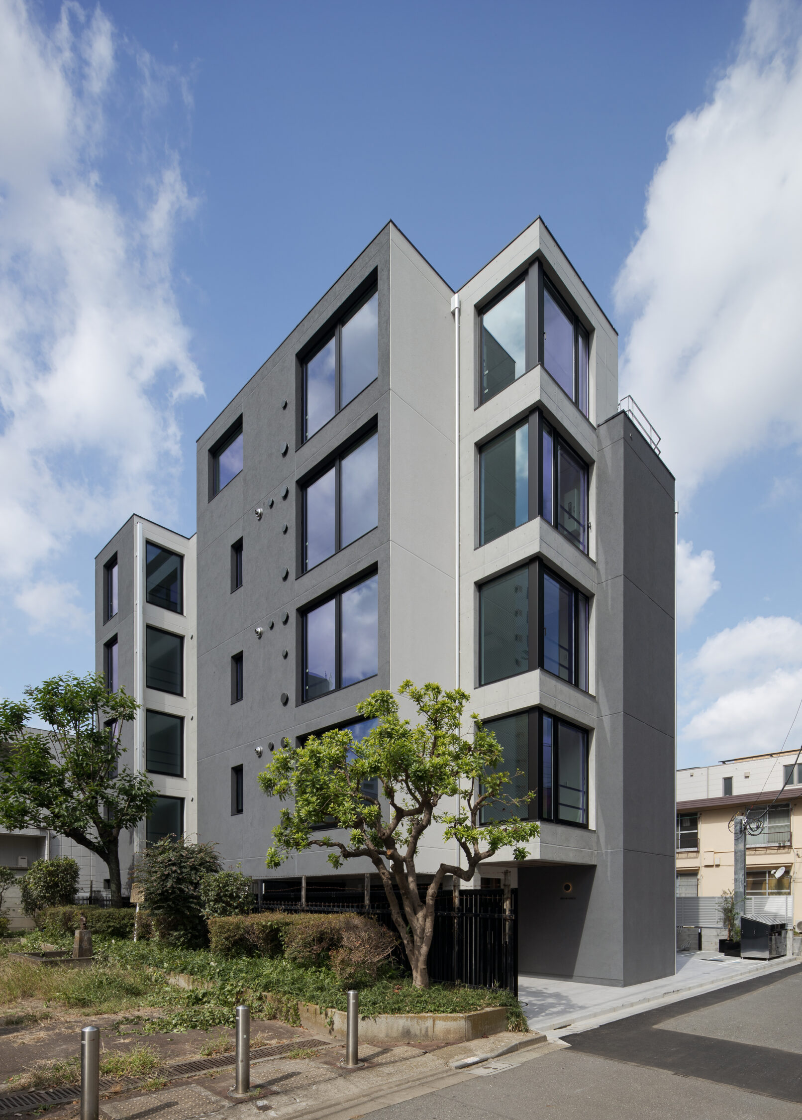 - 外壁は白と黒の左官仕上げとコンクリート打放を各面毎に変化させることで分節化を強調し、アプローチはランダムに散りばめた木目調スパンドレルや横連窓のスリット窓を設け、柔らかな光が差し込む表情豊かな空間としている。