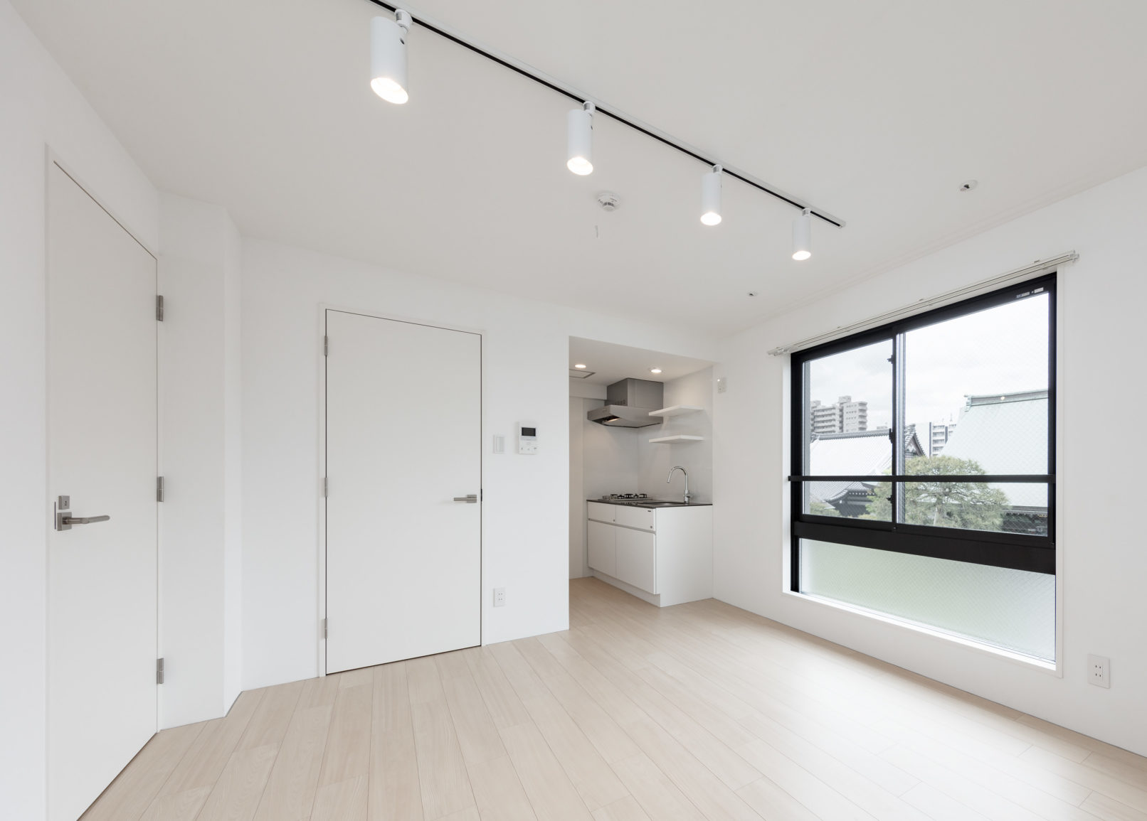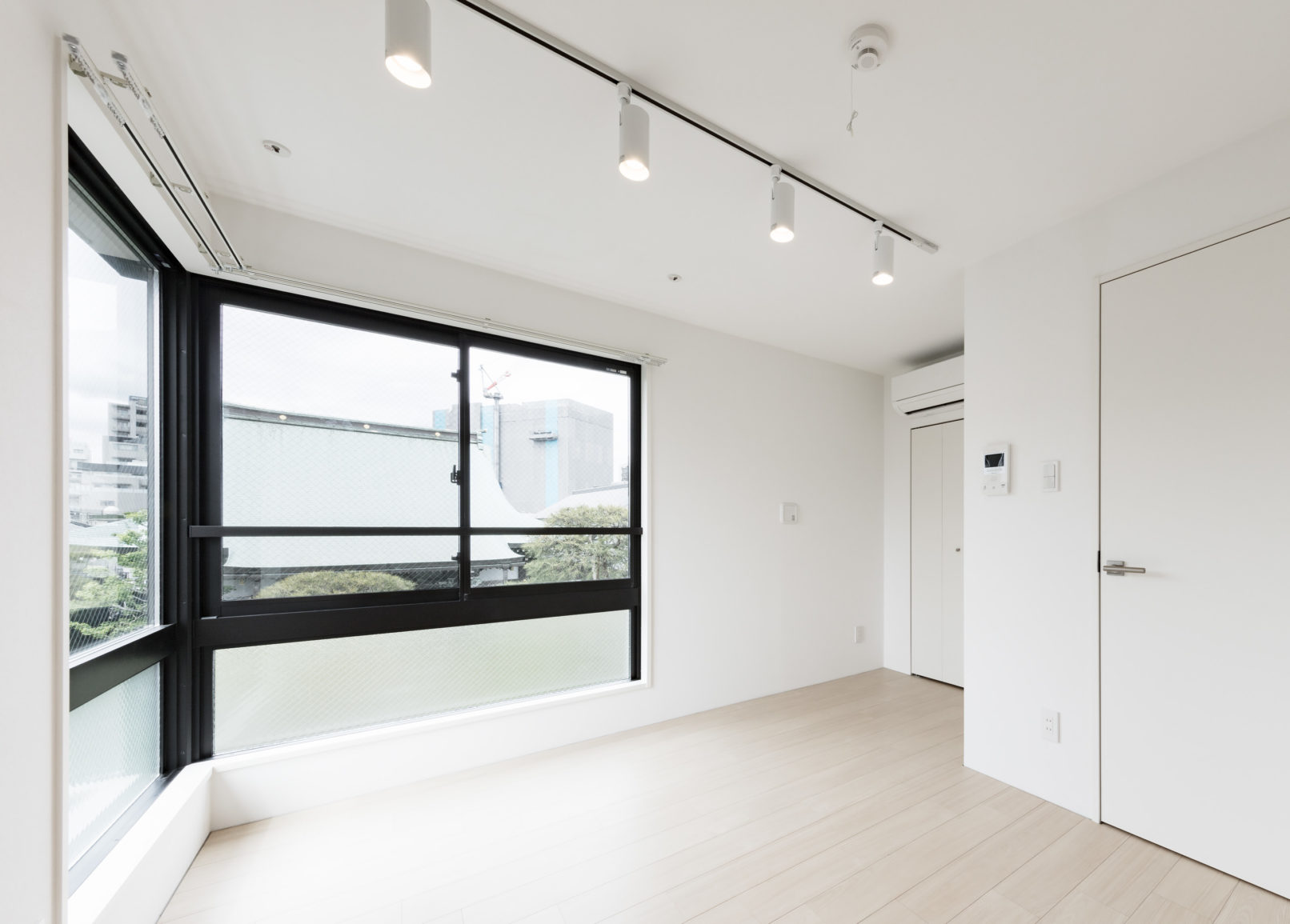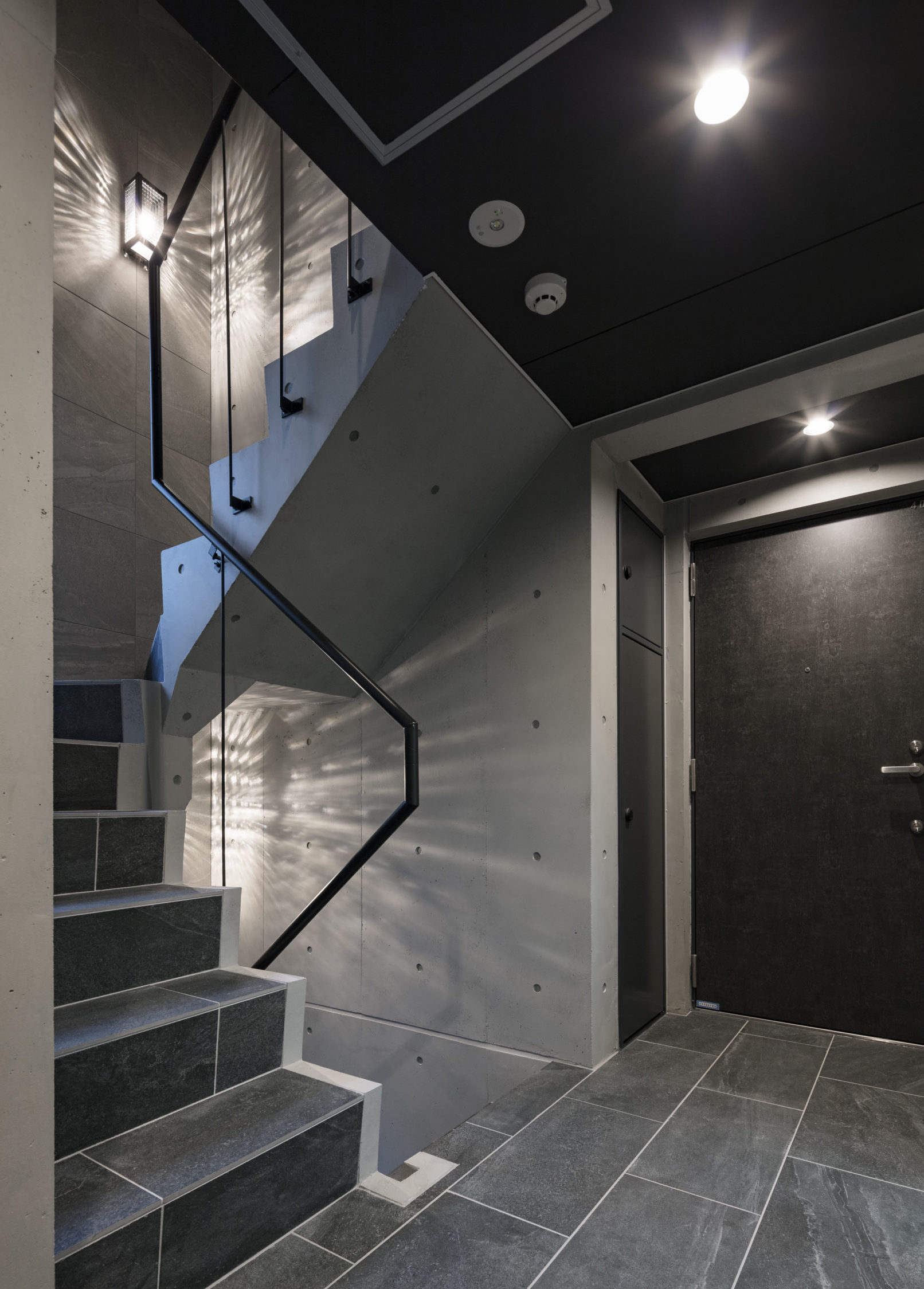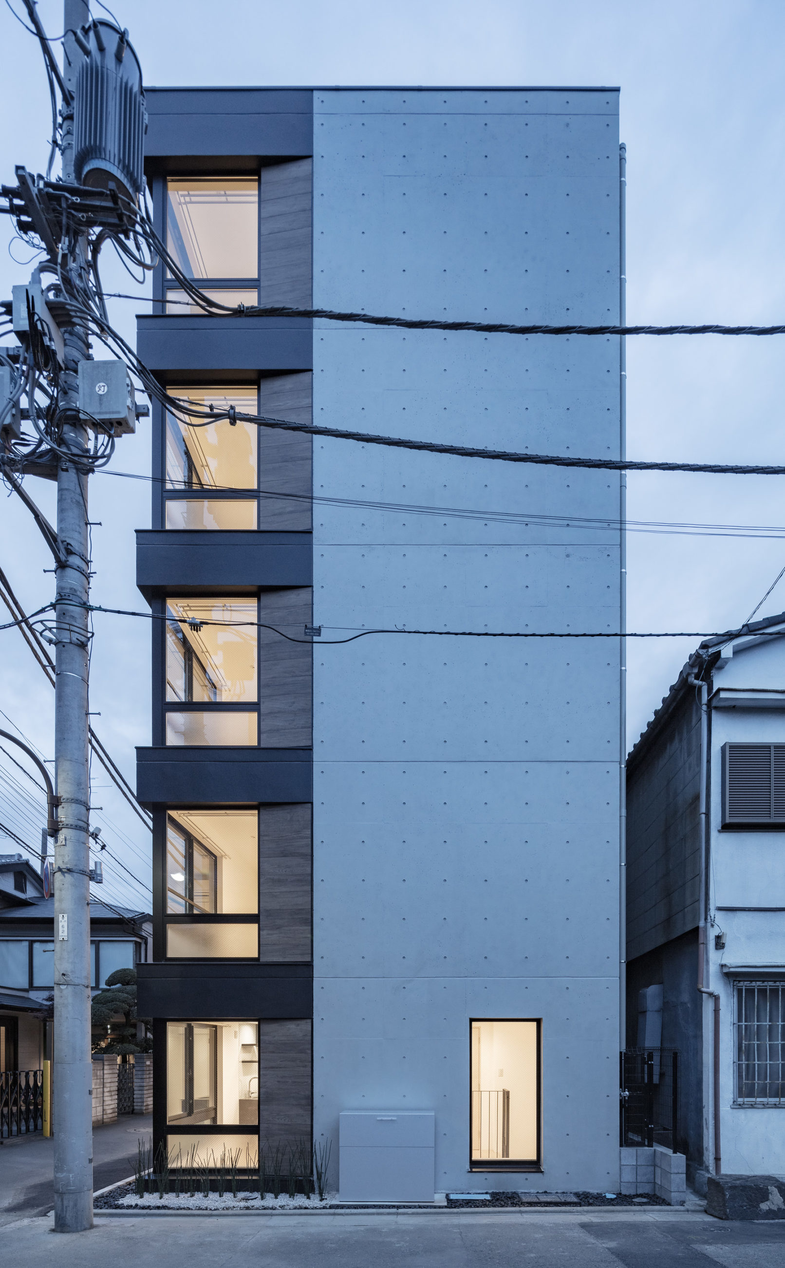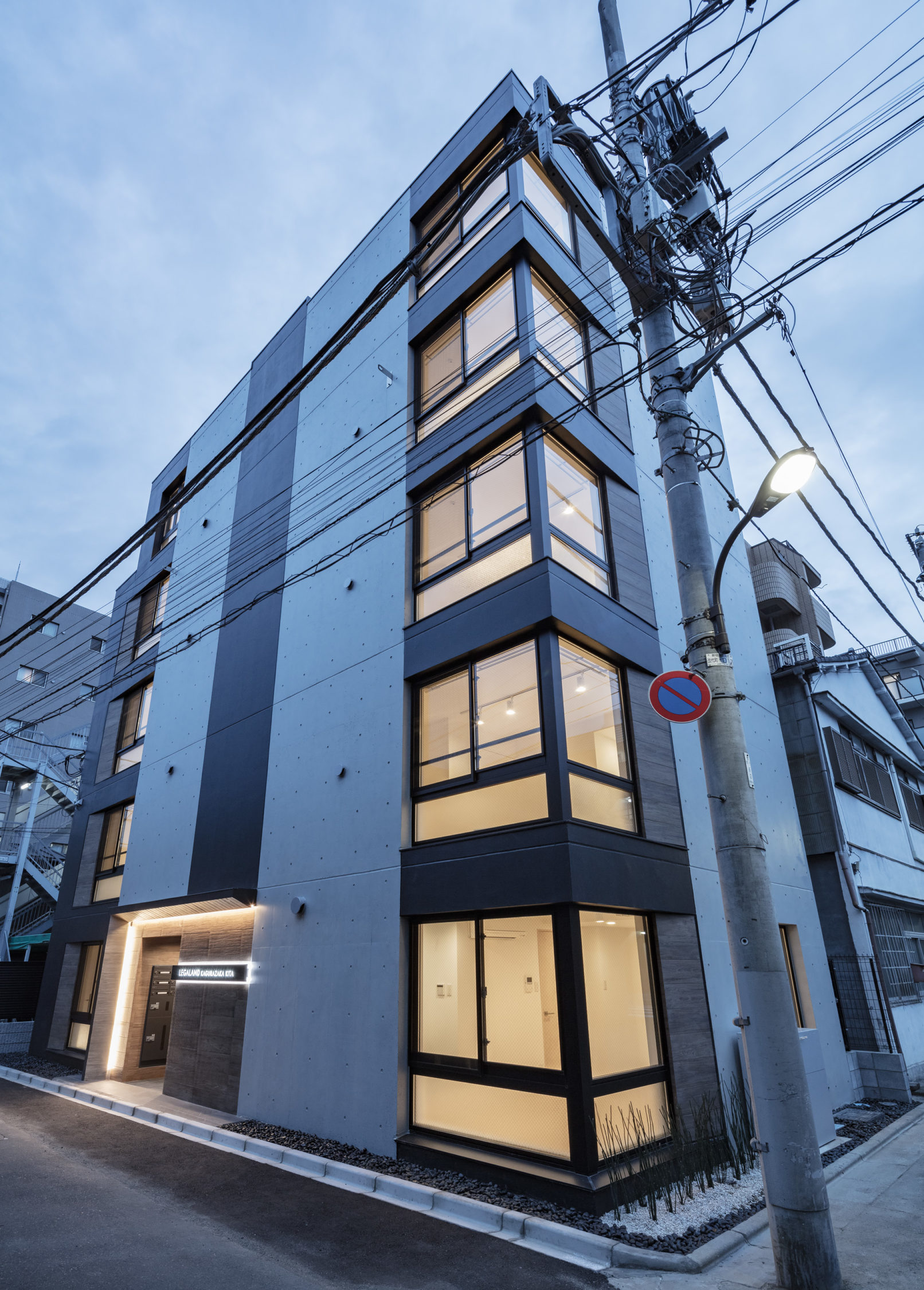 - 計画地は神楽坂の赤城神社を北へ下った、住宅・商店・昔ながらの町工場で成り立つ少しドライな環境に位置しているが、幸いにも敷地正面にはこの地域のランドマークとなる大きなお寺が存在している。計画はこの緑豊かなお寺を取り込むことをコンセプトとし、その借景を全ての住戸から望める計画とした。窓はお寺に開放するイメージでテーパーをかけた木目調の壁を設え外観のアクセントとし、トクサや玉砂利を用いて周辺環境に馴染む「和」テイストを採用している。