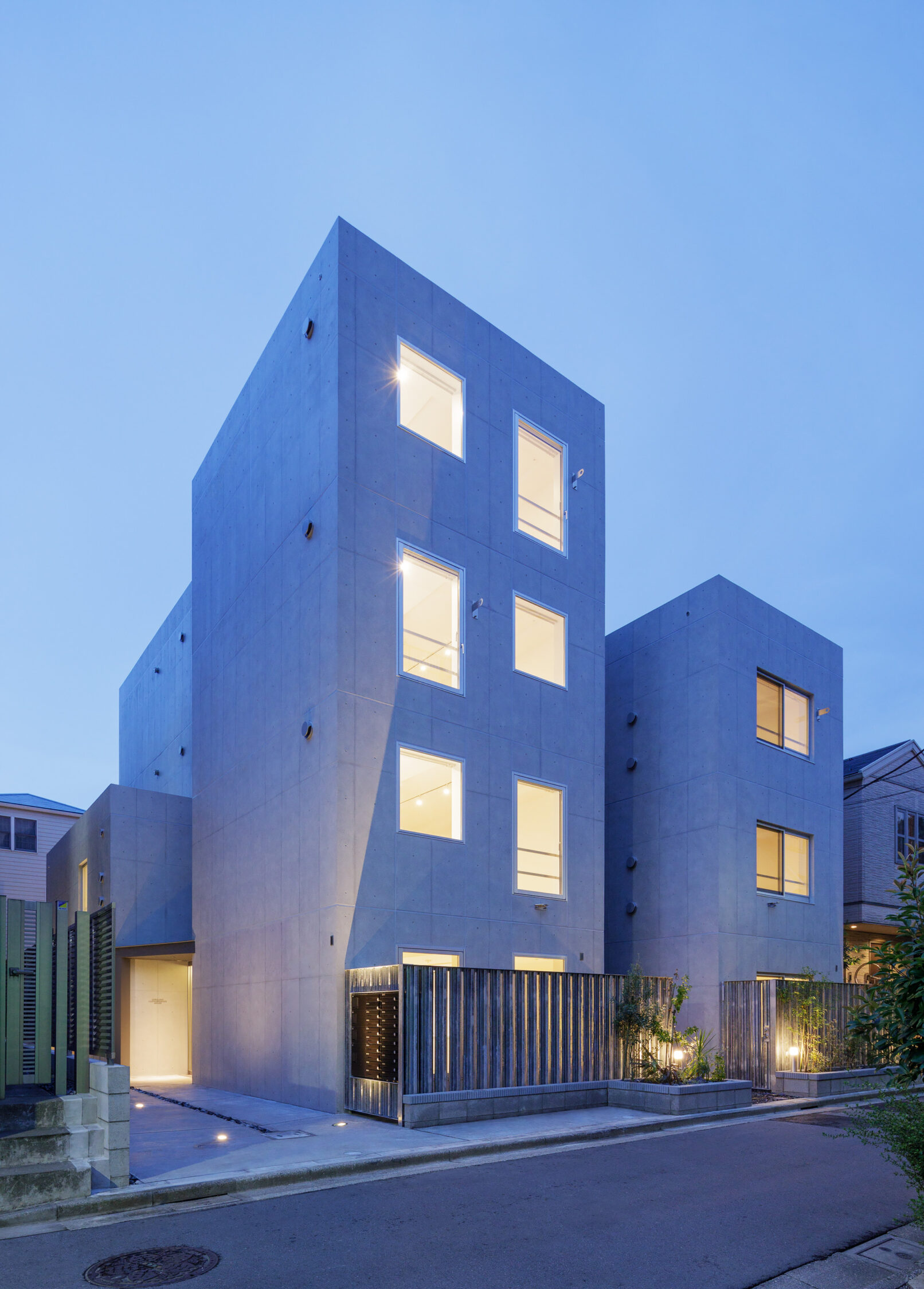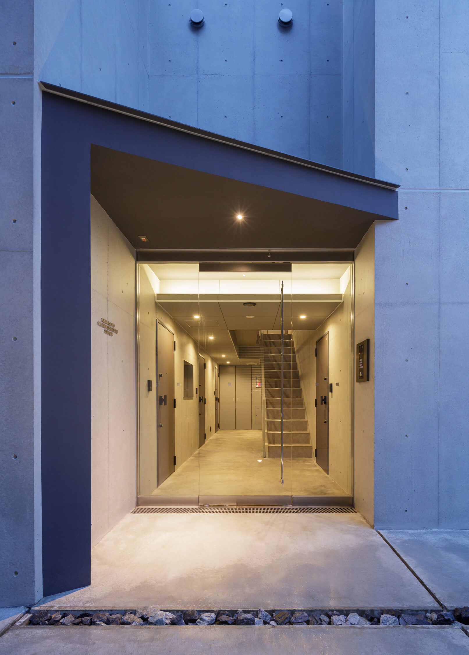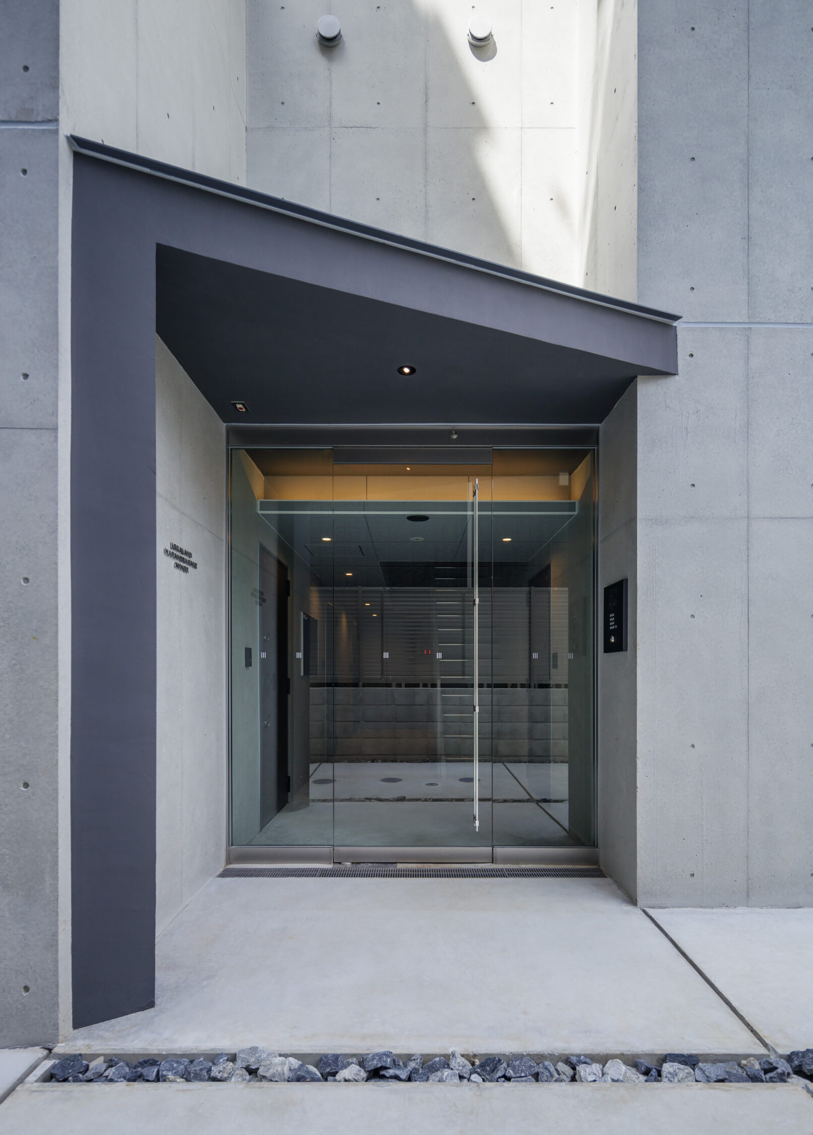 - そこで建物形状は、街に圧迫感を与えないことを考慮し、矩形ボリュームが隆起したような形状とした。壁⾯を⼩さな⾯積に分散することにより、ボリューム感を軽減することを意図した。