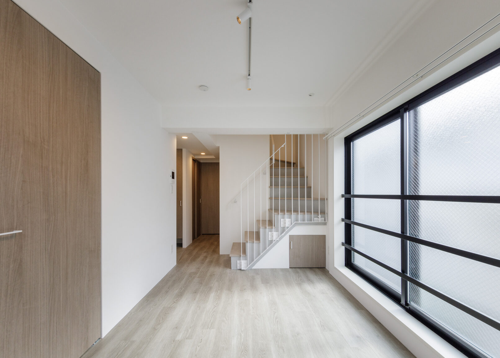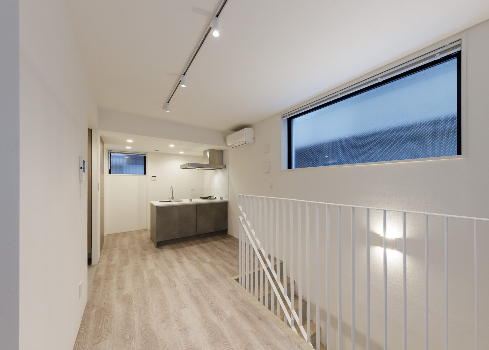 - 求められるボリュームを確保するためには、建物を道路境界まで配置する必要があり、プライバシーの観点を危惧されたが、ルーバー等の設置は、法規制の観点で困難であった。