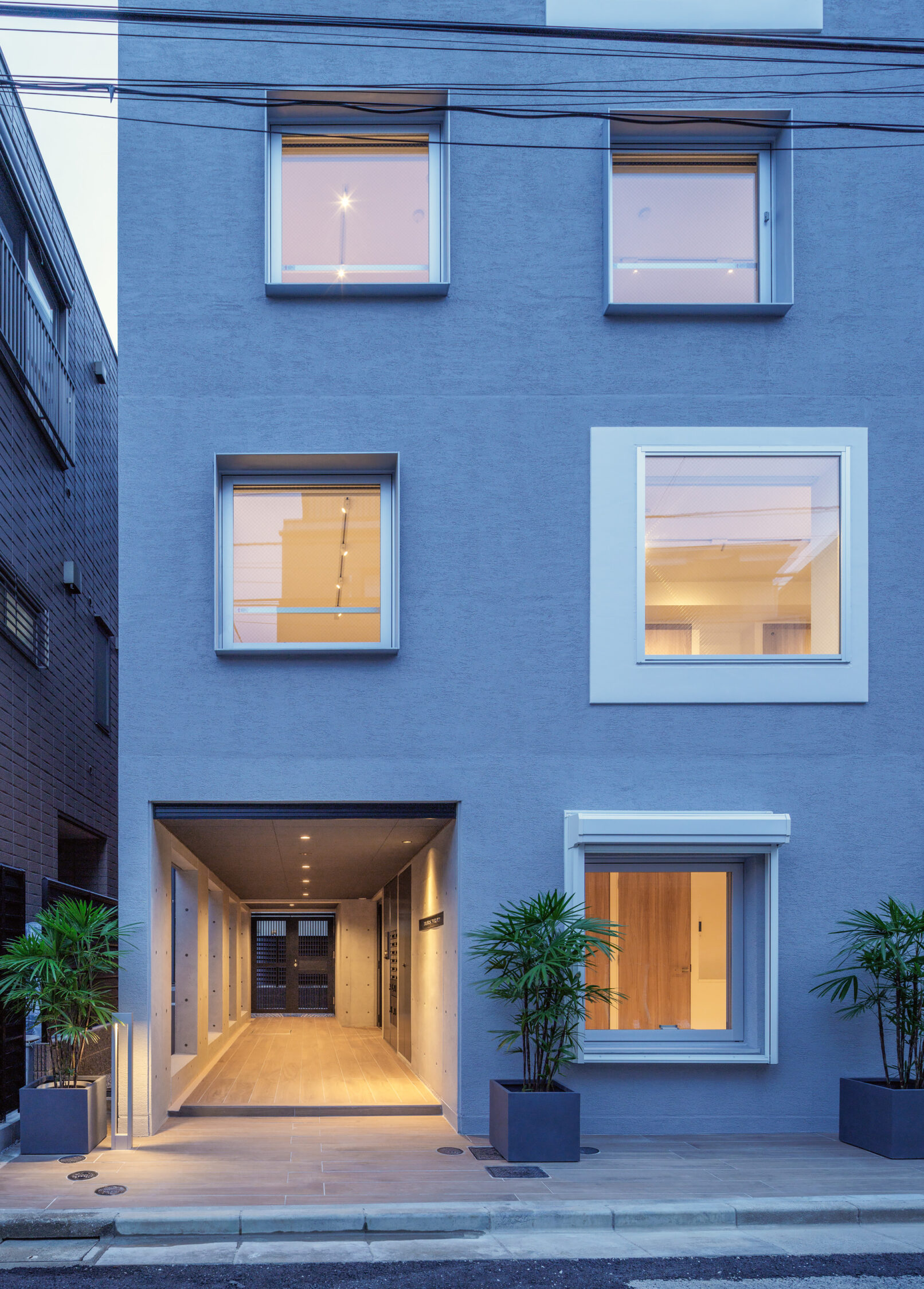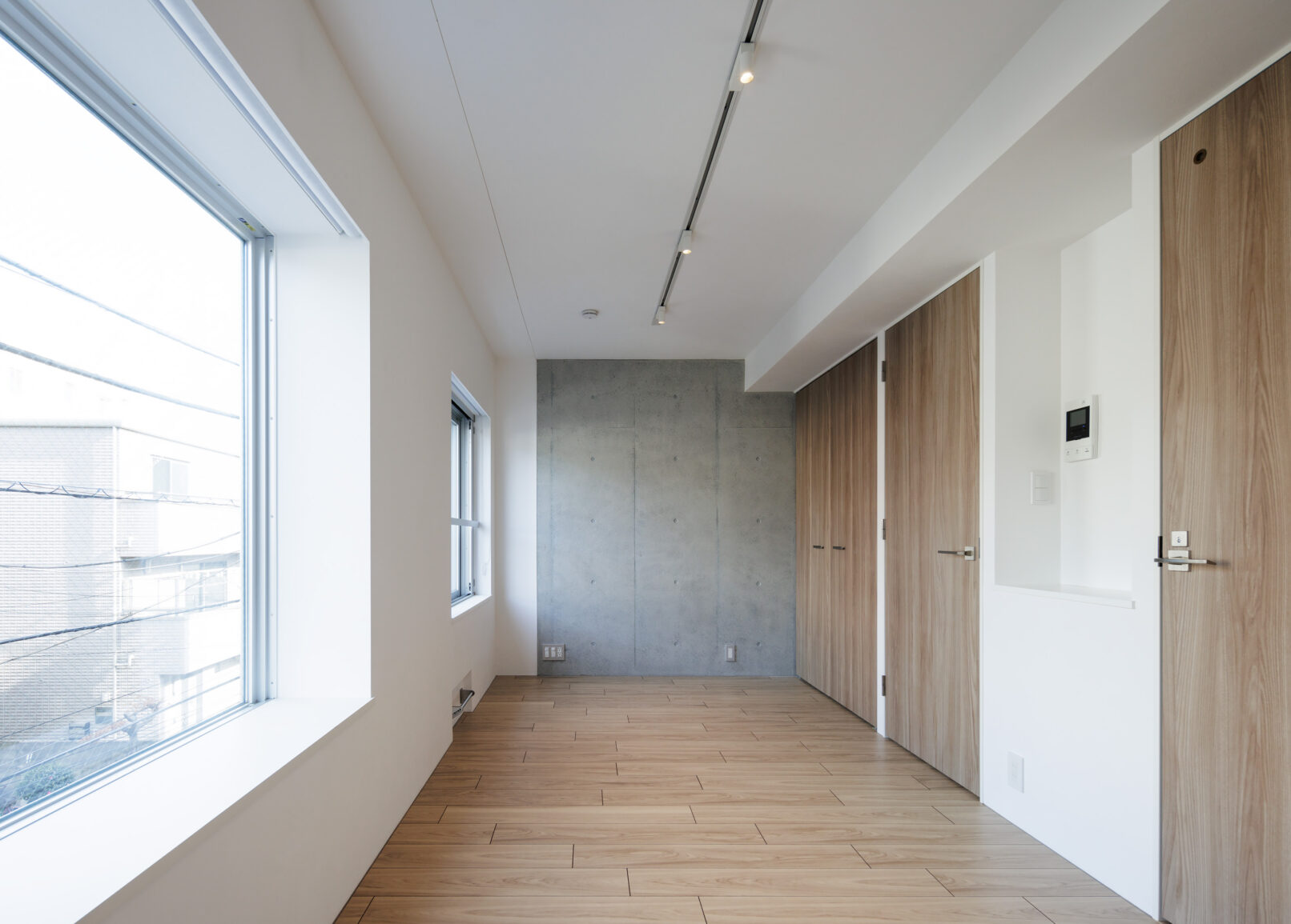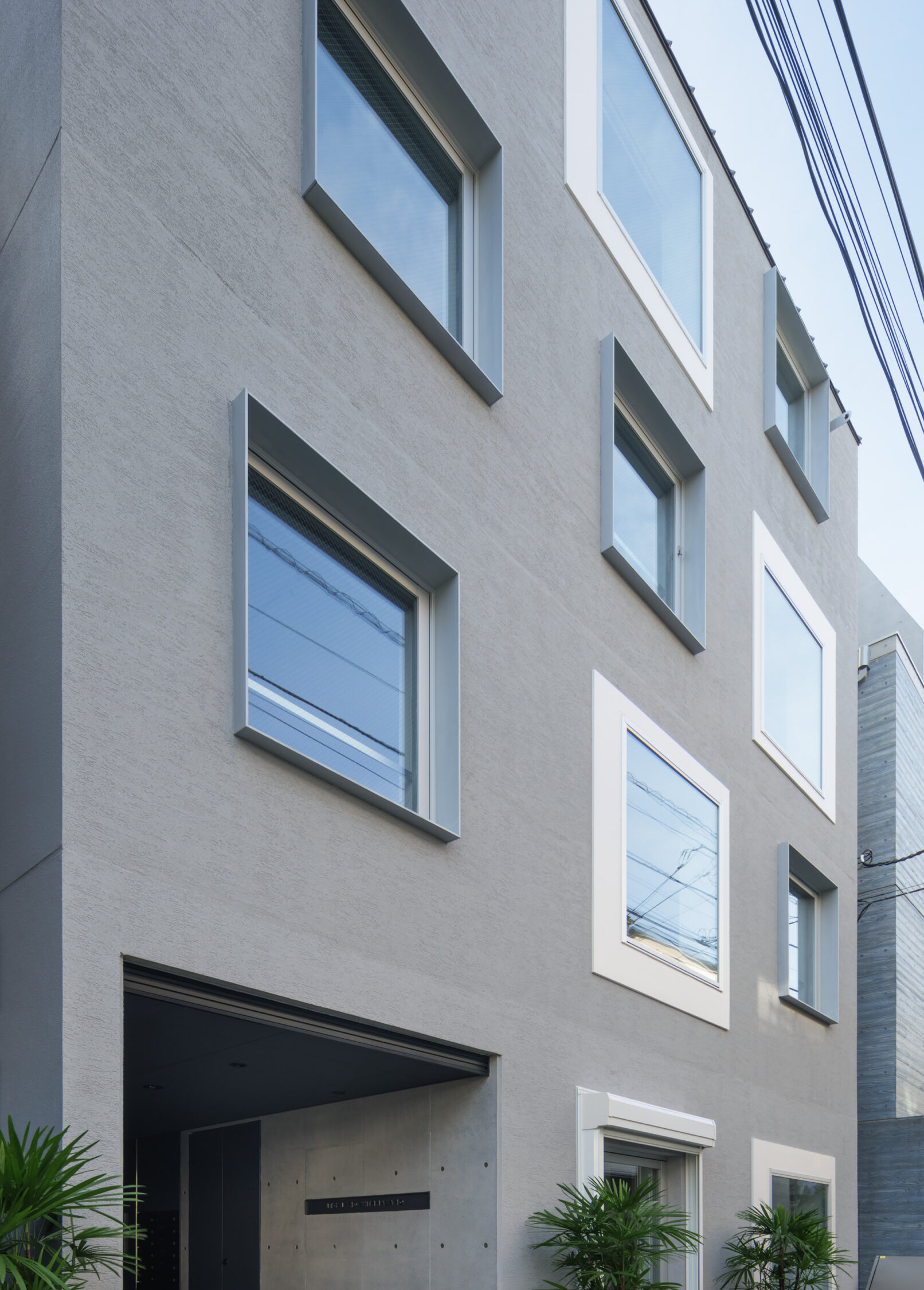 - 計画地は、サブカルな街として知られる中野駅周辺の賑わいが余韻に変わり、静けさが次第に色濃くなる住宅街に位置する。近隣の街並みに溶け込む建物をイメージして、「淡いモノトーンのカラーコード」を連想し、有機的な印象をもつジョリパットを外壁に採用した。また、大小の窓をリズムよく配置し、抑揚のある開口部の枠を突出させることで賑わいと静けさを表現した。