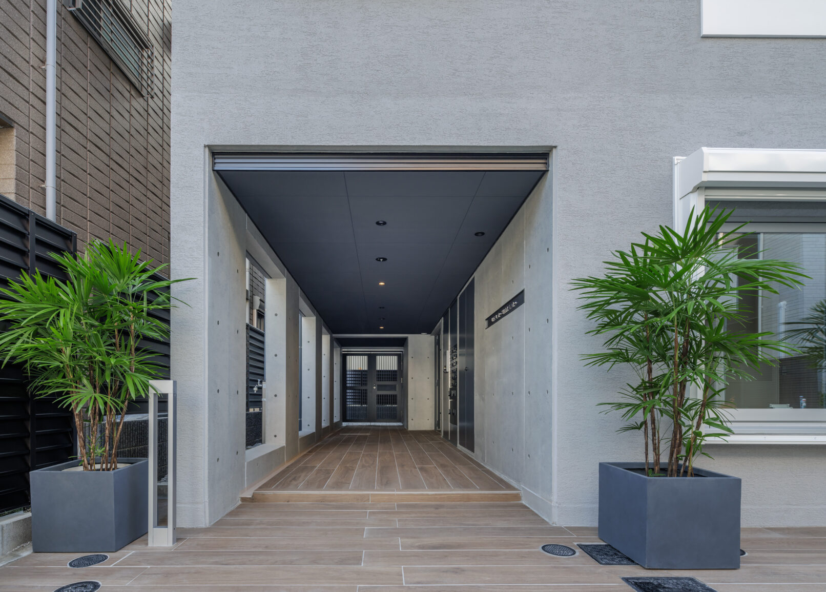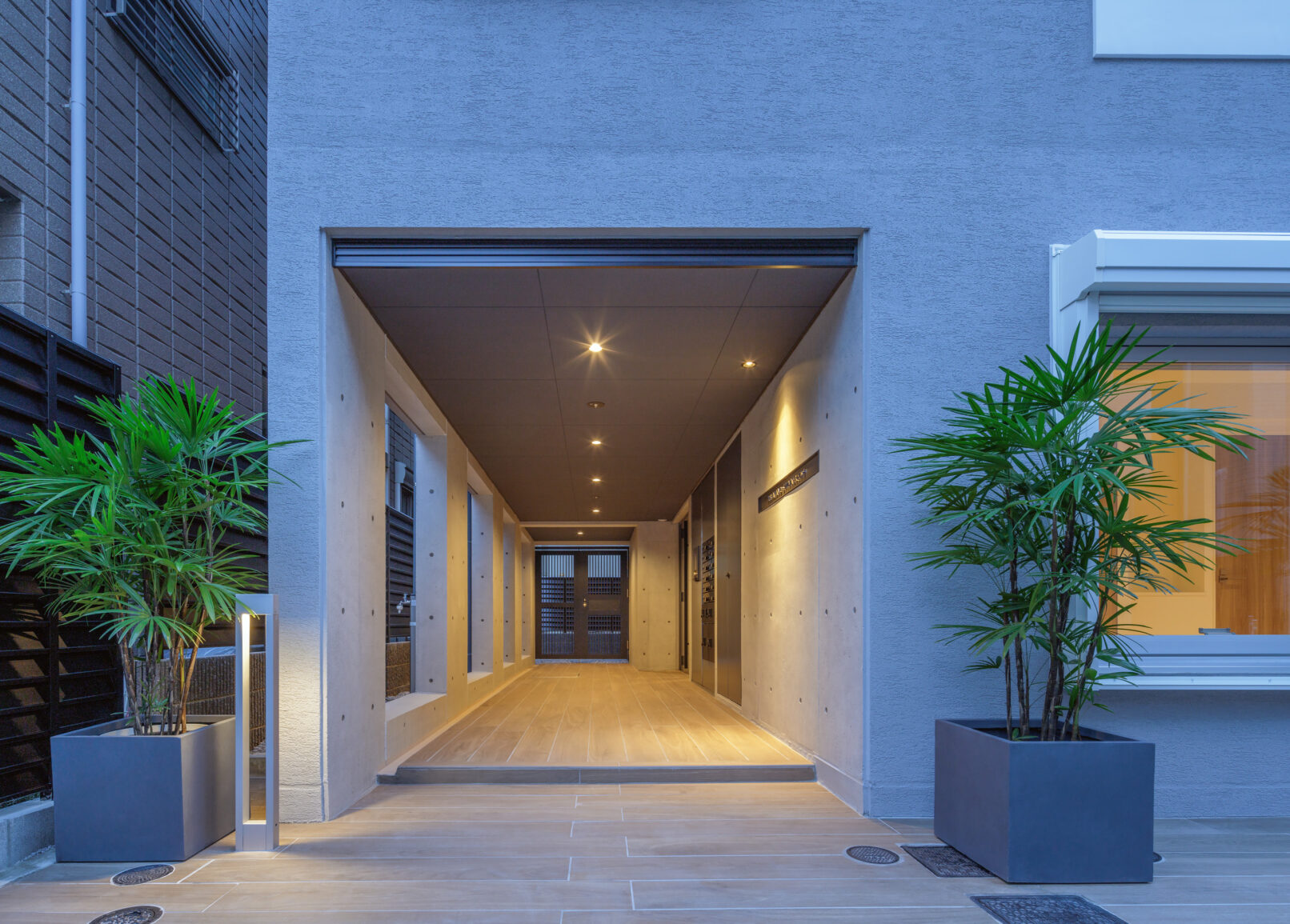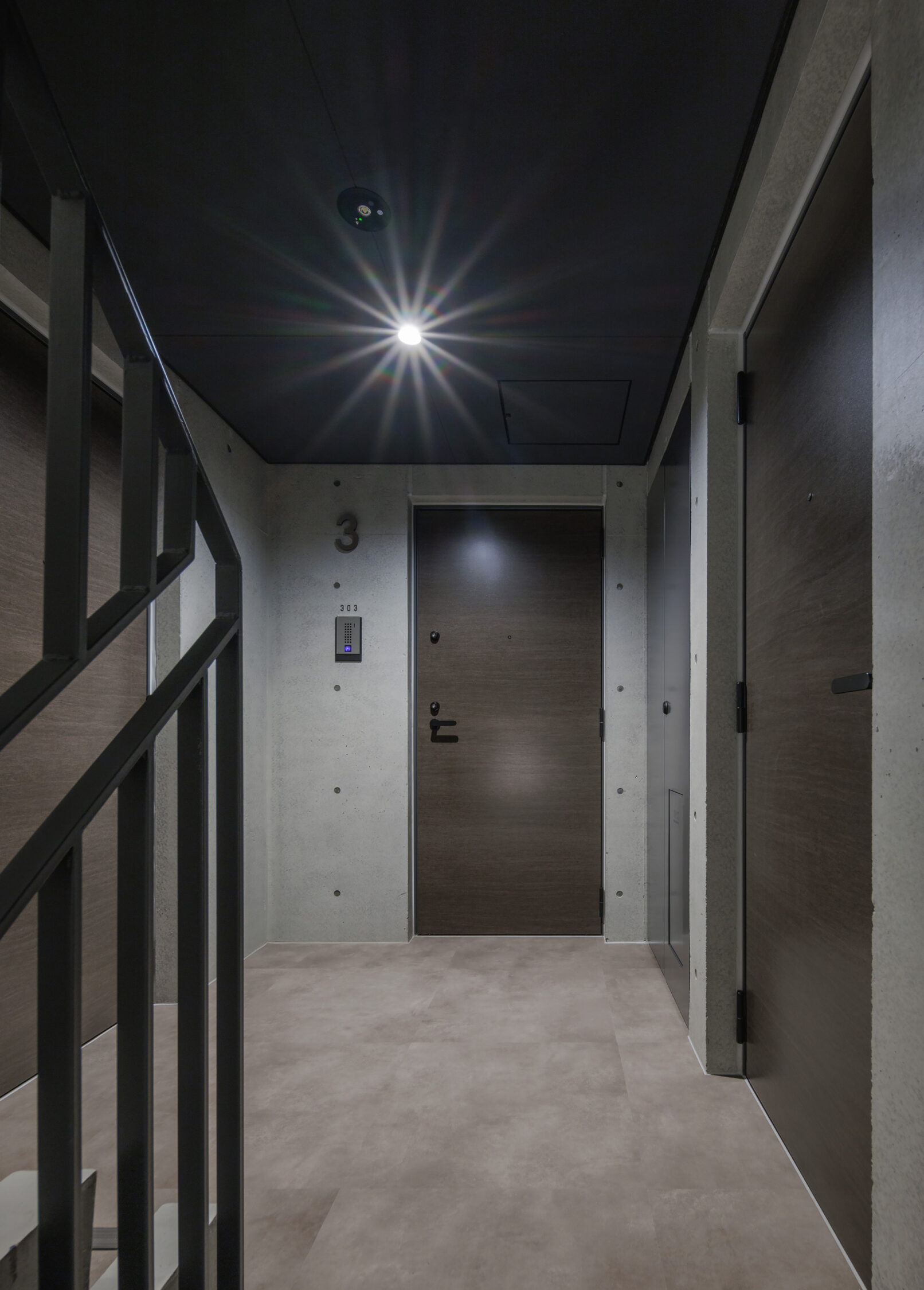 - 計画地は、サブカルな街として知られる中野駅周辺の賑わいが余韻に変わり、静けさが次第に色濃くなる住宅街に位置する。近隣の街並みに溶け込む建物をイメージして、「淡いモノトーンのカラーコード」を連想し、有機的な印象をもつジョリパットを外壁に採用した。また、大小の窓をリズムよく配置し、抑揚のある開口部の枠を突出させることで賑わいと静けさを表現した。