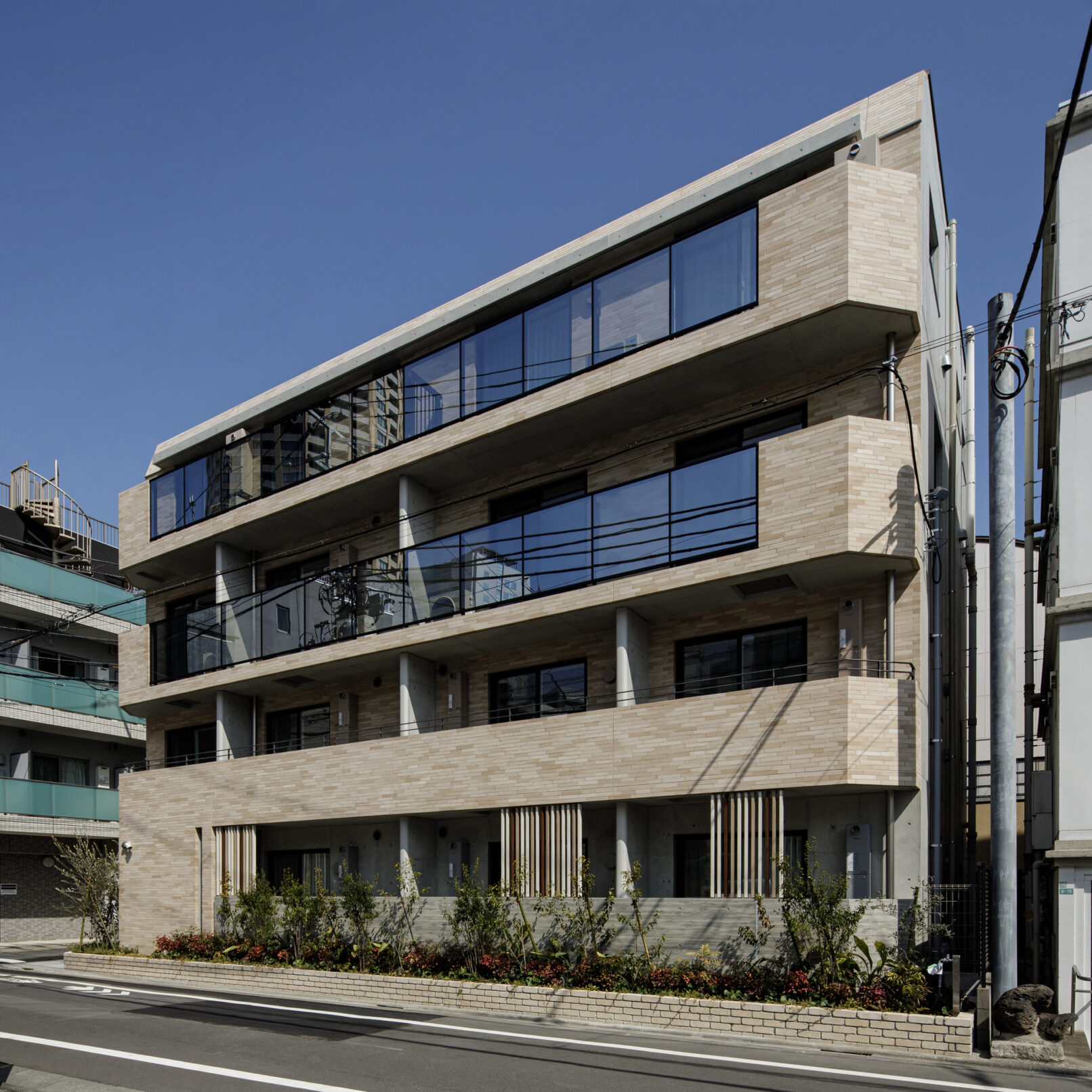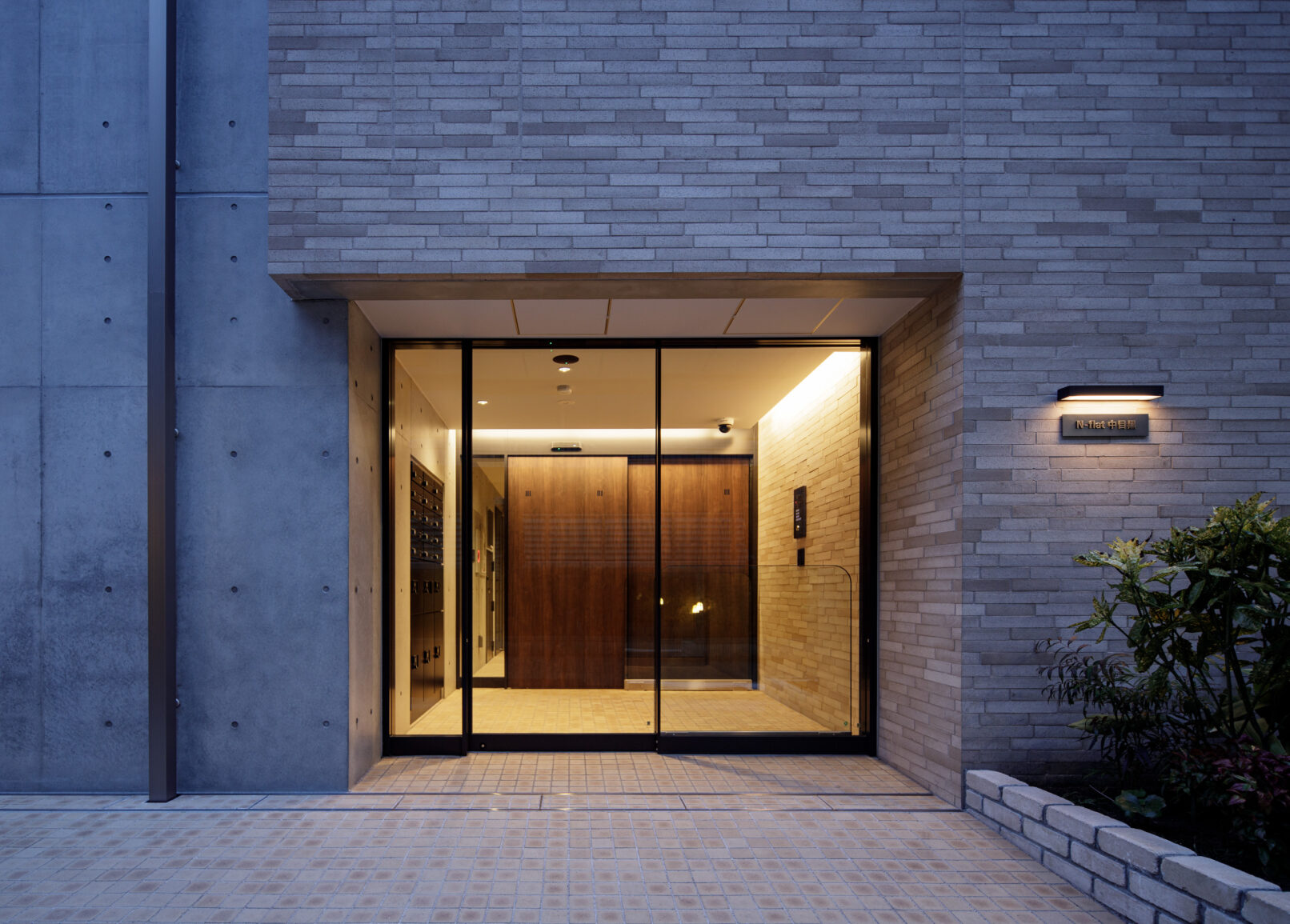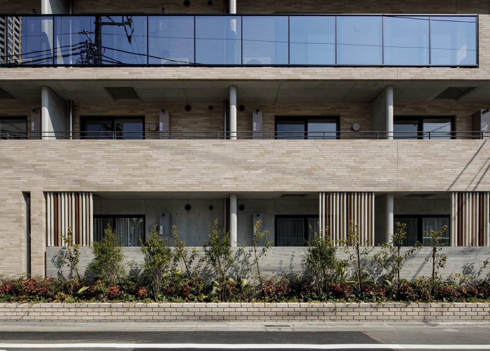- 共同住宅のバルコニーに設置される隔て板をあえてコンクリート打放しの壁として、ファサードデザインの要素として取り入れている。また、接道部は積極的に緑化を試みることで、外装タイルを引き立てると共に、1階住戸のプライバシー保護の役割も担っている。