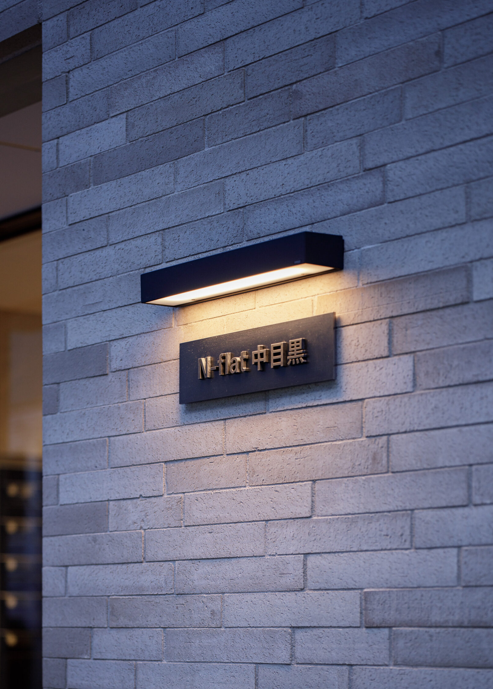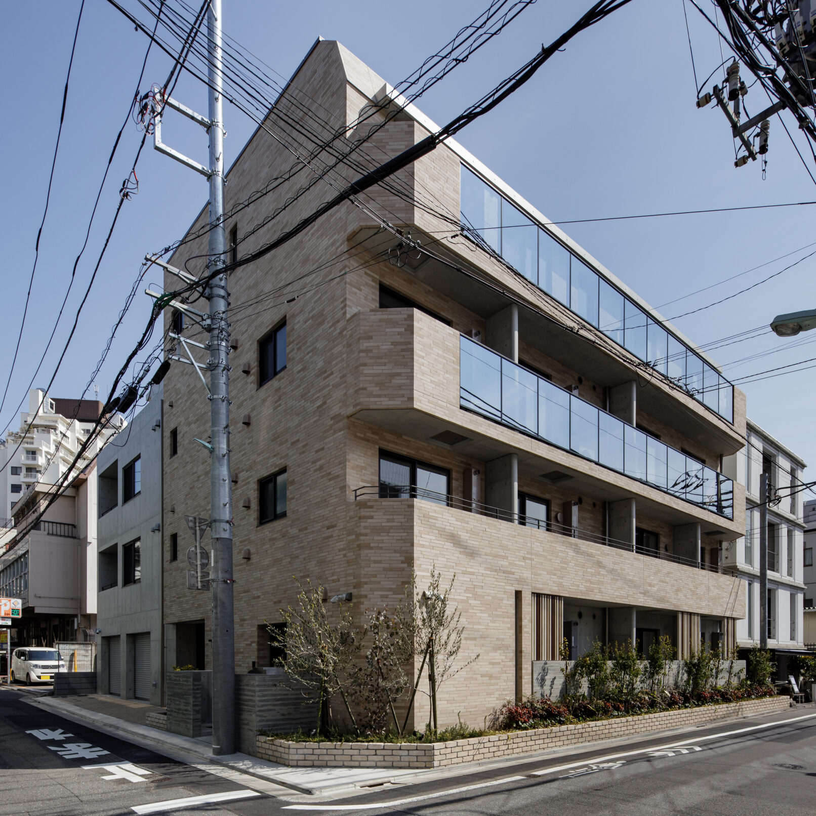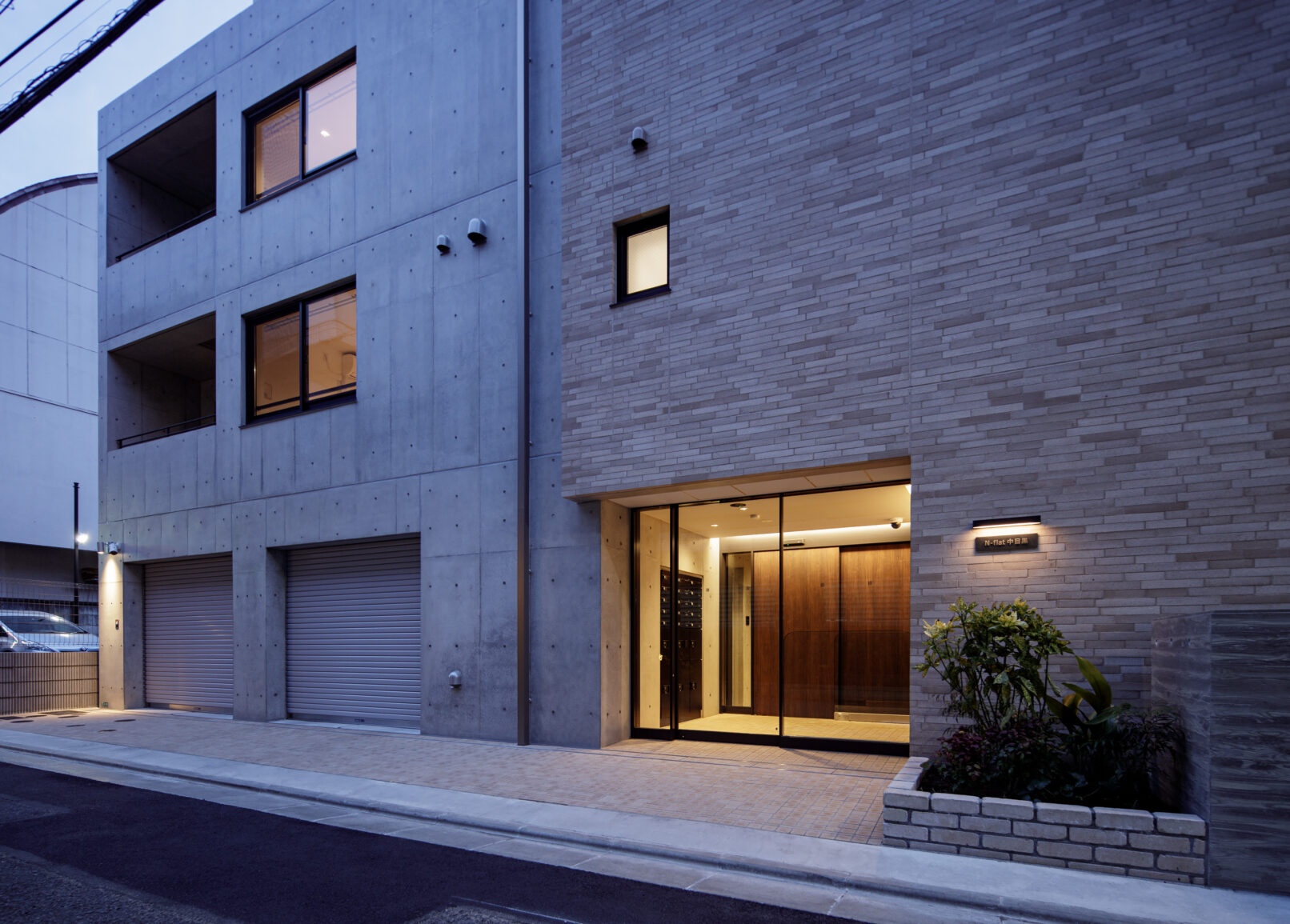 - 共同住宅のバルコニーに設置される隔て板をあえてコンクリート打放しの壁として、ファサードデザインの要素として取り入れている。また、接道部は積極的に緑化を試みることで、外装タイルを引き立てると共に、1階住戸のプライバシー保護の役割も担っている。