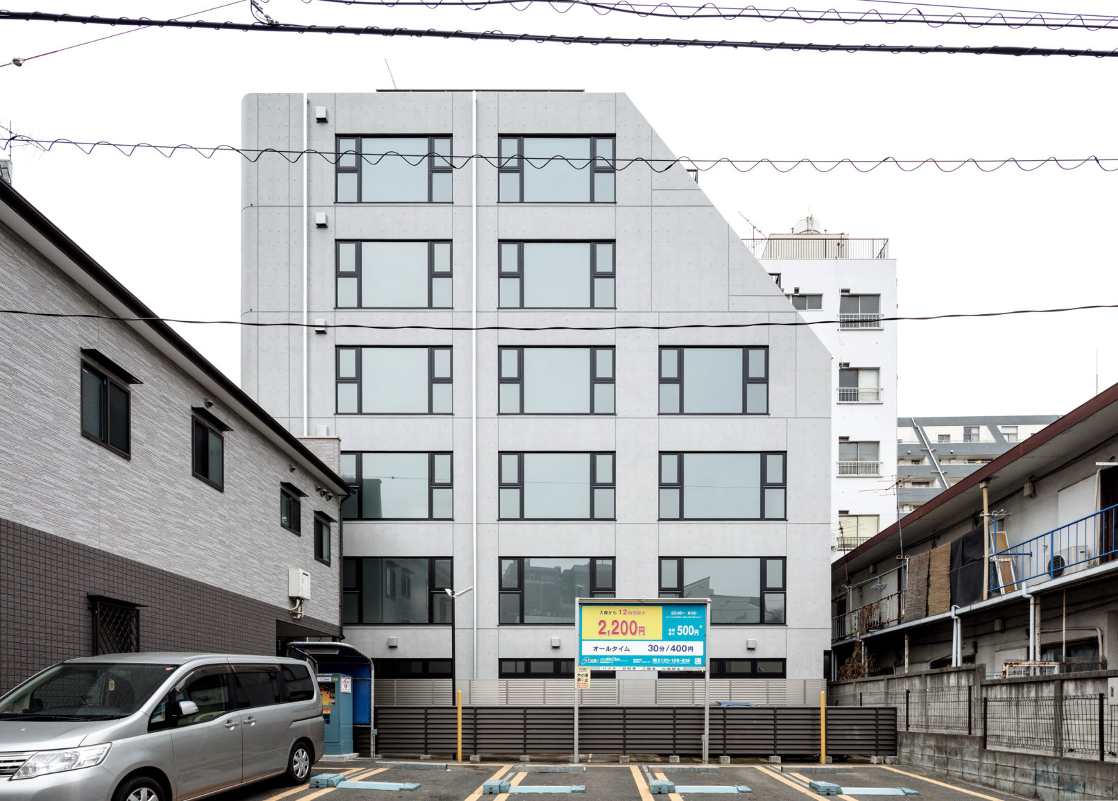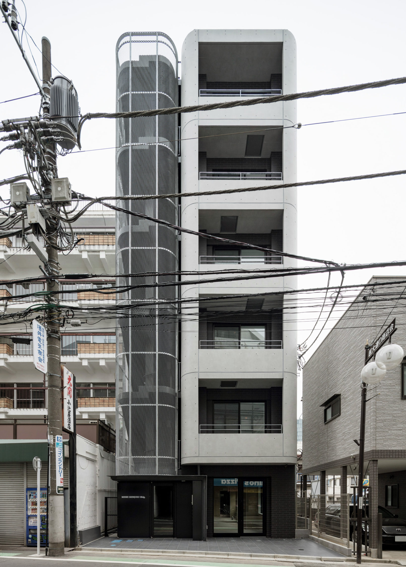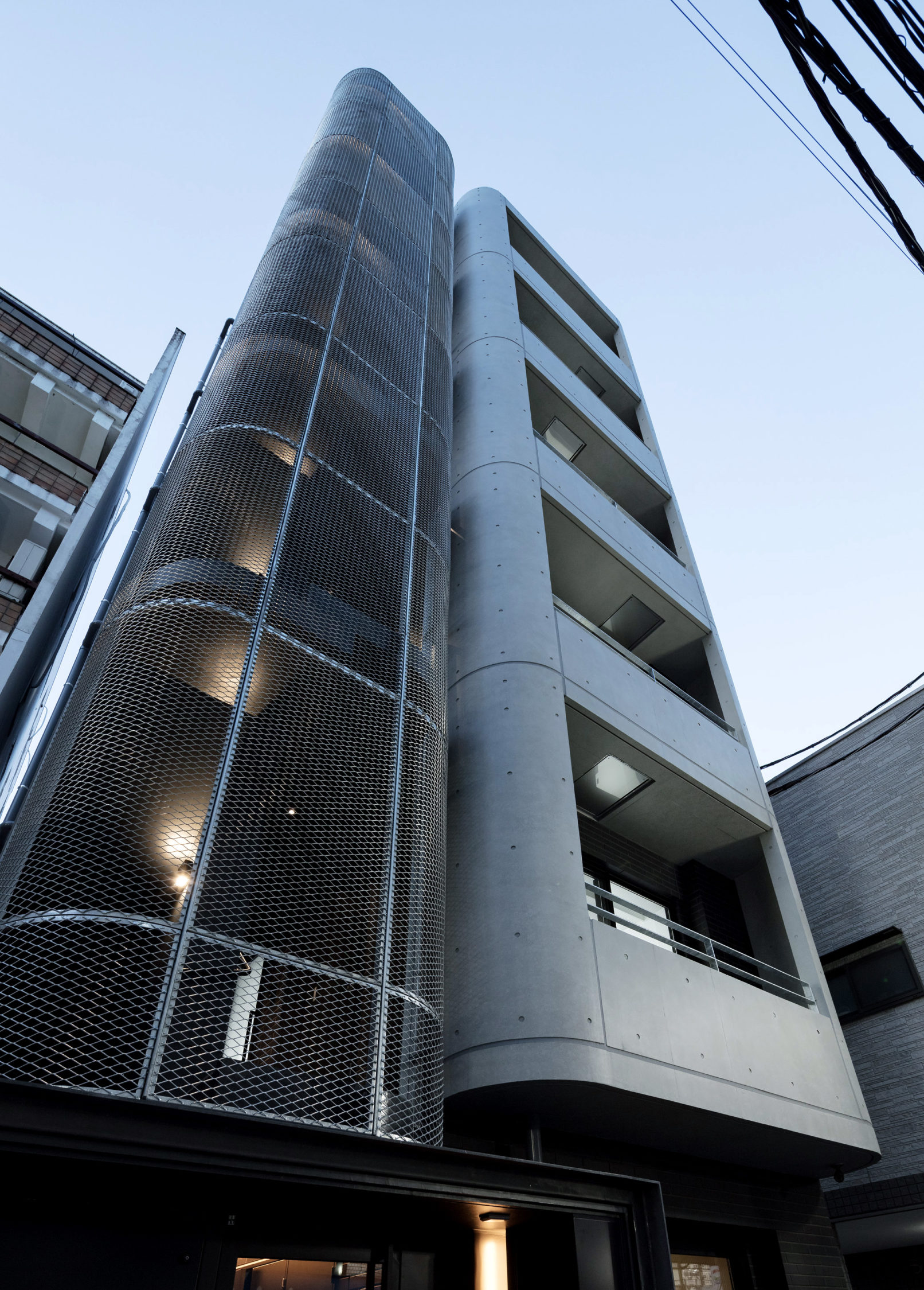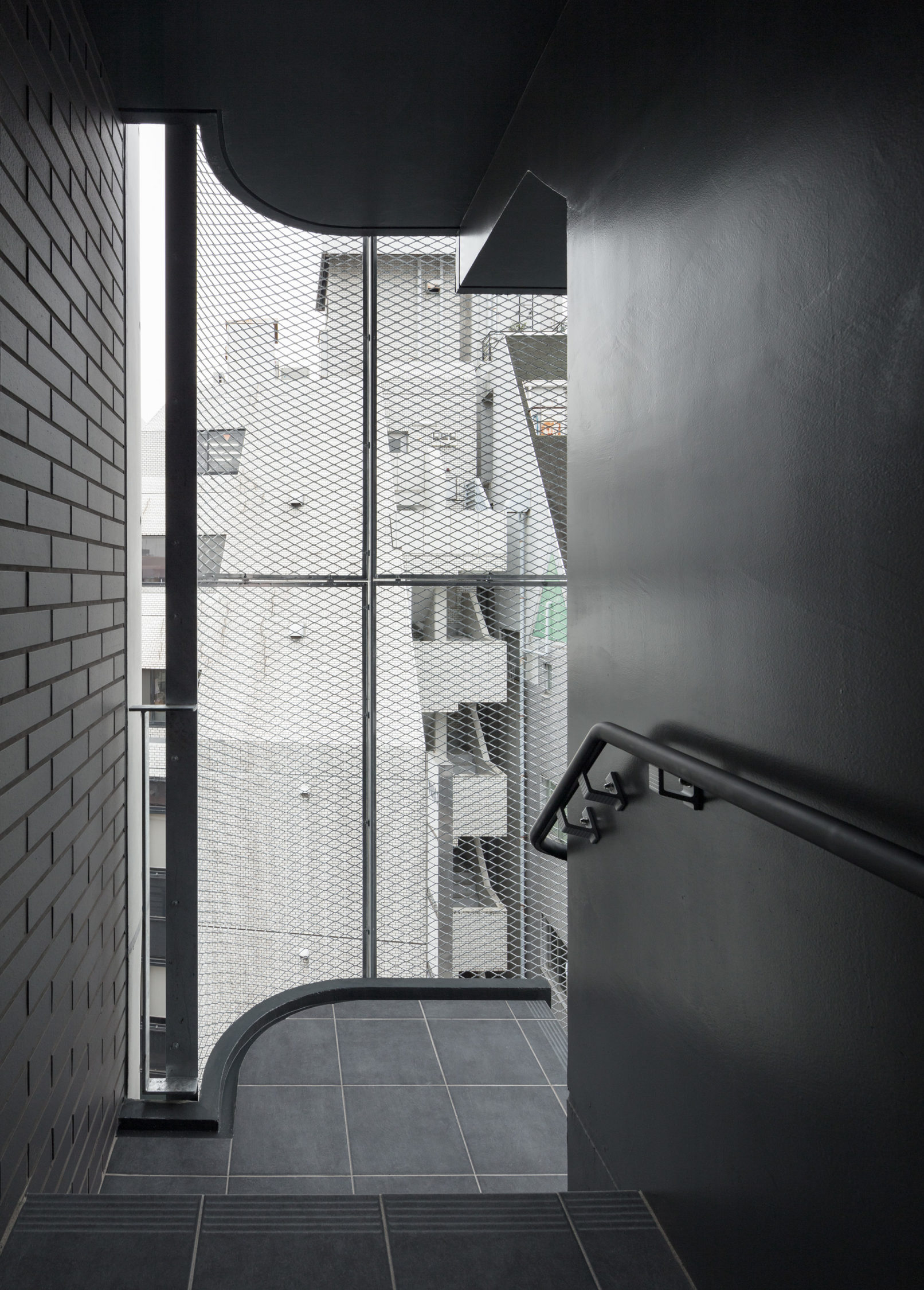 - ファサードは、コンクリート打ち放し仕上げを用い、屋外避難階段は採光・通風を確保させるためにエキスパンドメタルで纏われている。エキスパンドメタルとコンクリート打ち放しの外壁はRを描いており、周辺の画一的街並みに対して変化を与えている。エキスパンドメタルという素材は、鉄という物理的堅さを持ち合わせているものの、その透過性からレースのような柔らかな印象を与えてくれる。